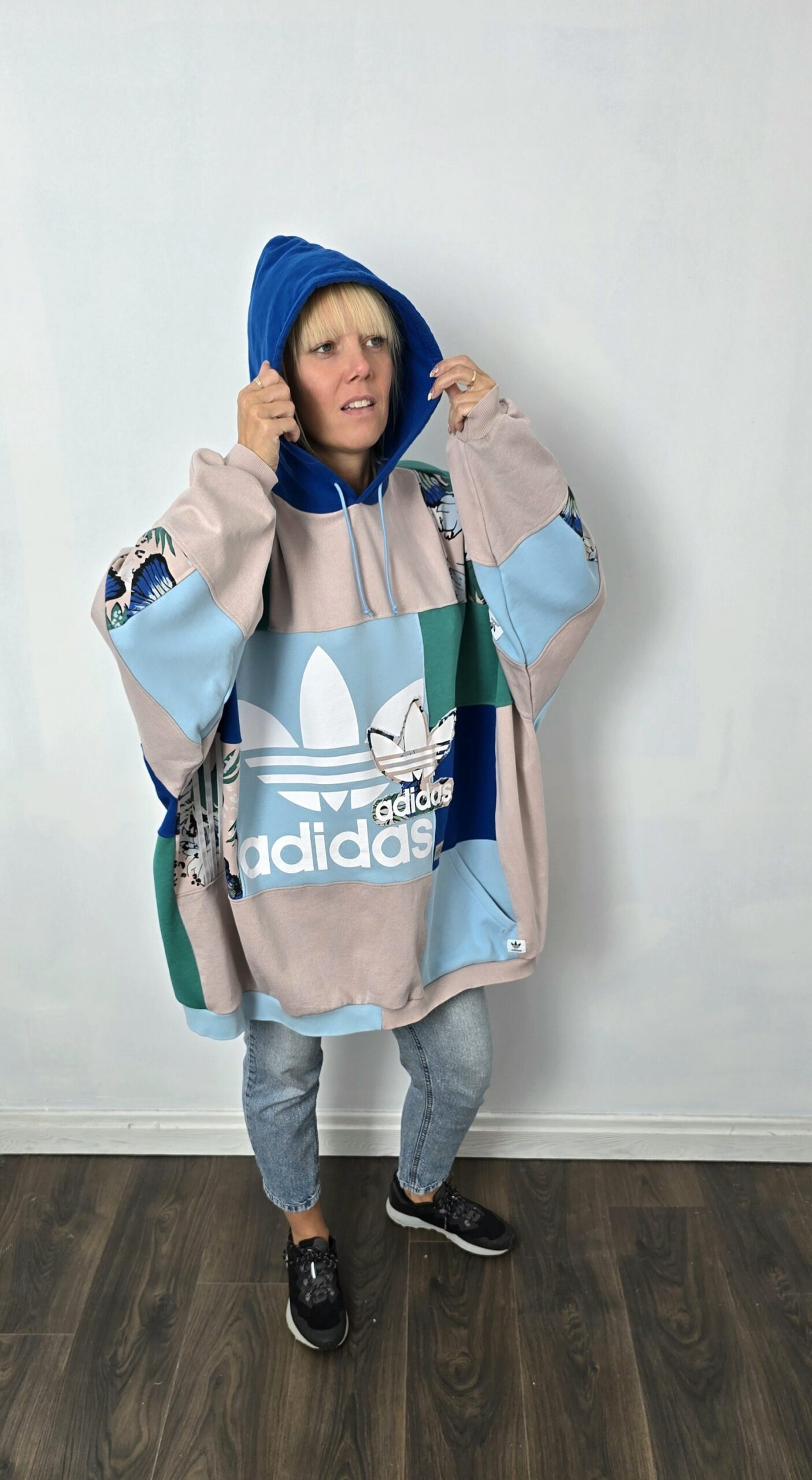 Dla tych, którzy lubią wyróżniać się w tłumie – bluza patchworkowa, z charakterem, uszyta z odzyskanych materiałów. Powstała z pięciu różnych bluz, które dostały drugie życie, a razem tworzą wyjątkową całość w stylu patchwork. Głównym akcentem bluzy są nachodzące na siebie loga marki “Adidas”, kwiecisty print oraz oczywiście trzy paski. Bluza jest wyjątkowa, drugiej takiej nie będzie.