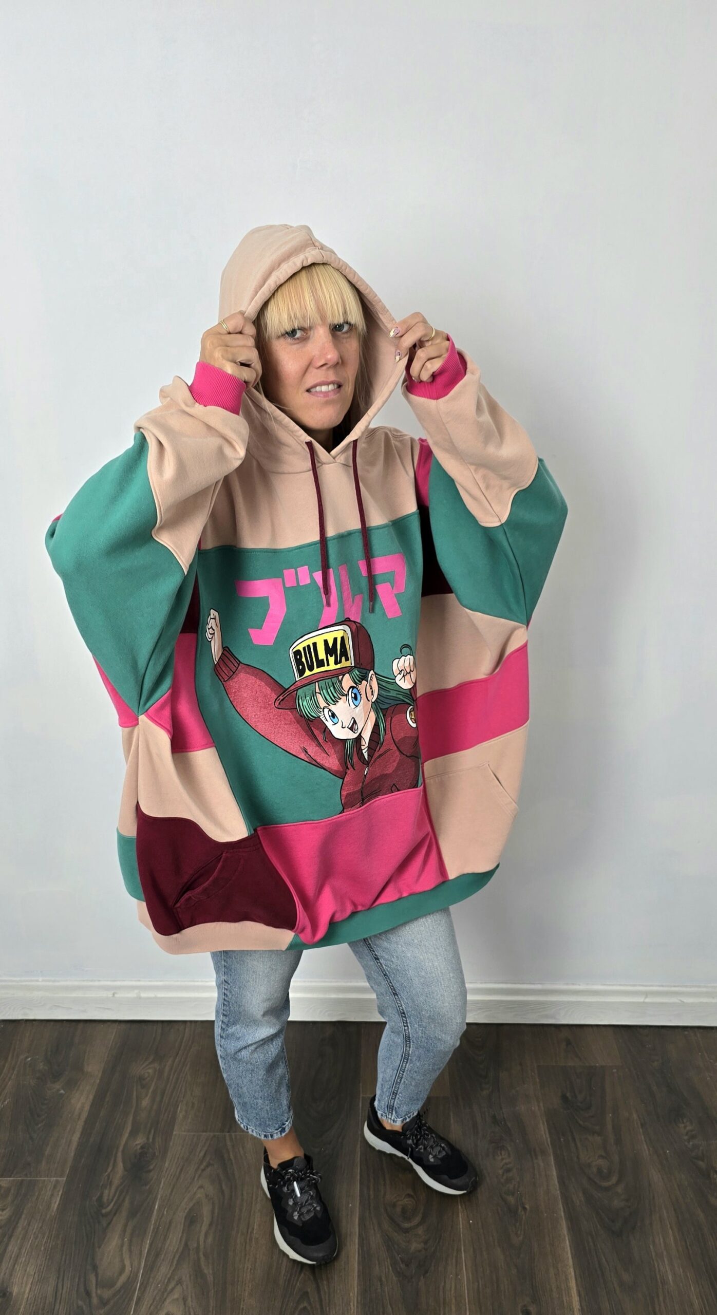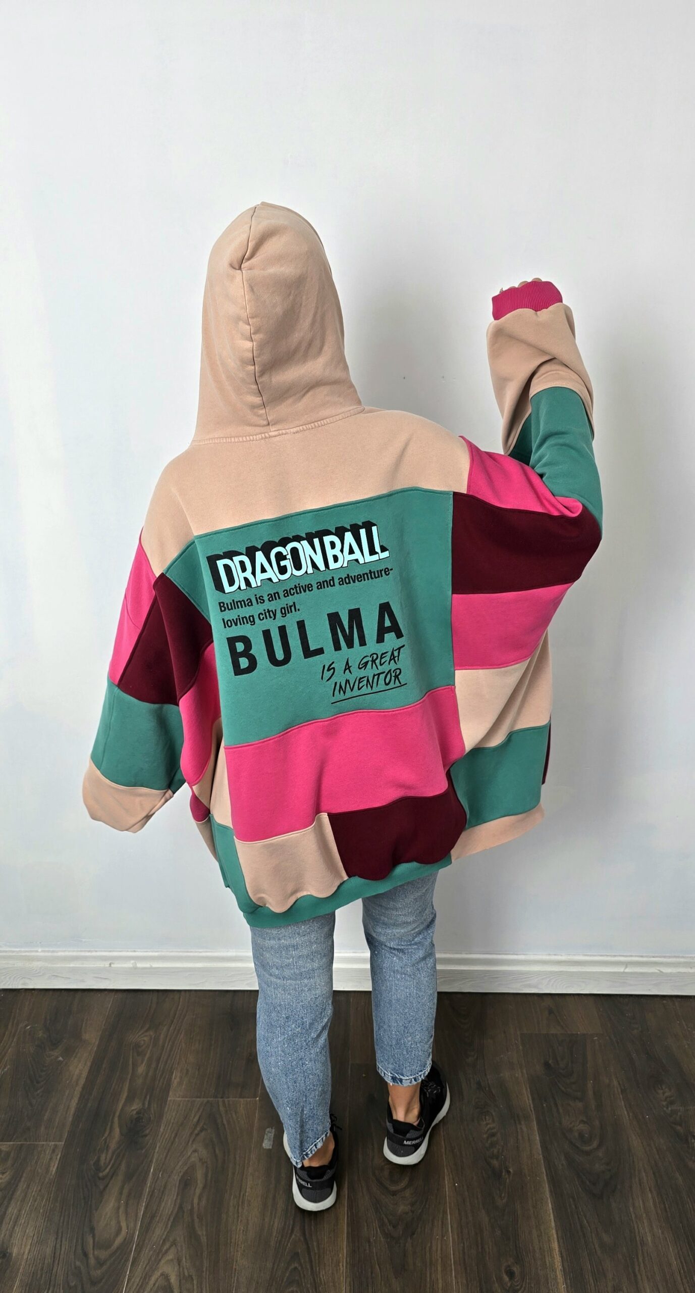 Dla tych, którzy z uśmiechem wspominają, jak po szkole pędzili przed telewizor, aby nie przegapić kolejnego odcinka Dragon Ball. Dla tych, którzy chcą złożyć hołd żonie prawdziwego księcia Sayan i chcą się wyróżniać w tłumie – bluza patchworkowa, uszyta z odzyskanych materiałów. Powstała z czterech różnych bluz, które dostały drugie życie, a razem tworzą wyjątkową całość w stylu patchwork. Głównym akcentem bluzy są dwa nadruki z przodu Bulma z tyłu napis “Great inventor”