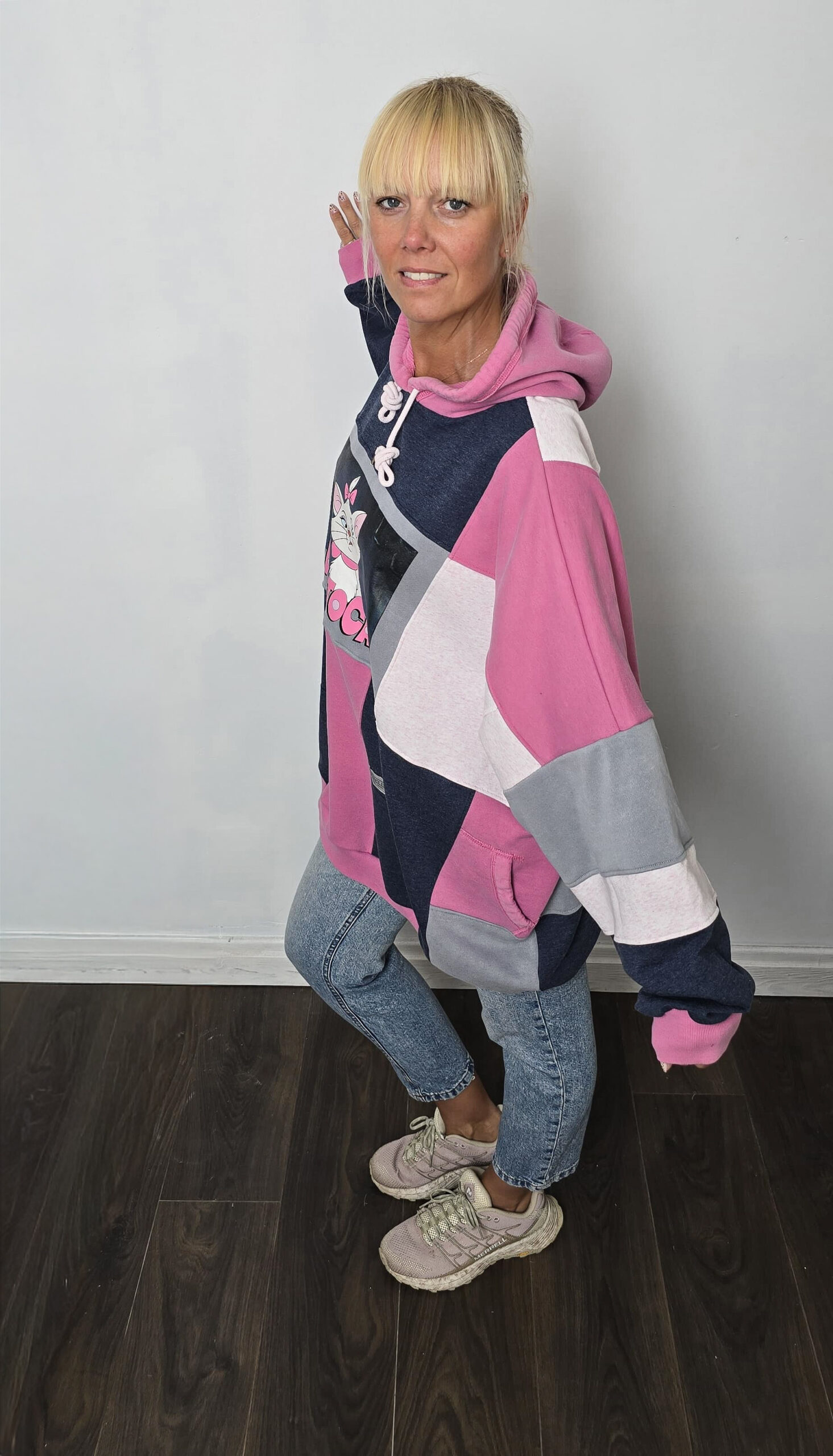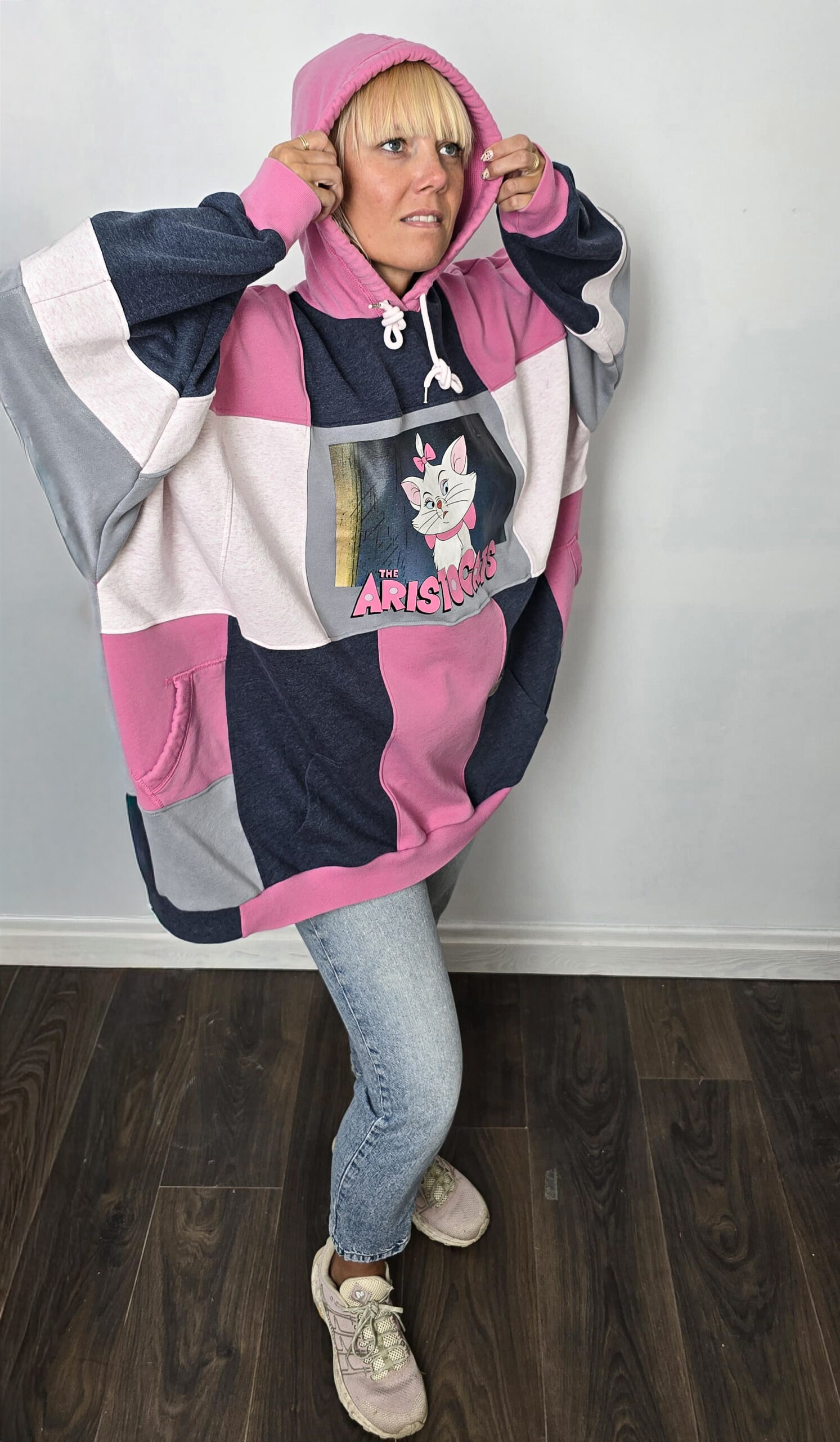 Moda bez kompromisów: wygodna, wyrazista i w 100% unikatowa. Bluza uszyta ręcznie z czterech bluz. Za sprawą kreatywności i świetnego projektu została stworzona wyjątkowa całość w stylu patchwork. Głównym akcentem bluzy jest kolorowy nadruk z kotem z bajki “The Aristocat”. Całość uzupełniają precyzyjnie dobrane kolory materiałów z innych bluz.