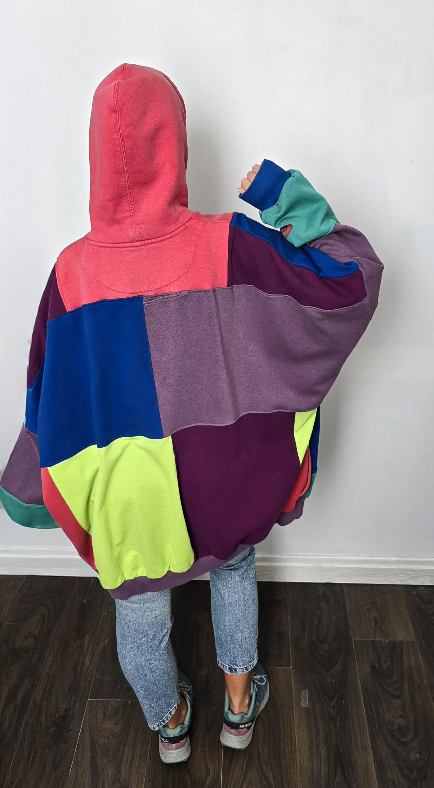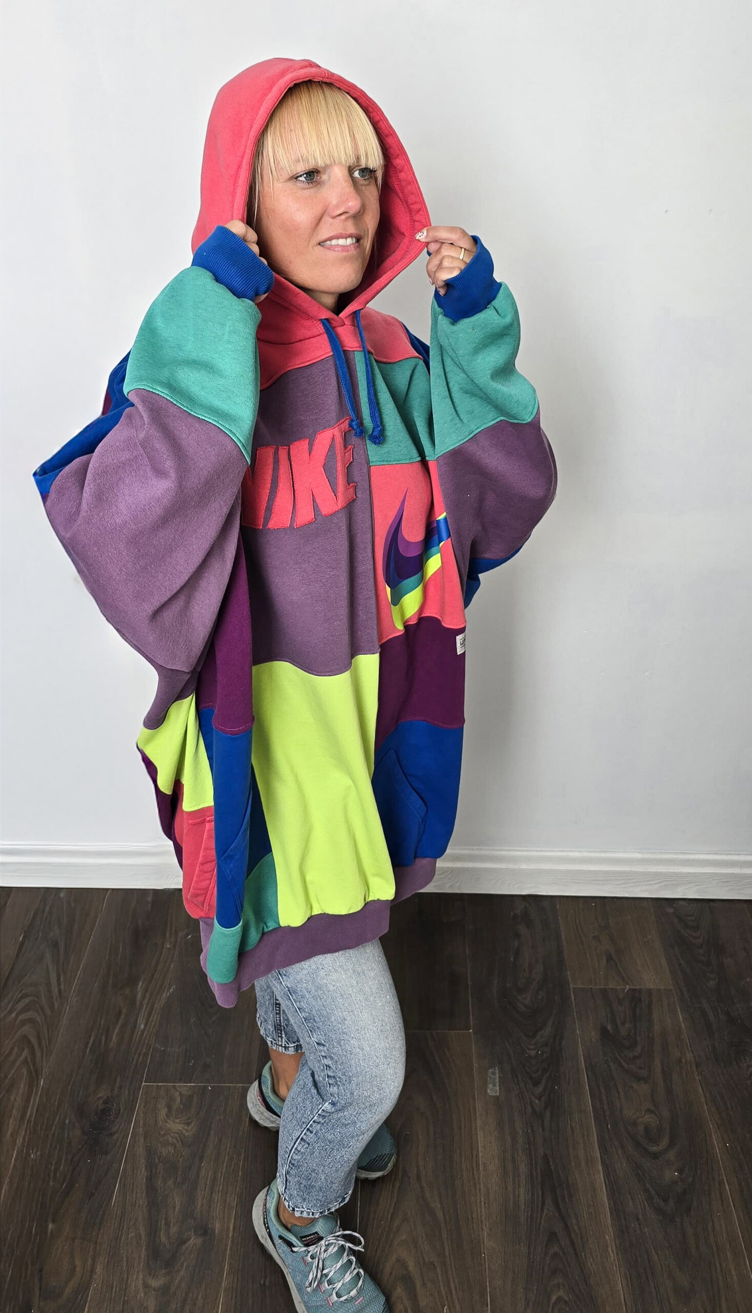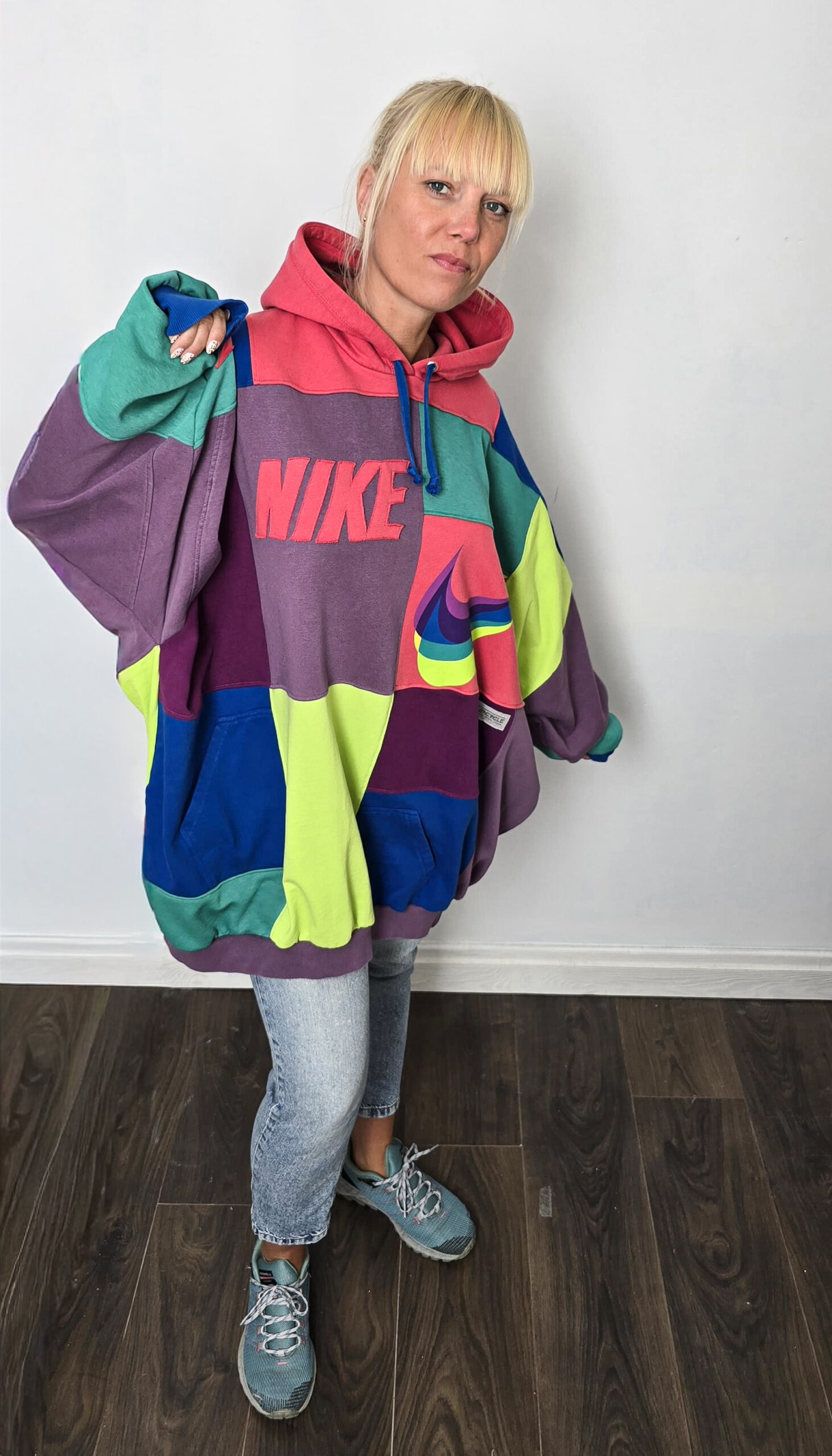 Dla tych, którzy lubią wyróżniać się w tłumie – bluza patchworkowa, pełna energii i charakteru, uszyta z odzyskanych materiałów. Powstała z sześciu różnych bluz, które dostały drugie życie, a razem tworzą wyjątkową całość w stylu patchwork. Głównym akcentem bluzy jest kolorowy nadruk znaczka nike. Bluzę uzupełnia własnoręcznie stworzony napis “NIKE”. Bluza długo czekała na swoją realizację, ponieważ aż siedem miesięcy były szukane do niej bluzy, które idealnie pasują do kolorowego znaczka, który jest naprawdę wyjątkowy i przyciągający wzrok.