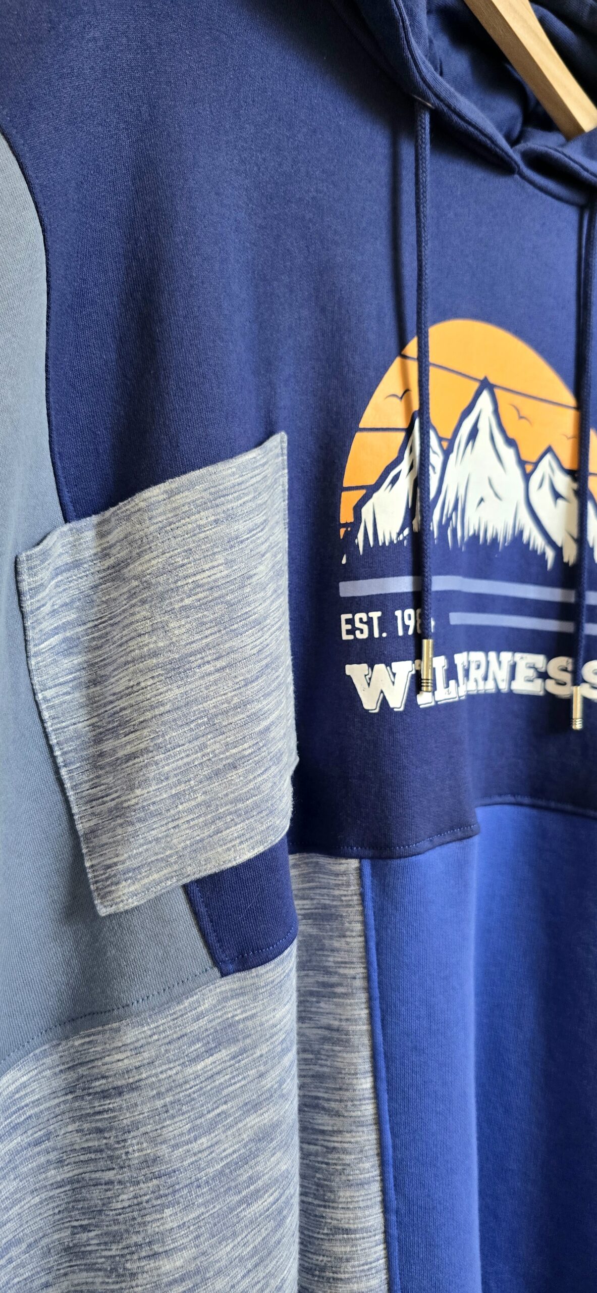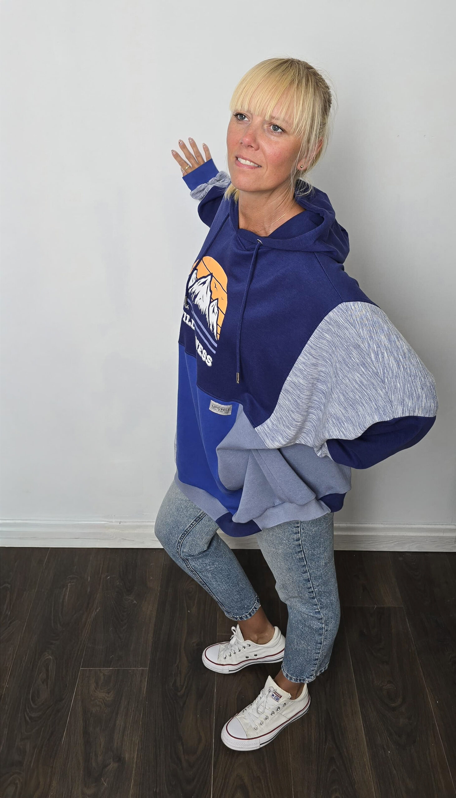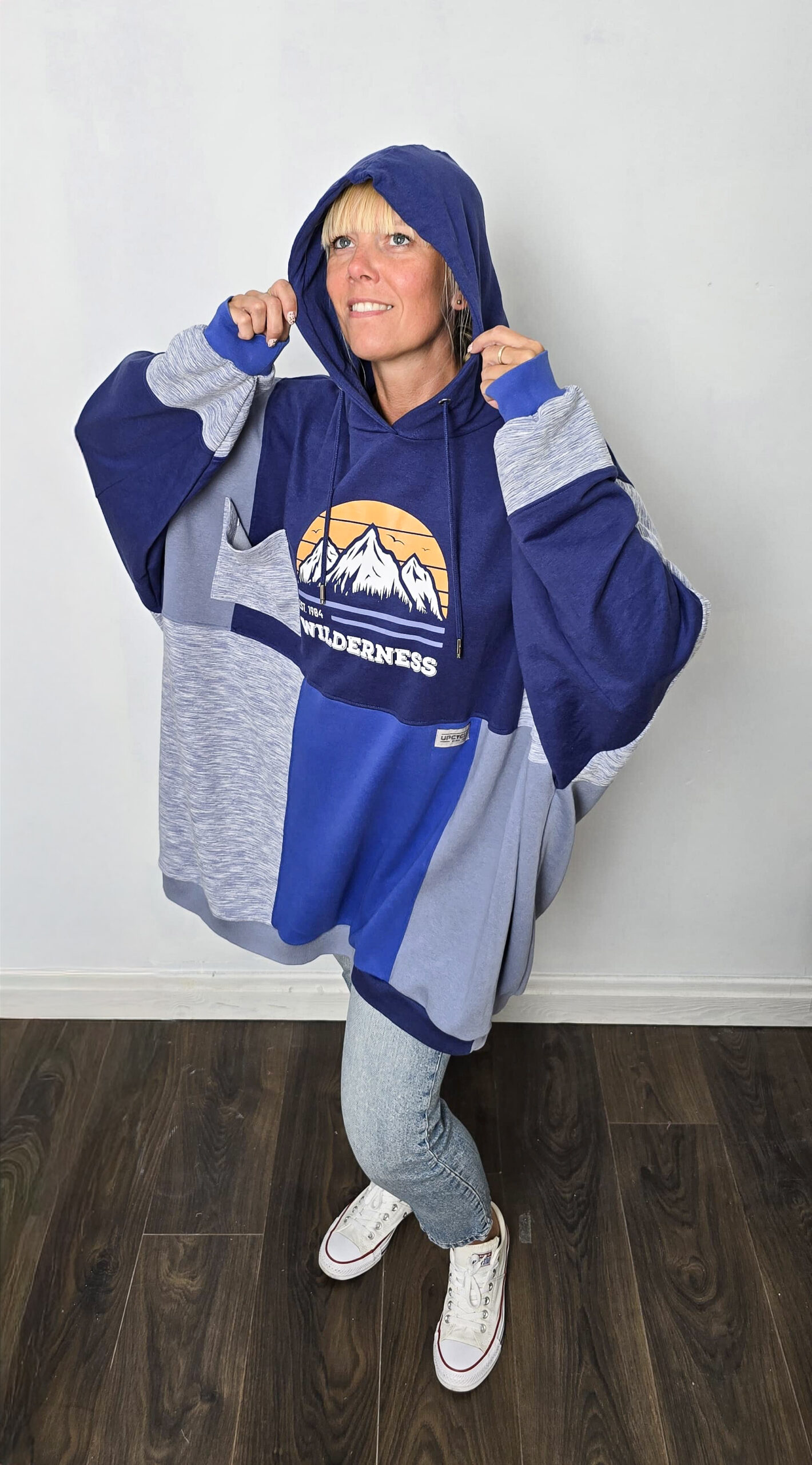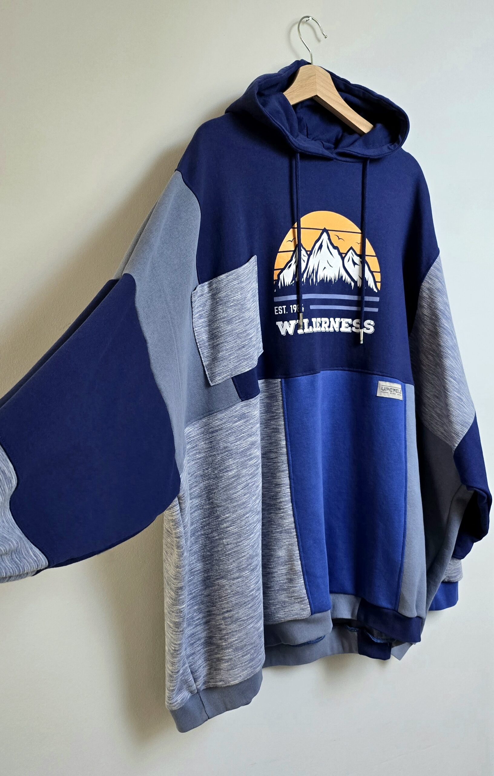 Bluza, która łączy wygodę z ideą świadomej mody – ręcznie tworzona, obszerna i pełna niebieskich odcieni. Powstała z czterech różnych bluz, które dostały drugie życie, a razem tworzą wyjątkową całość w stylu patchwork. Głównym akcentem bluzy jest nadruk gór na pomarańczowych zachodzie słońca, który przyciąga wzrok.