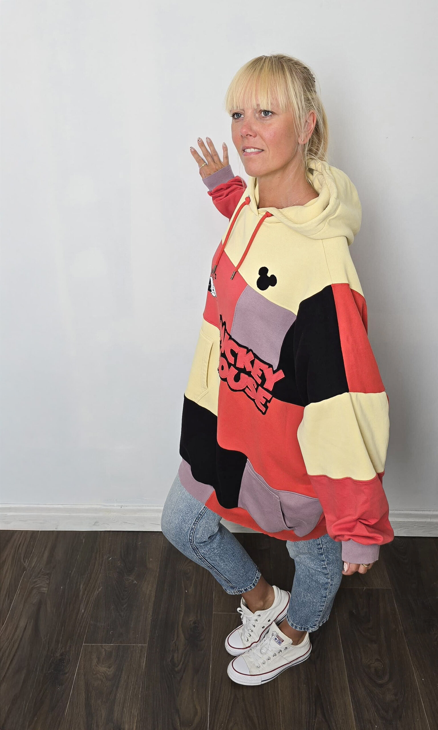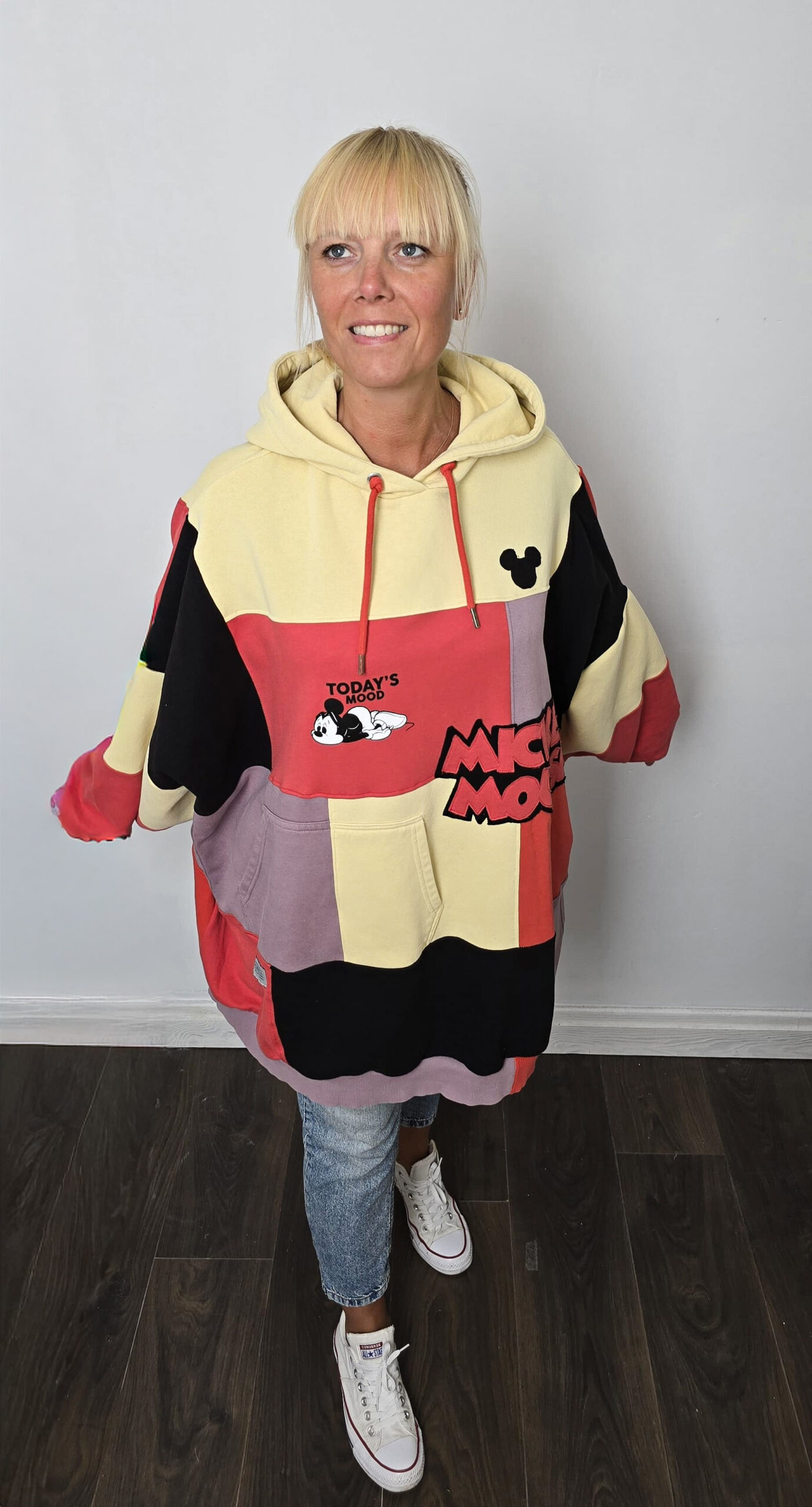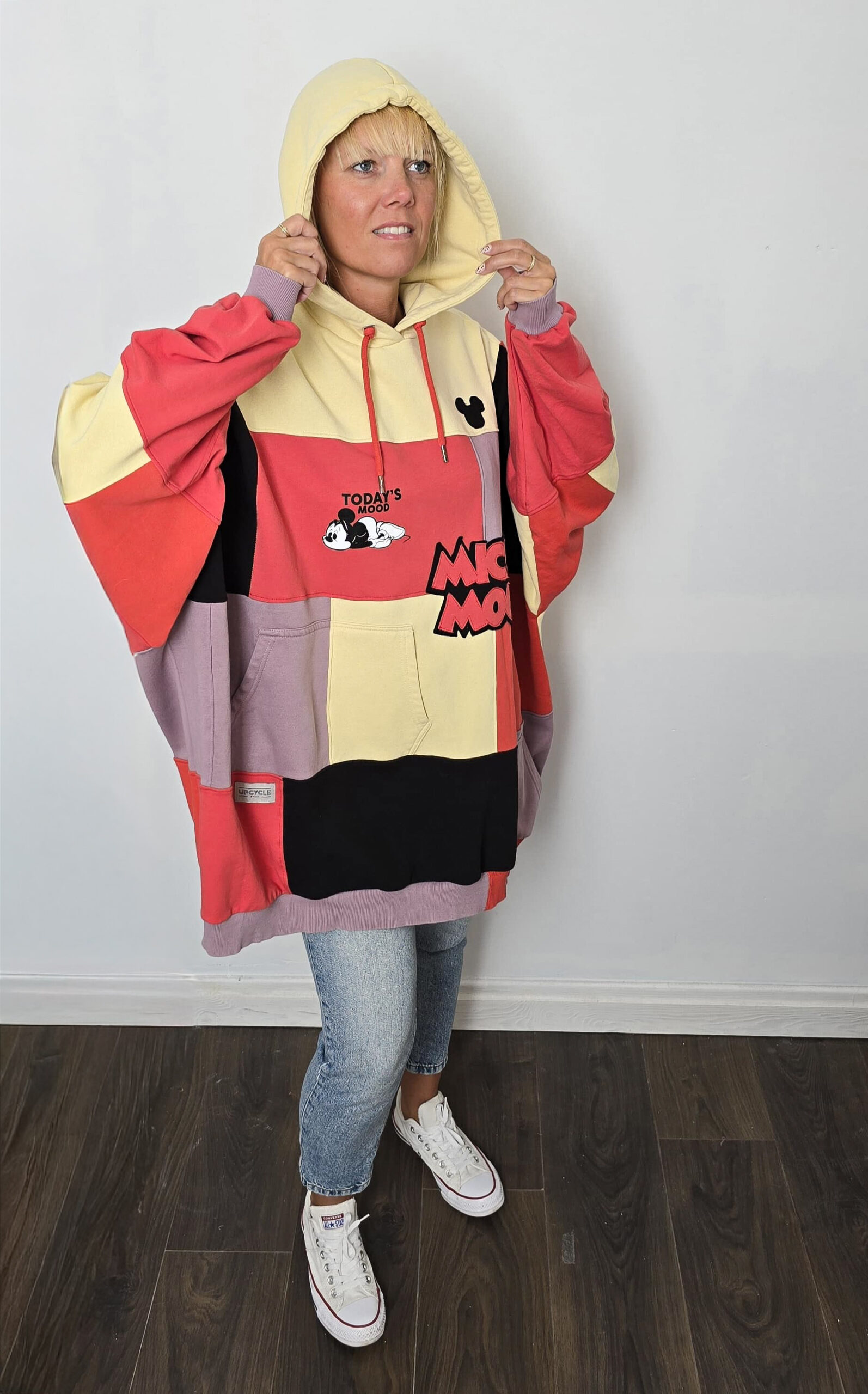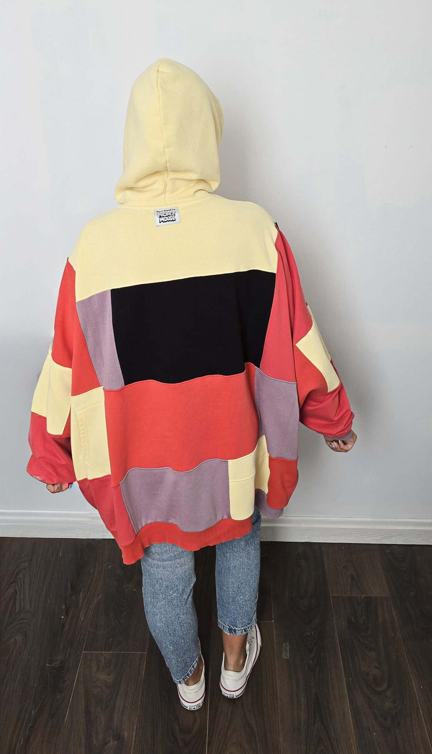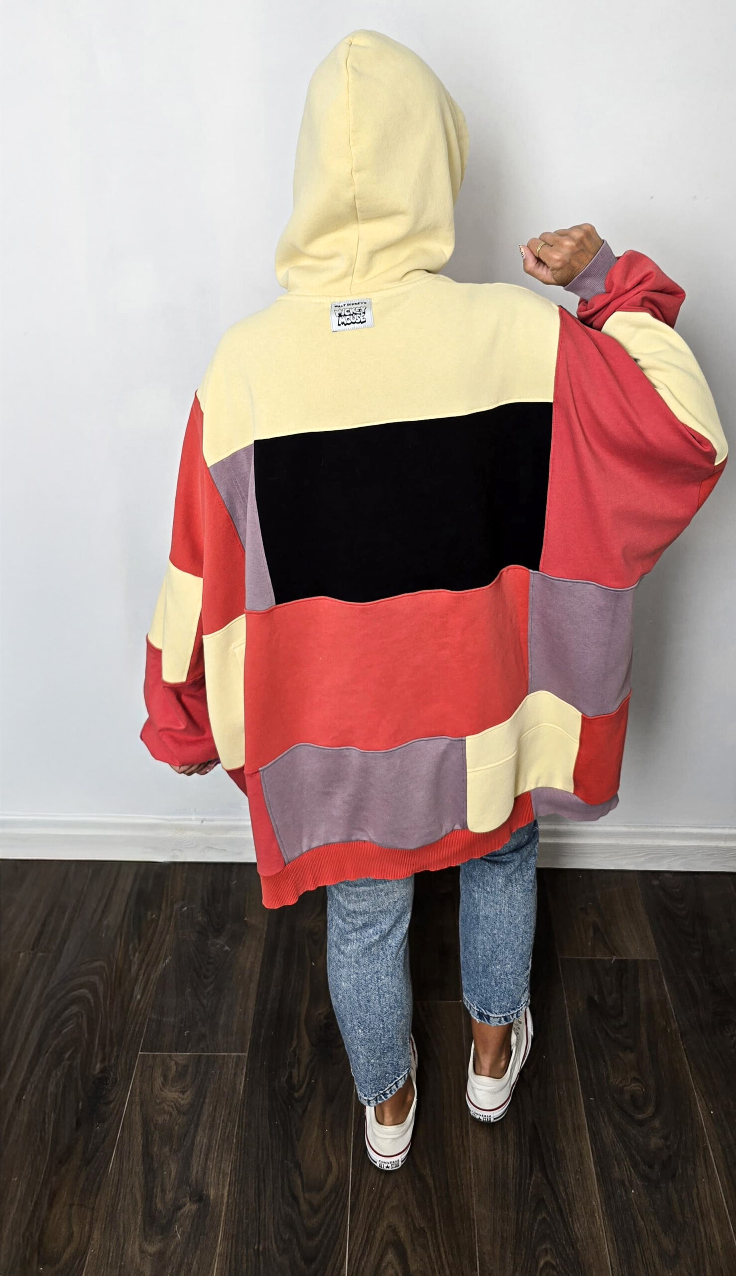 Wyjątkowość zapisana w każdym szwie – ta bluza została stworzona w duchu upcyclingu, dzięki czemu jest jedyna w swoim rodzaju. Powstała z pięciu różnych bluz, które dostały drugie życie, a razem tworzą wyjątkową całość w stylu patchwork. Głównym akcentem bluzy jest nadruk z Mickey Mouse oraz napisz “Mickey Mouse”, który został stworzony od podstaw z dwóch kolorów czarnego i czerwonego.