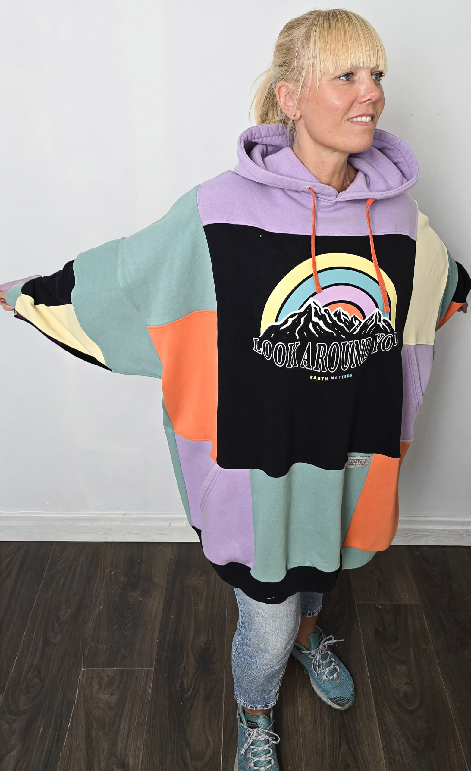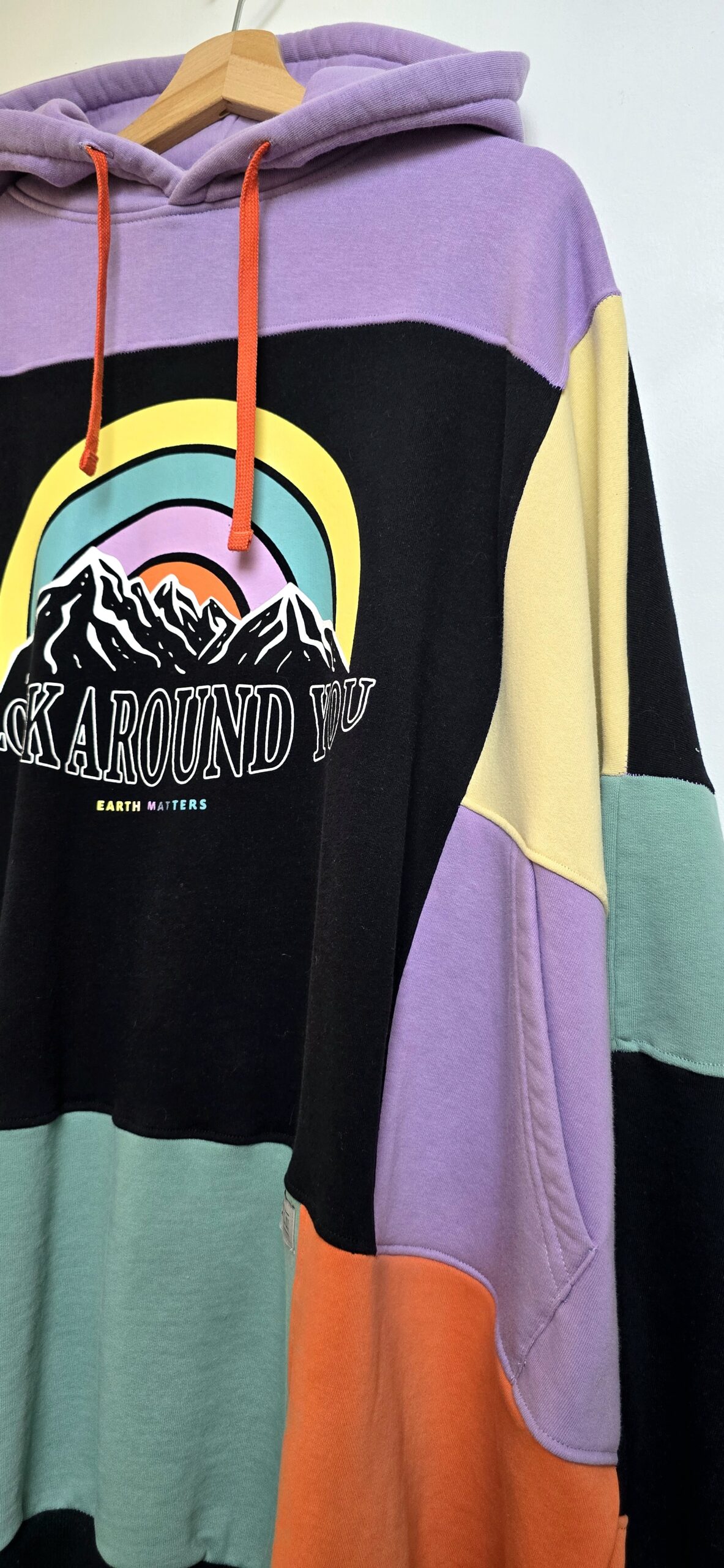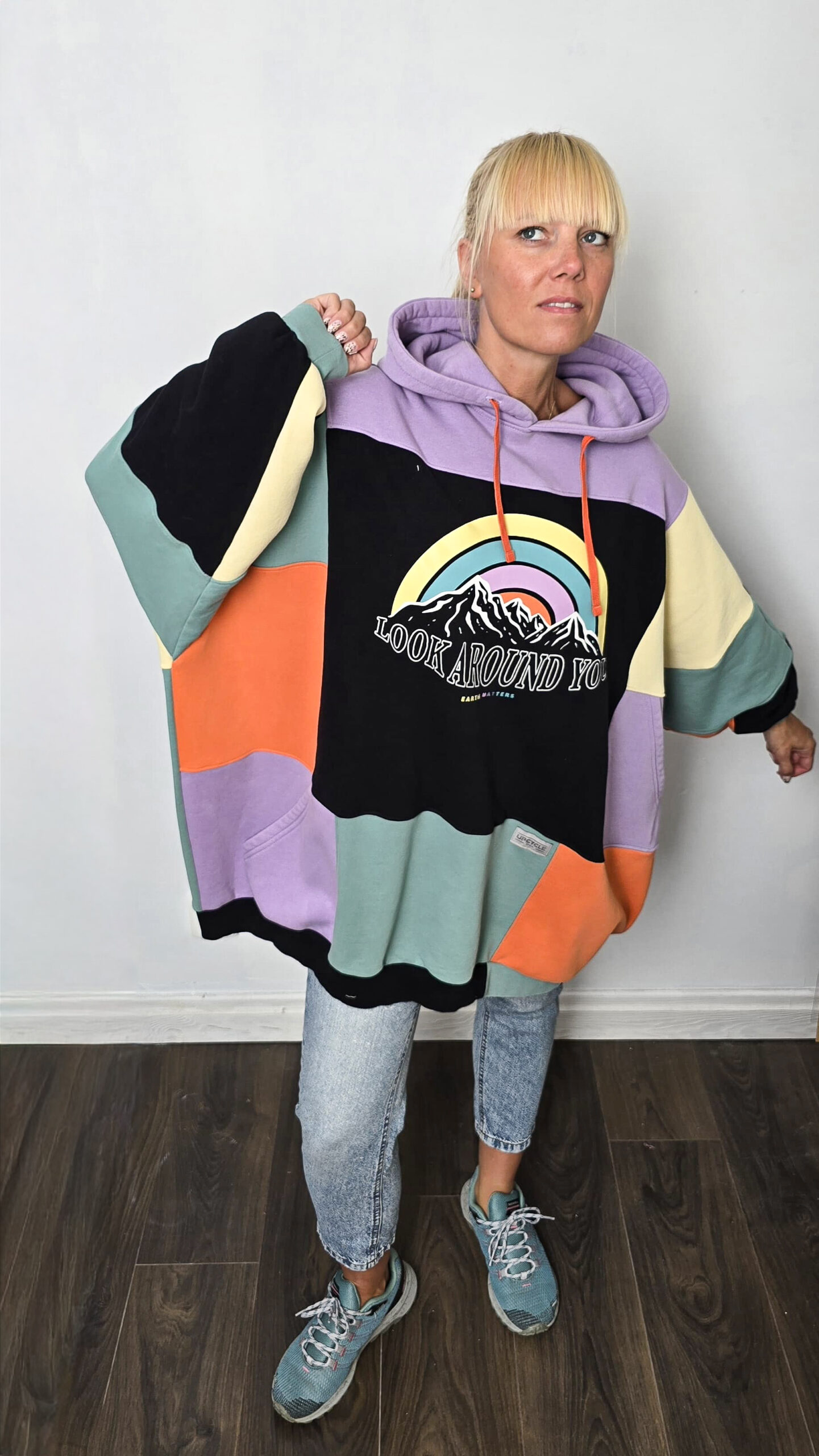 Ta bluza to manifest kreatywności i idei upcyclingu. Powstała z pięciu różnych bluz, które dostały drugie życie, a razem tworzą wyjątkową całość w stylu patchwork. Głównym akcentem bluzy jest kolorowy nadruk tęczy i gór.