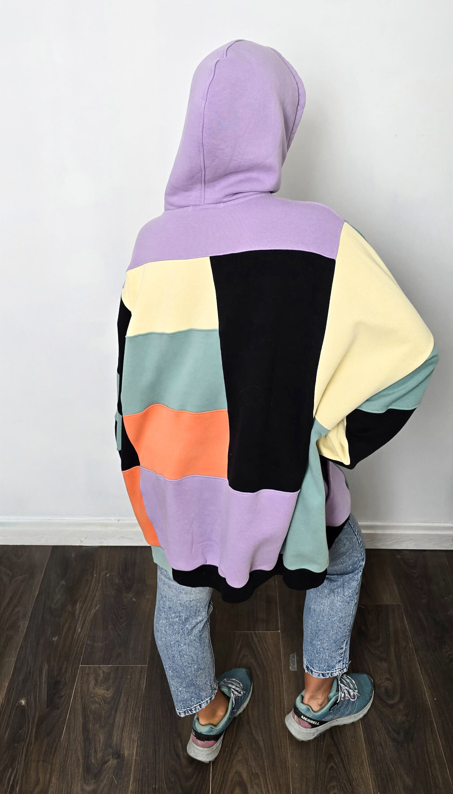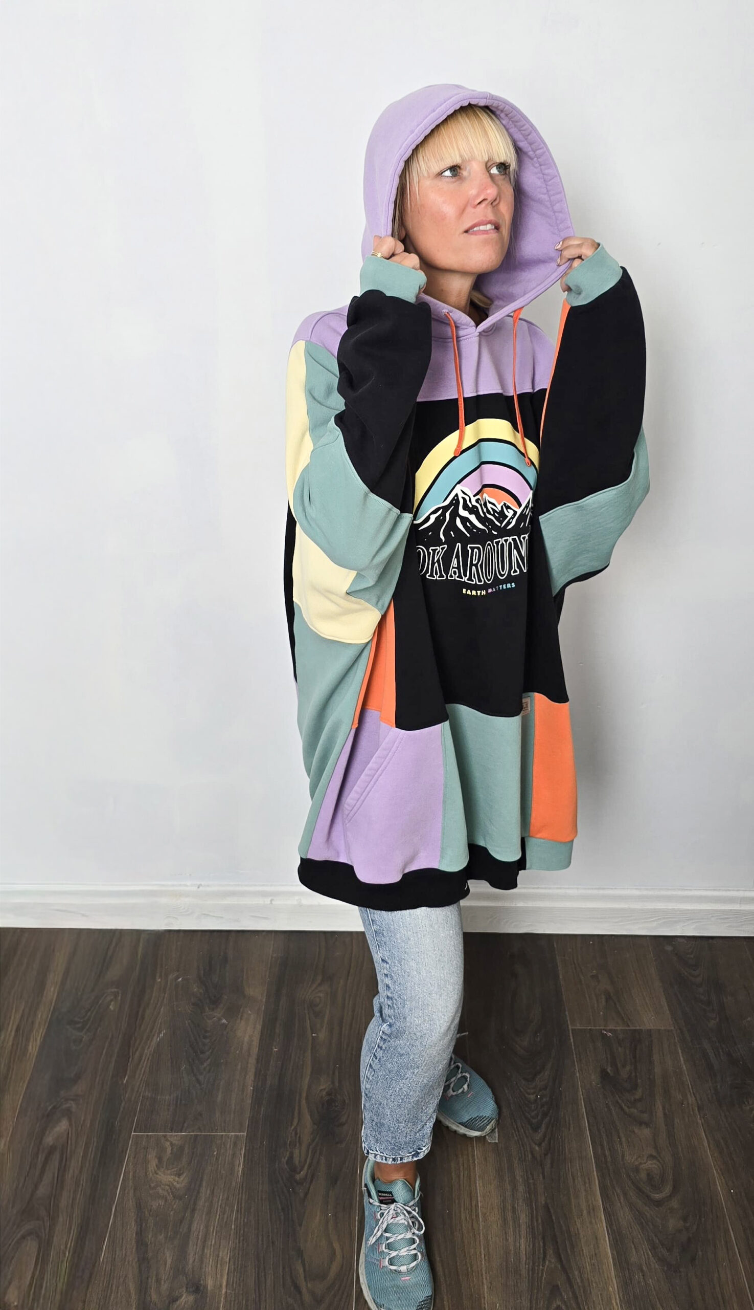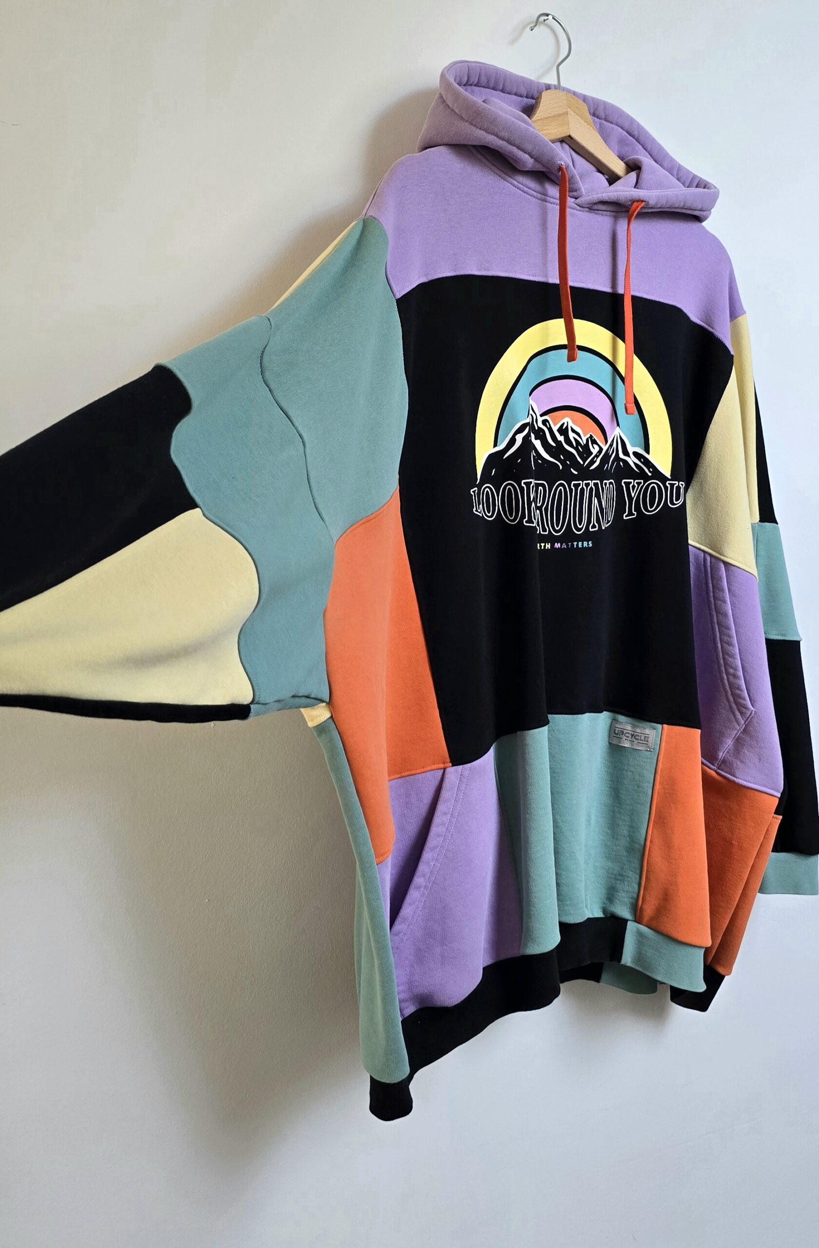 Ta bluza to manifest kreatywności i idei upcyclingu. Powstała z pięciu różnych bluz, które dostały drugie życie, a razem tworzą wyjątkową całość w stylu patchwork. Głównym akcentem bluzy jest kolorowy nadruk tęczy i gór.