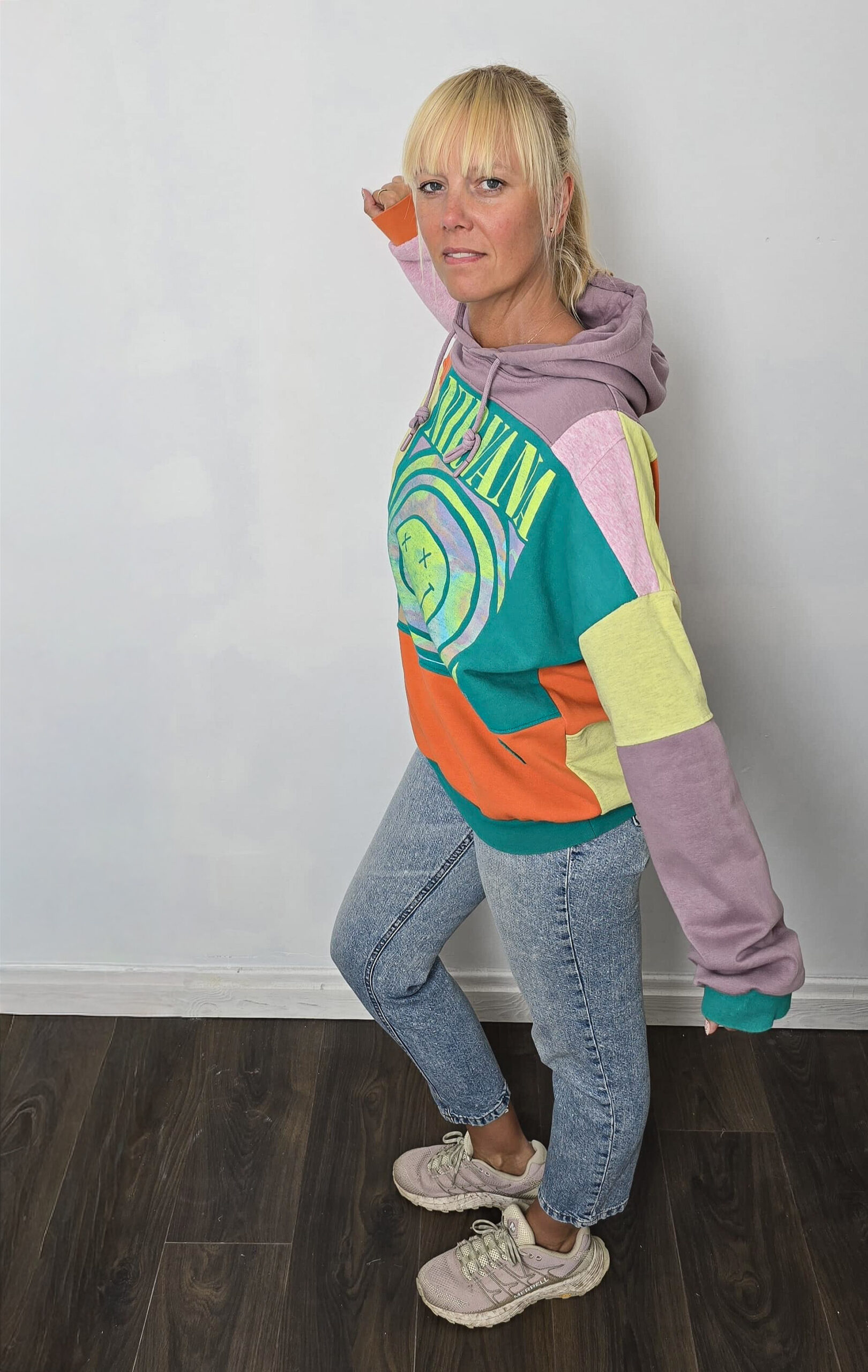 Zero nudy, maksimum oryginalności – ta bluza to projekt, którego nie znajdziesz nigdzie indziej. Każdy egzemplarz powstaje w pojedynczym wydaniu. Stworzona z pięciu różnych bluz, które dostały drugie życie, a razem tworzą wyjątkową całość w stylu patchwork. Głównym akcentem bluzy jest kolorowy nadruk z logo Nirvany. Dodatkowo bluza uzupełniona małymi nadrukami z buźką nirvany.