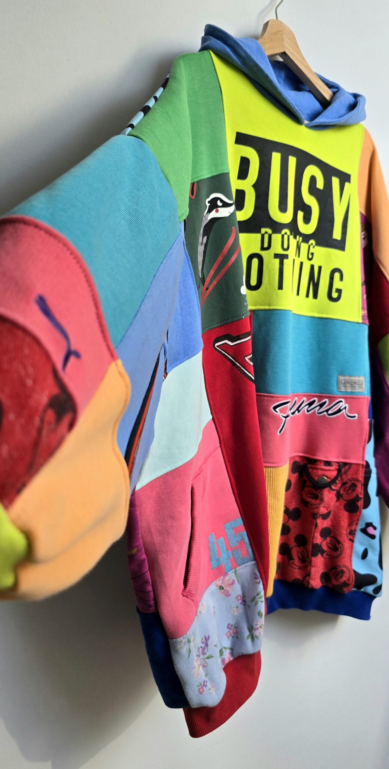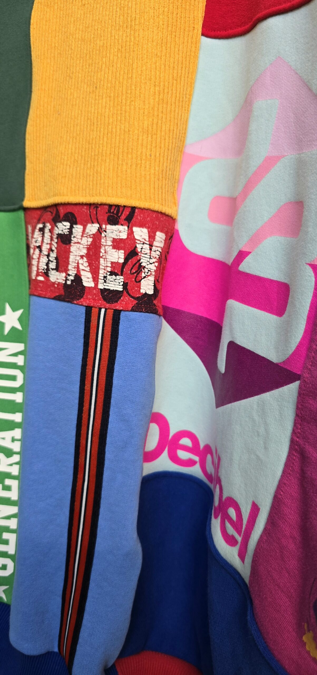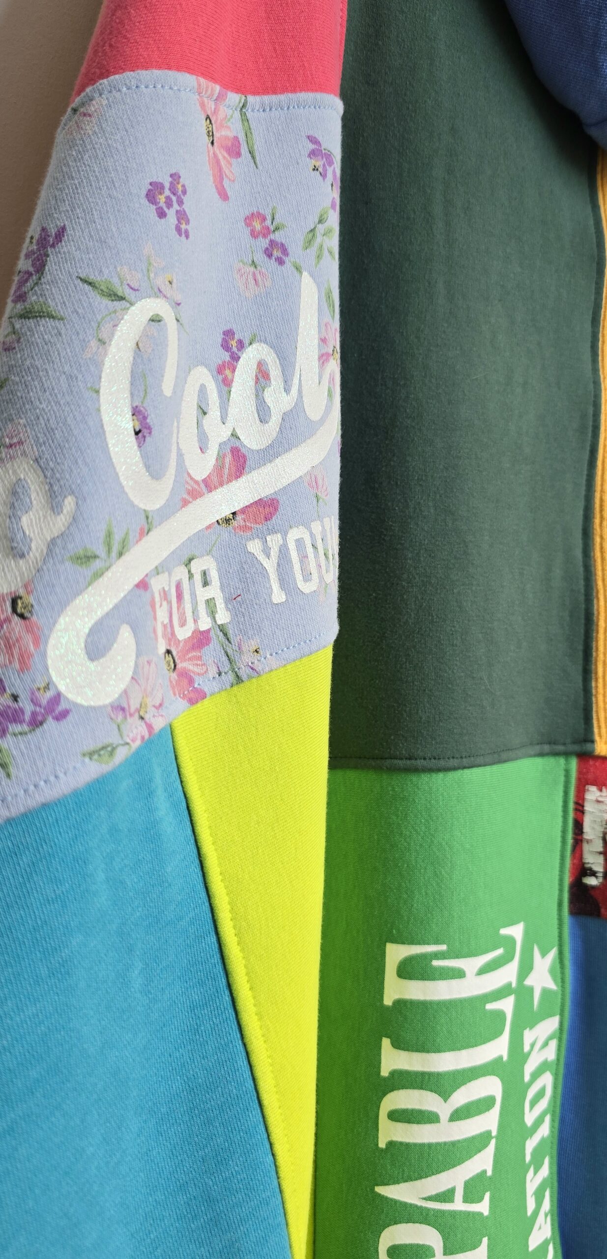 Unikatowa bluza patchworkowa stworzona z odzyskanych fragmentów materiałów, które pozostały po poprzednich projektach. Miks nadruków, kolorów i wzorów tworzy dynamiczną kompozycję, nadając bluzie wyrazisty, artystyczny styl. Projekt powstał w duchu upcyclingu, z myślą o maksymalnym wykorzystaniu materiałów. Bluza oversize large – pojedynczy egzemplarz, który przyciąga wzrok i pozostaje w pamięci na długo.