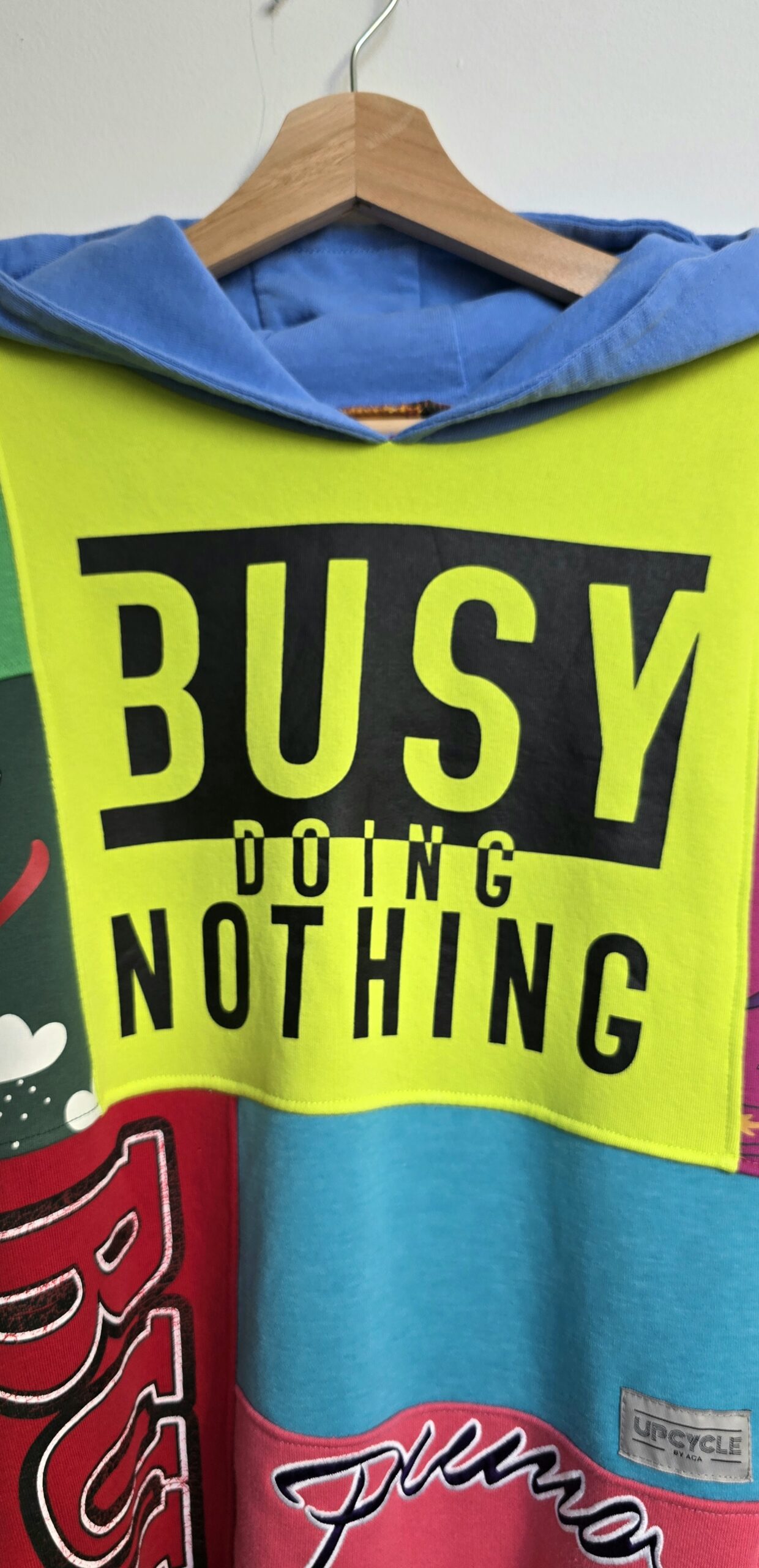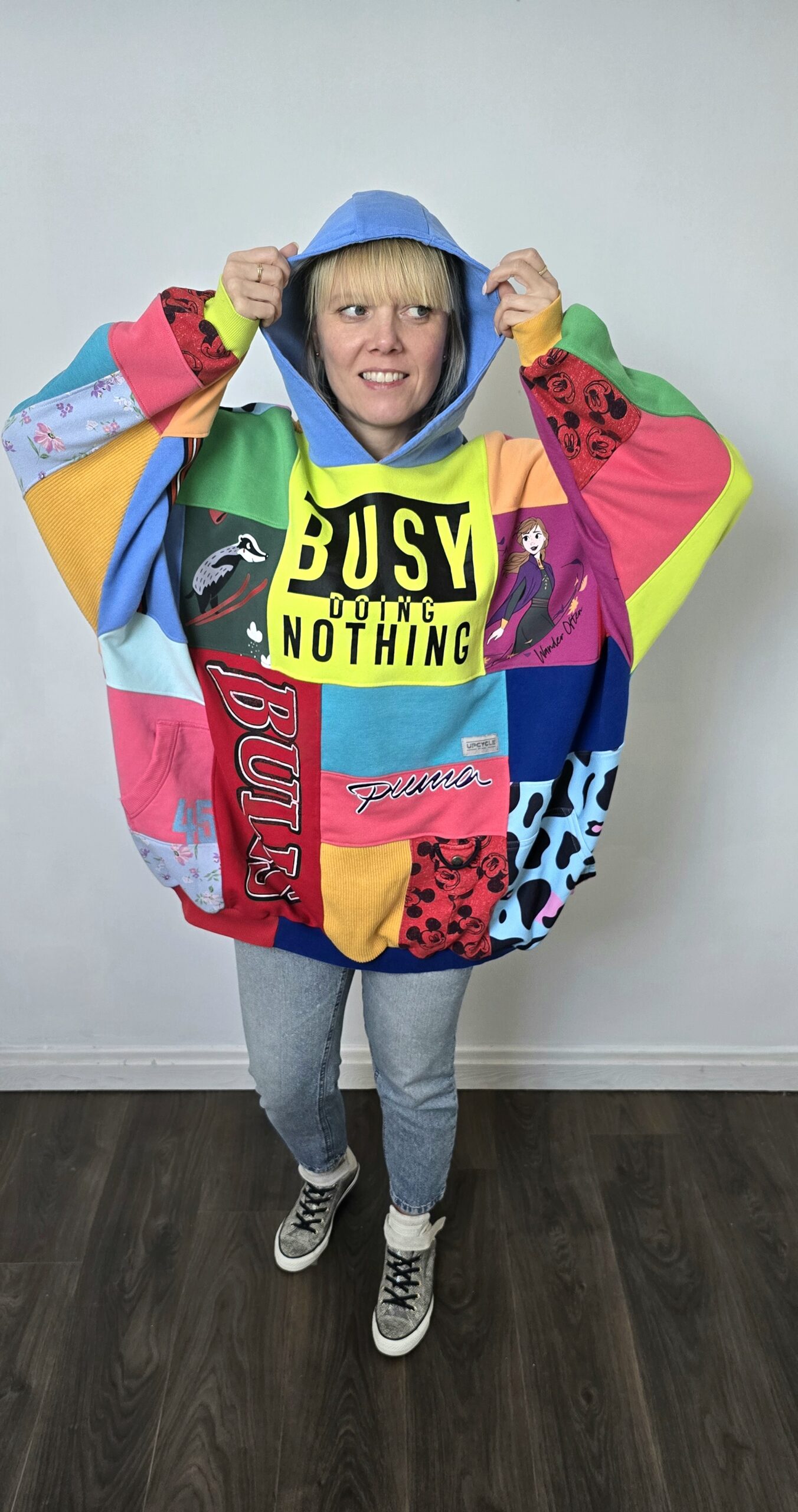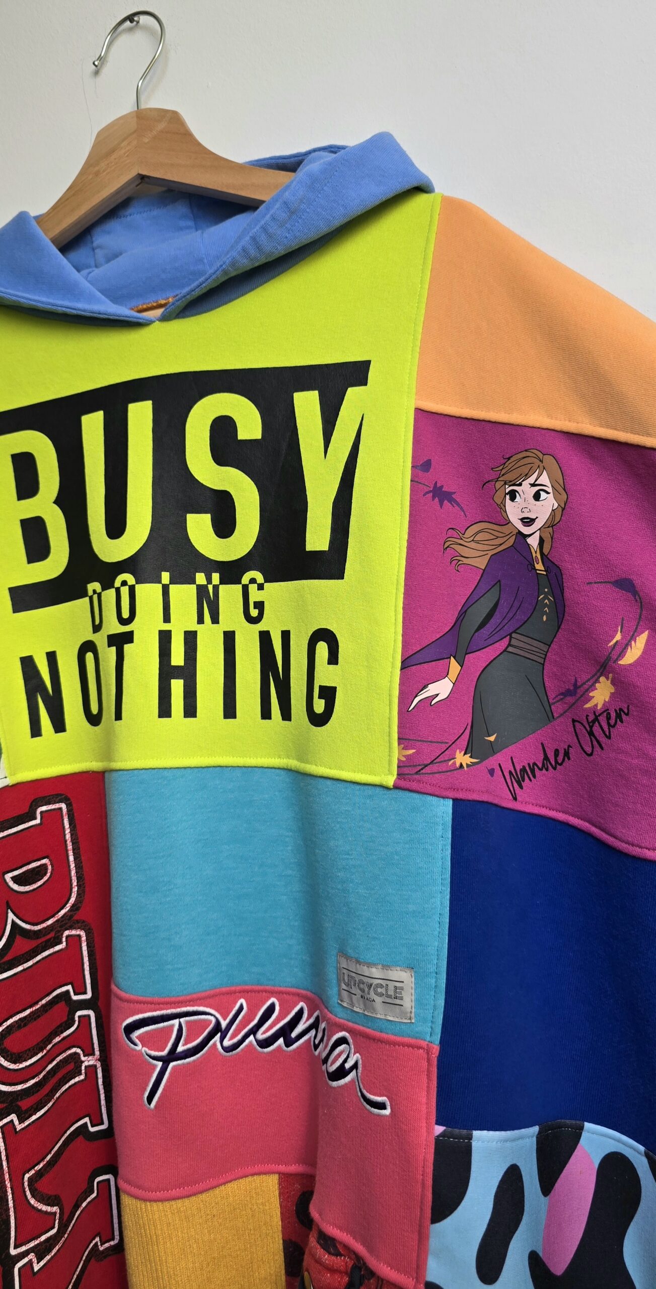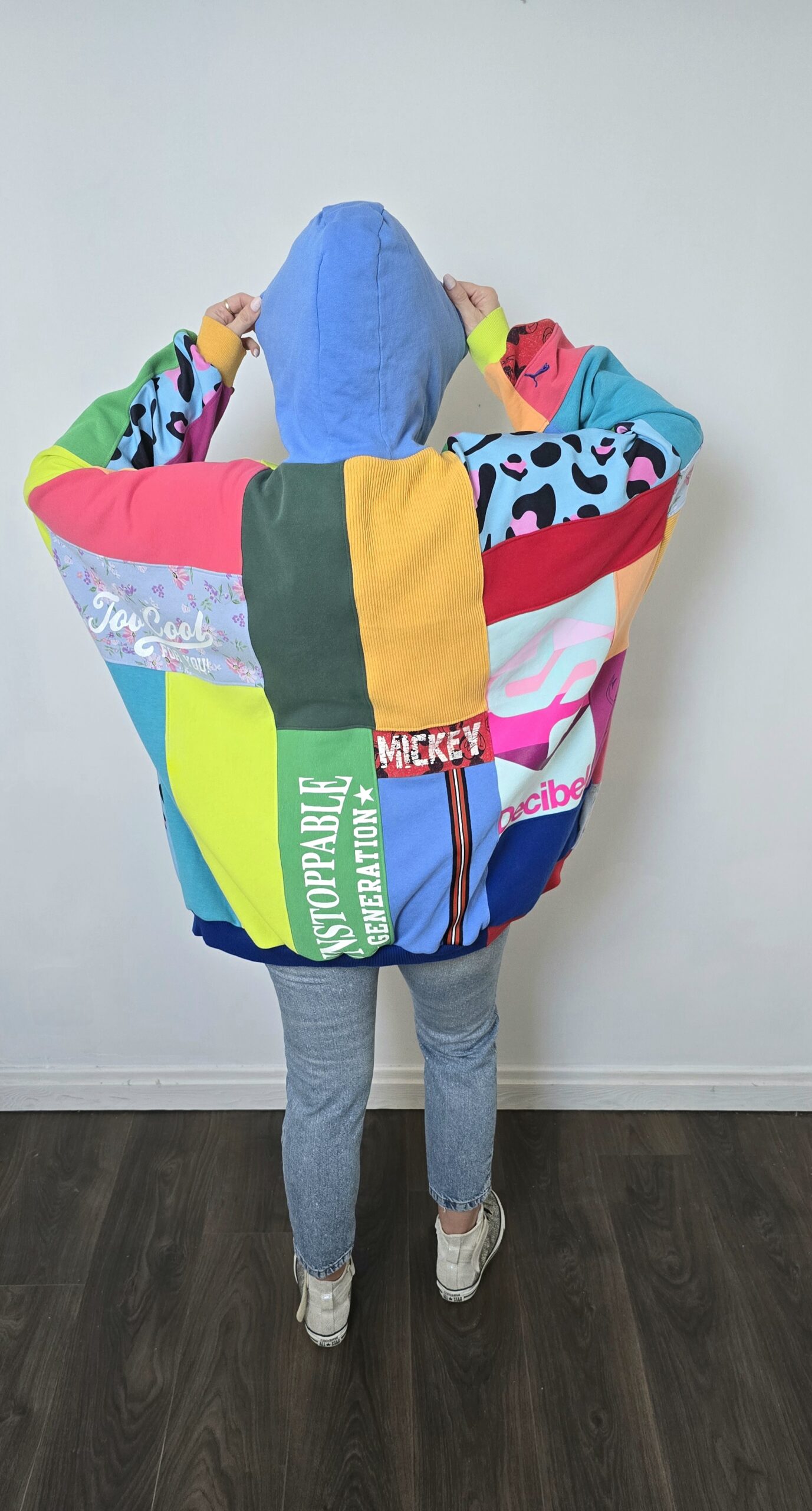 Unikatowa bluza patchworkowa stworzona z odzyskanych fragmentów materiałów, które pozostały po poprzednich projektach. Miks nadruków, kolorów i wzorów tworzy dynamiczną kompozycję, nadając bluzie wyrazisty, artystyczny styl. Projekt powstał w duchu upcyclingu, z myślą o maksymalnym wykorzystaniu materiałów. Bluza oversize large – pojedynczy egzemplarz, który przyciąga wzrok i pozostaje w pamięci na długo.