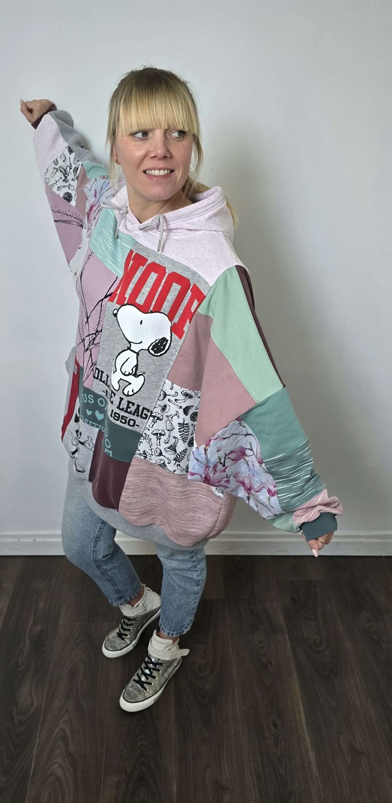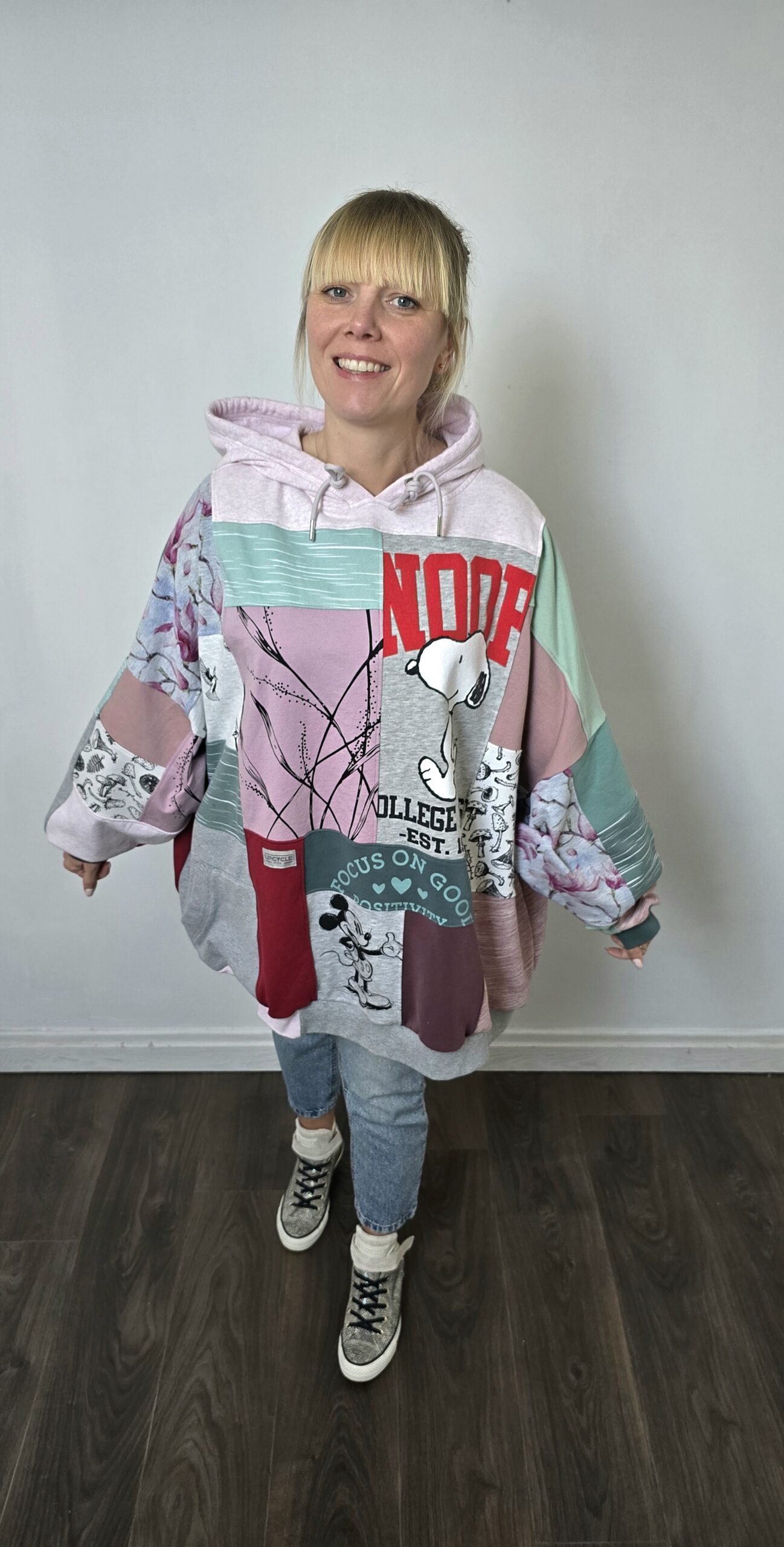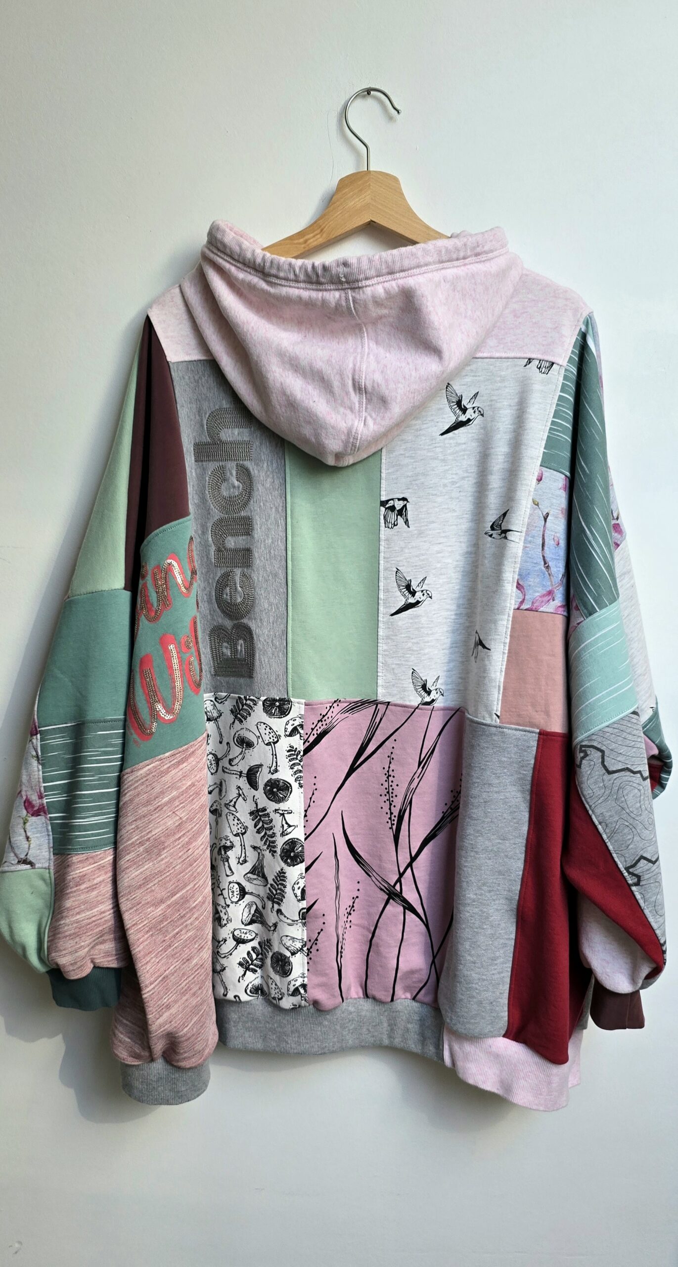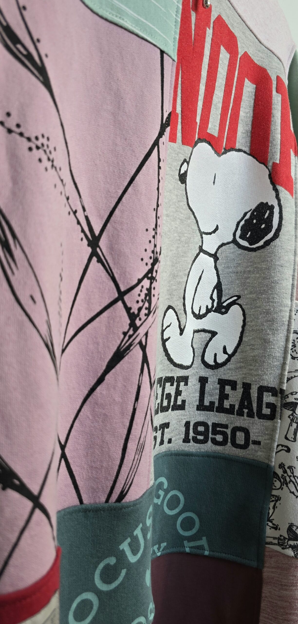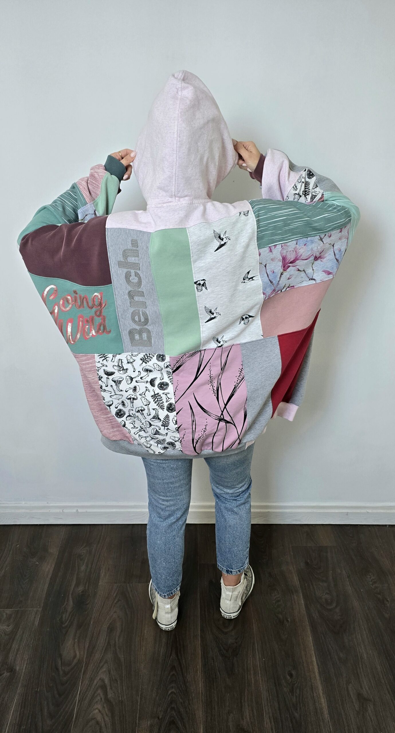 Upcycling w praktyce: bluza powstała ze ścinków materiałów pozostałych po wcześniejszych projektach. Różnorodne nadruki, kolory i faktury tworzą niepowtarzalną patchworkową kompozycję, w której każdy element ma swoją historię. To projekt, który pokazuje, że nawet najmniejsze fragmenty materiałów mogą zyskać nowe życie. Bluza oversize large – jedyny taki egzemplarz.