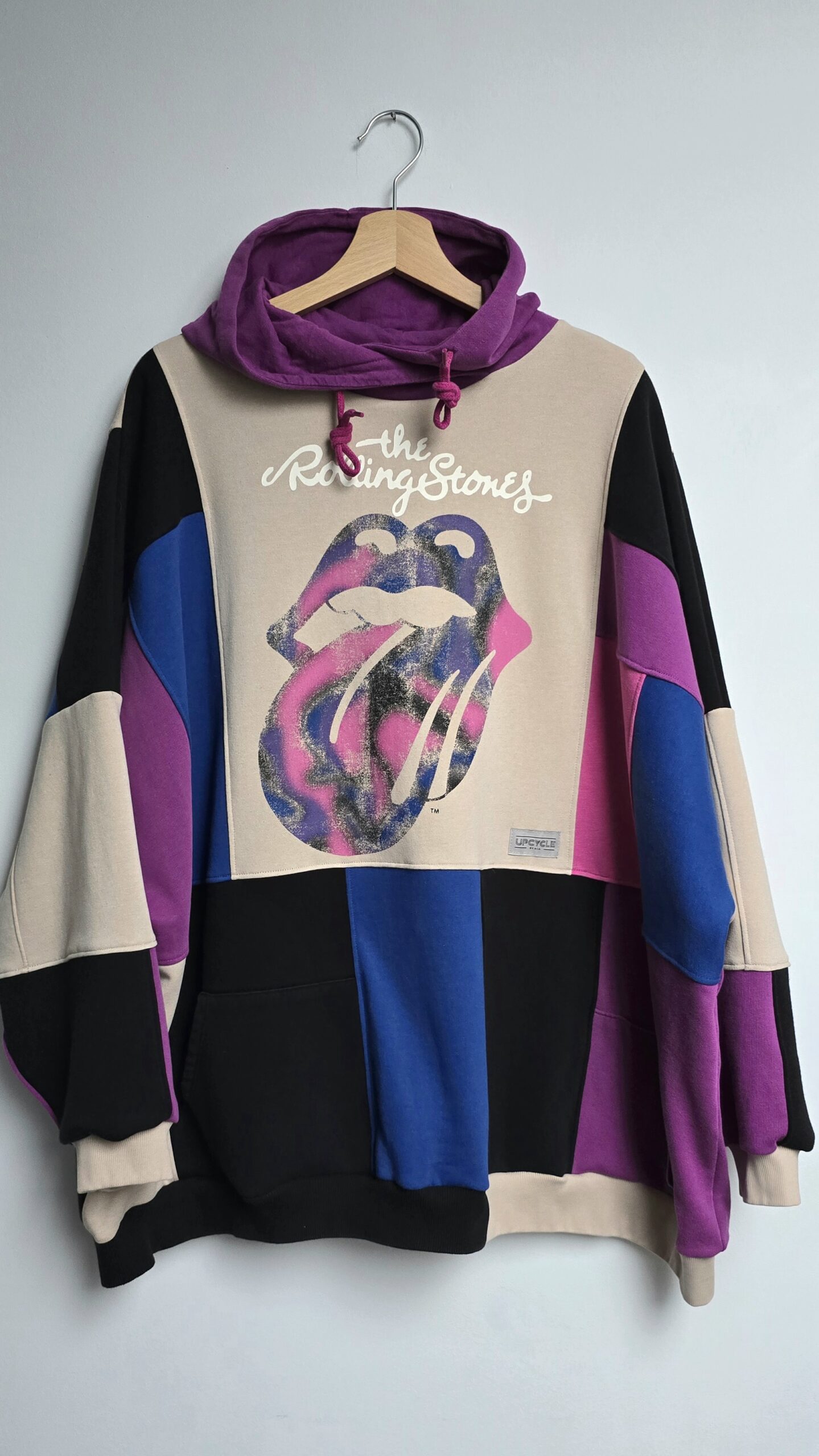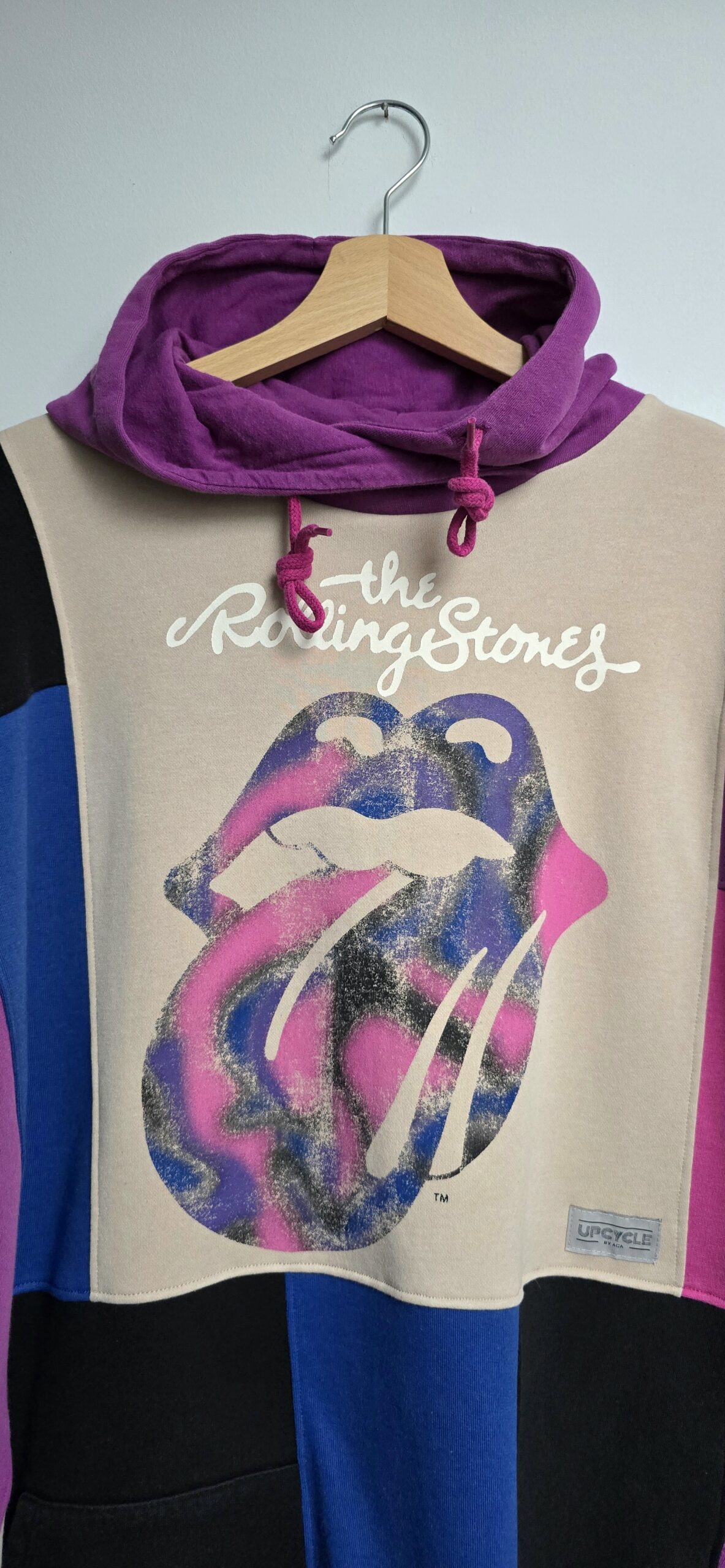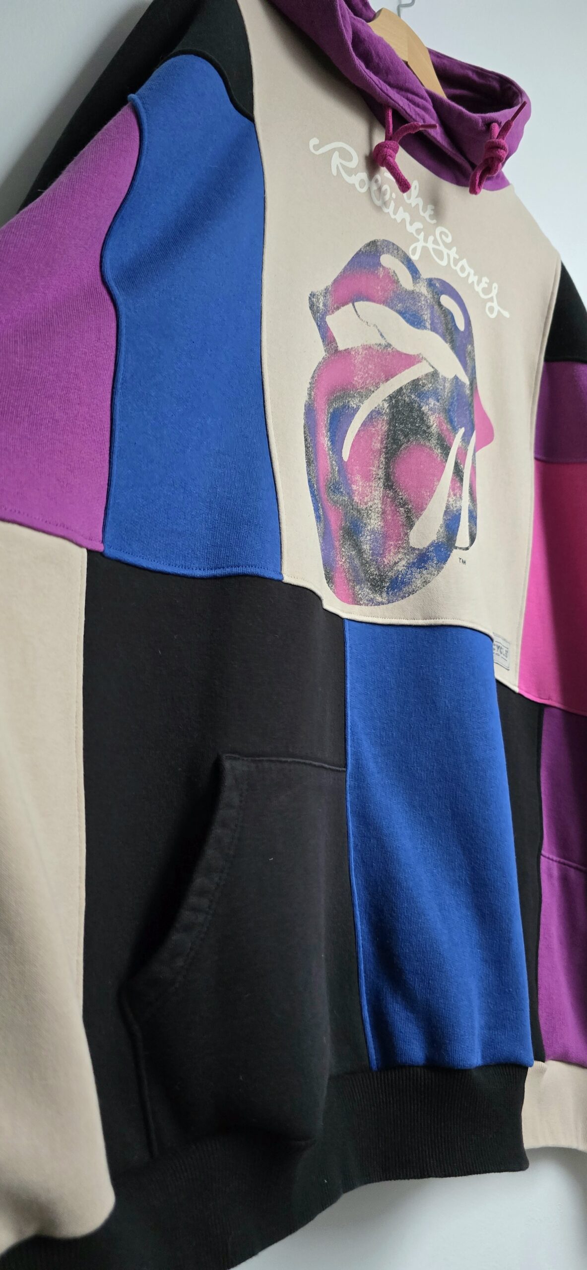 Dla tych, którzy lubią wyróżniać się w tłumie i kochają Rock – bluza patchworkowa, pełna energii i charakteru, uszyta z odzyskanych materiałów. Powstała z pięciu różnych bluz, które dostały drugie życie, a razem tworzą wyjątkową całość w stylu patchwork. Głównym akcentem bluzy są kolorowe usta z wystawionym językiem, to logo Rolling Stones, bluza uzupełniona pasującymi, intensywnymi kolorami, które przyciągają spojrzenia.