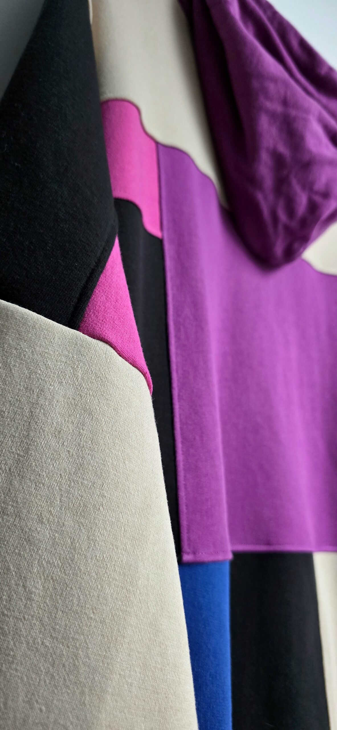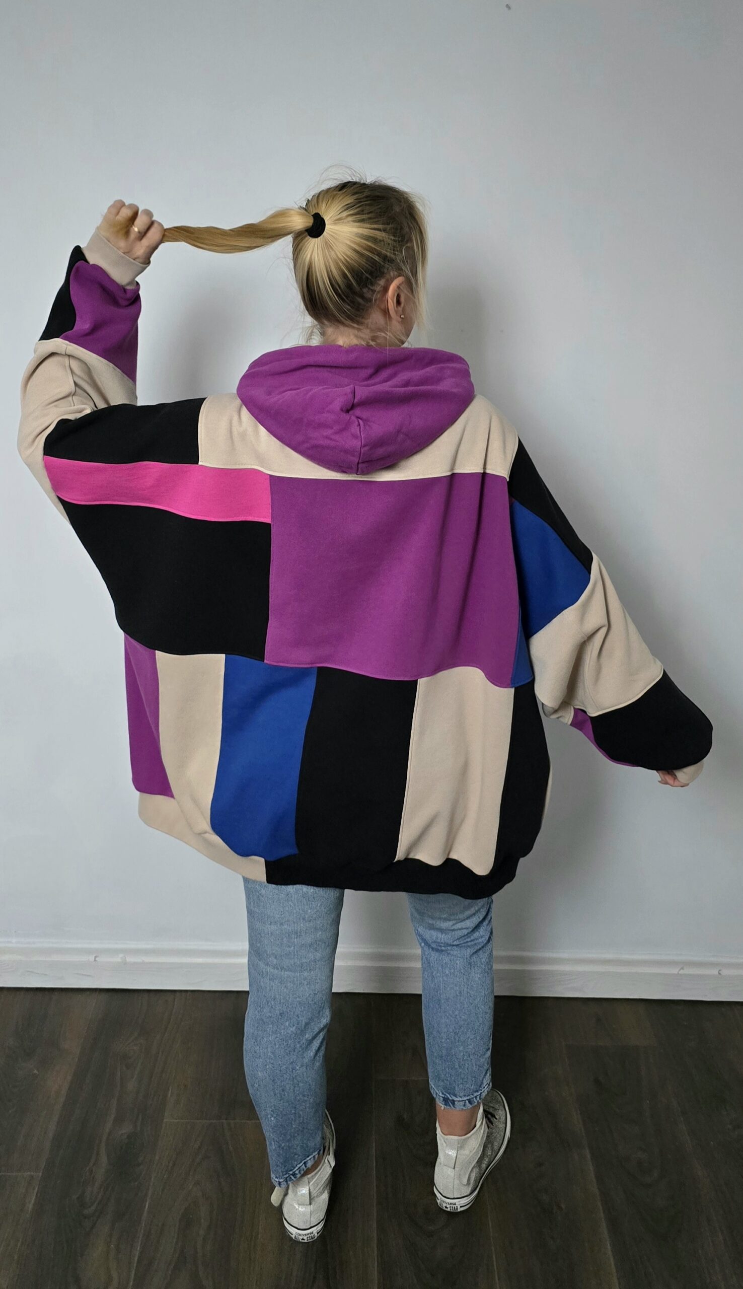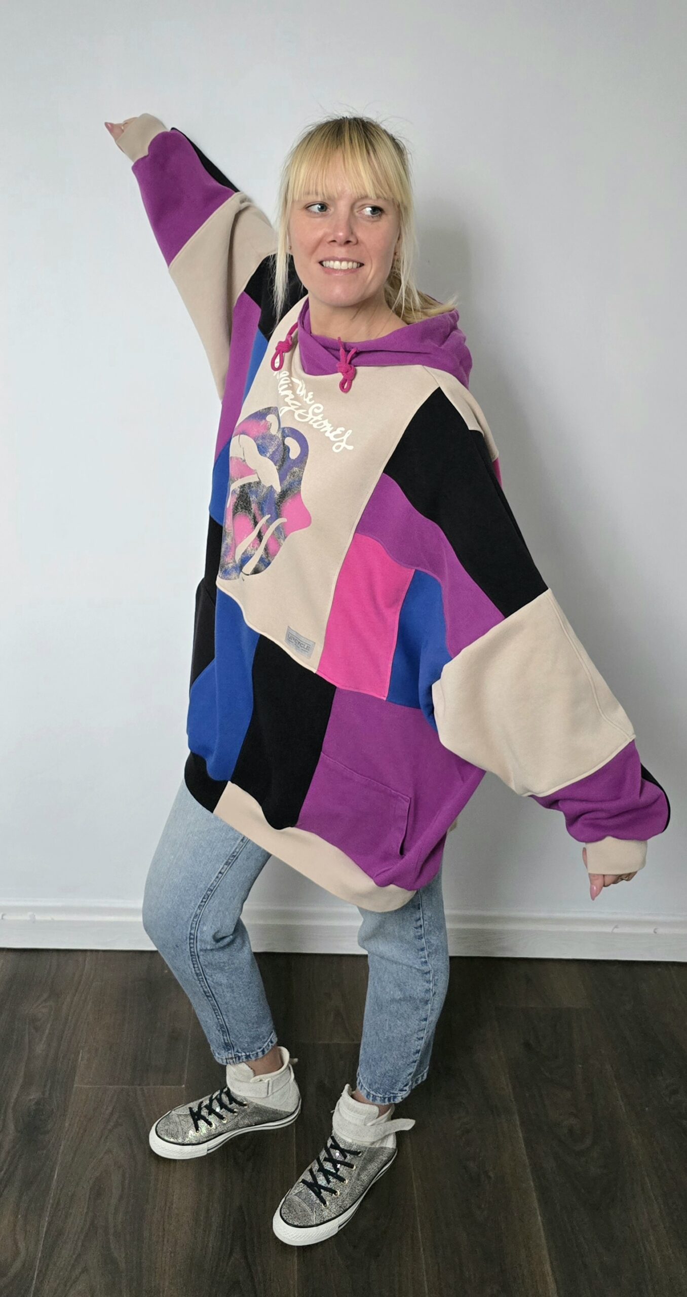 Dla tych, którzy lubią wyróżniać się w tłumie i kochają Rock – bluza patchworkowa, pełna energii i charakteru, uszyta z odzyskanych materiałów. Powstała z pięciu różnych bluz, które dostały drugie życie, a razem tworzą wyjątkową całość w stylu patchwork. Głównym akcentem bluzy są kolorowe usta z wystawionym językiem, to logo Rolling Stones, bluza uzupełniona pasującymi, intensywnymi kolorami, które przyciągają spojrzenia.