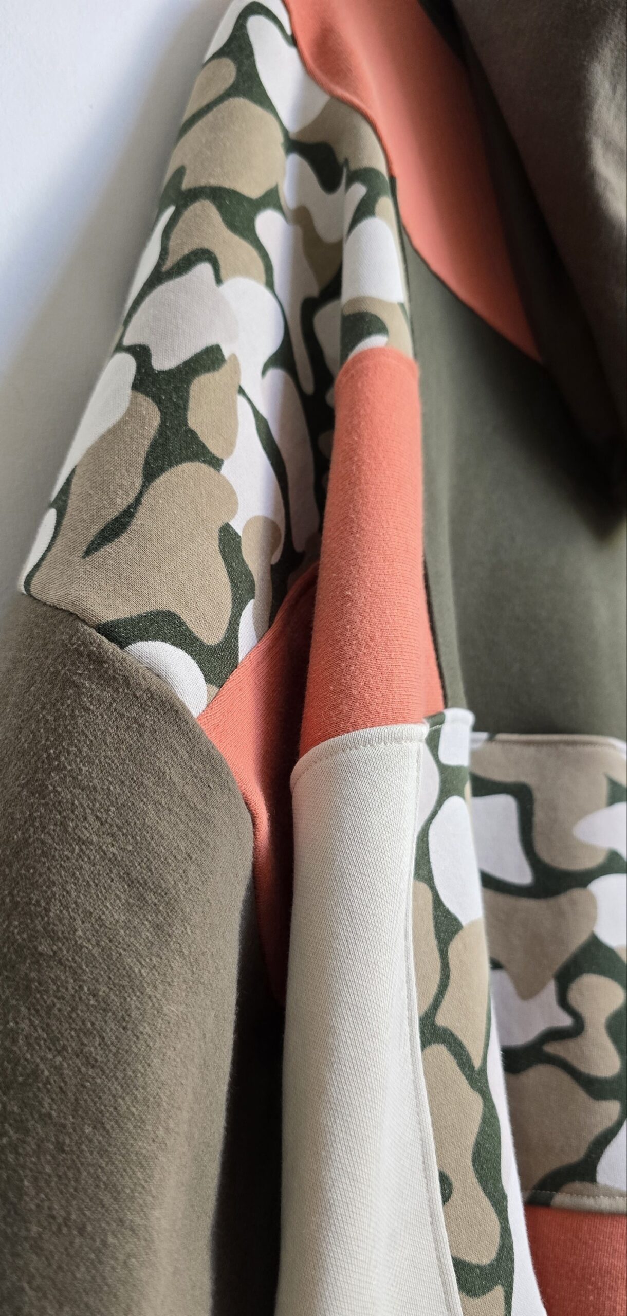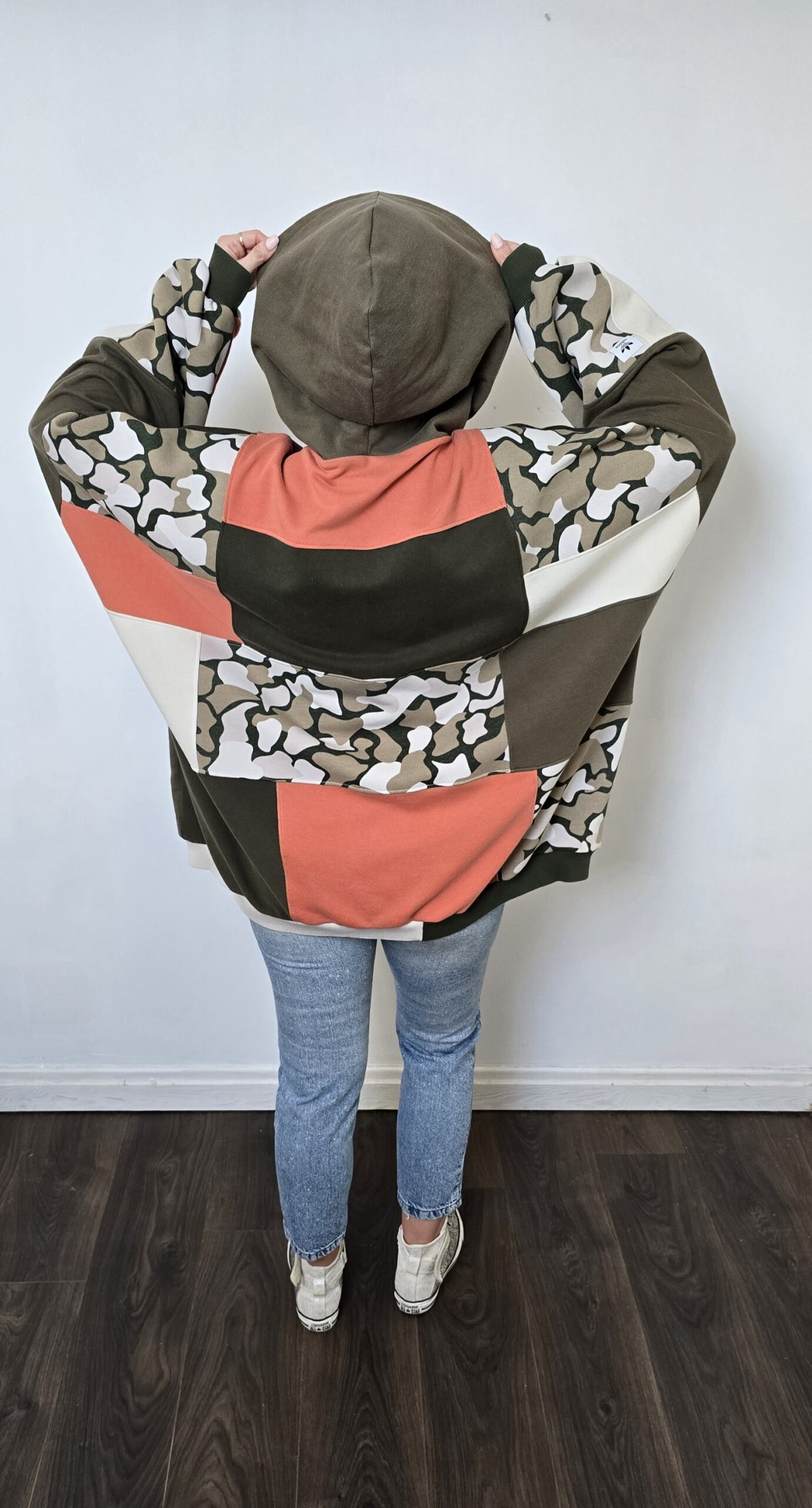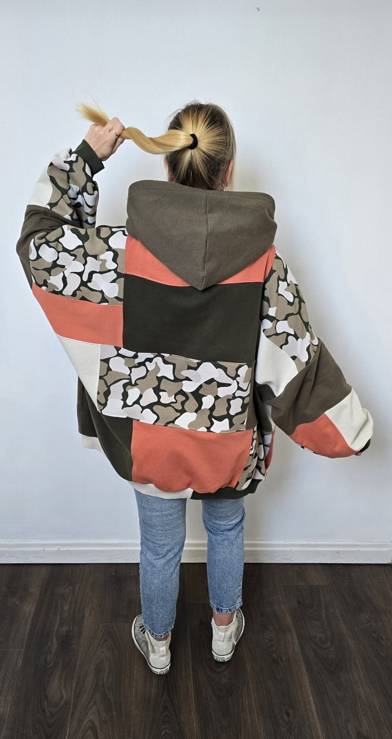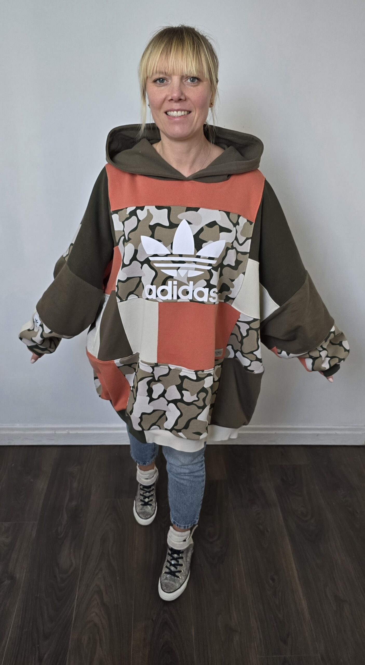 Ta bluza to manifest kreatywności i idei upcyclingu. Powstała z czterech różnych bluz oraz spodni dresowych, które dostały drugie życie, a razem tworzą wyjątkową całość w stylu patchwork. Głównym akcentem bluzy jest moro nadruk oraz logo marki “Adidas”.