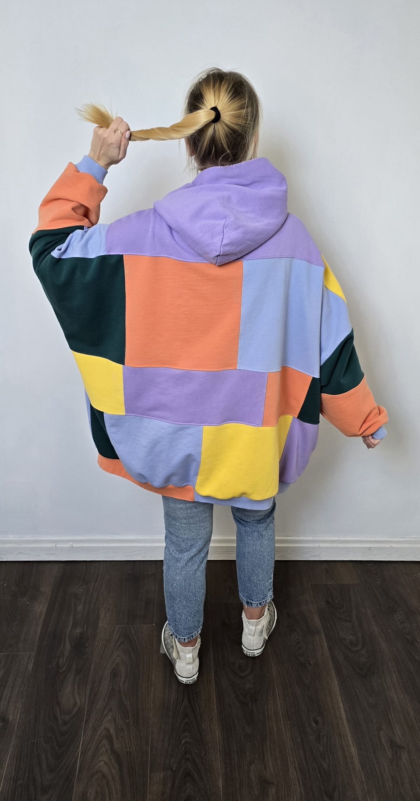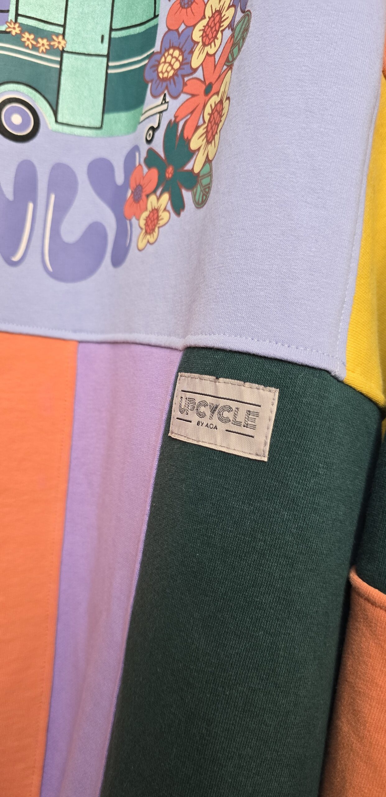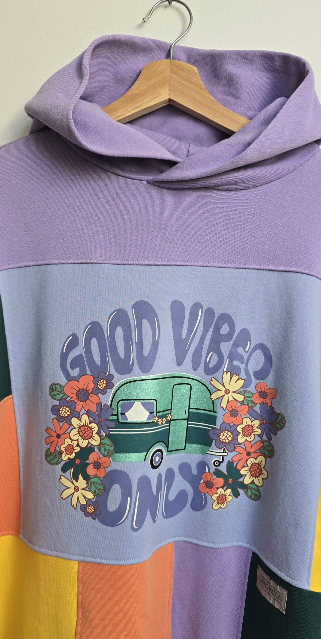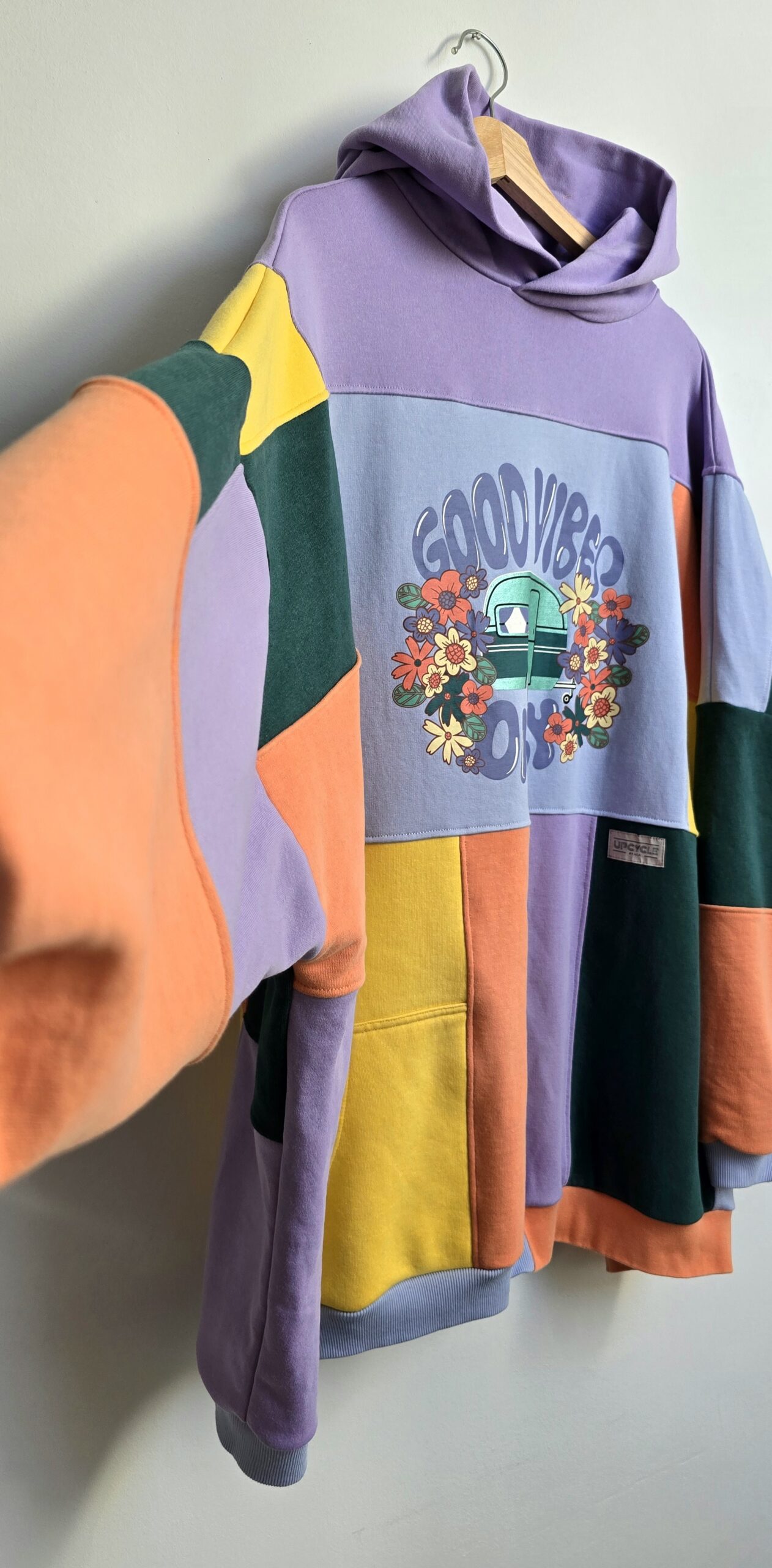 Moda bez kompromisów: wygodna, piękna i w 100% unikatowa. Bluza uszyta ręcznie z pięciu bluz. Za sprawą kreatywności i świetnego projektu została stworzona wyjątkowa całość w stylu patchwork z wyjątkowym printem, który zachęca do wiosennego campingowania. Wyjątkowa, kolorowa z kwiatami i przyczepą Campingową oraz napisem “Good Vibes, Only”.