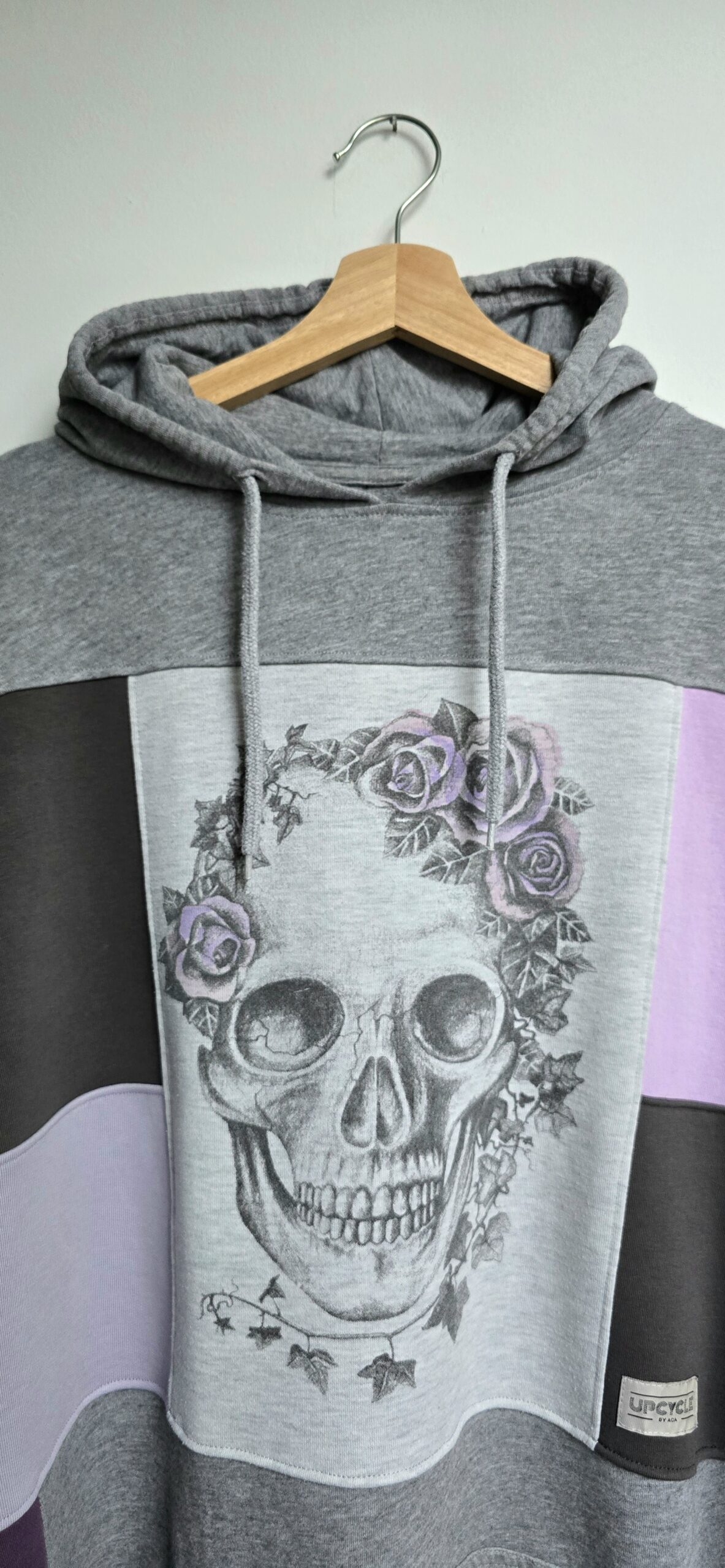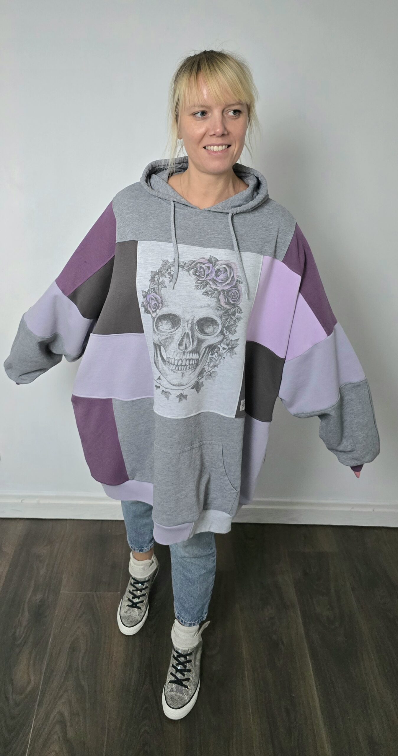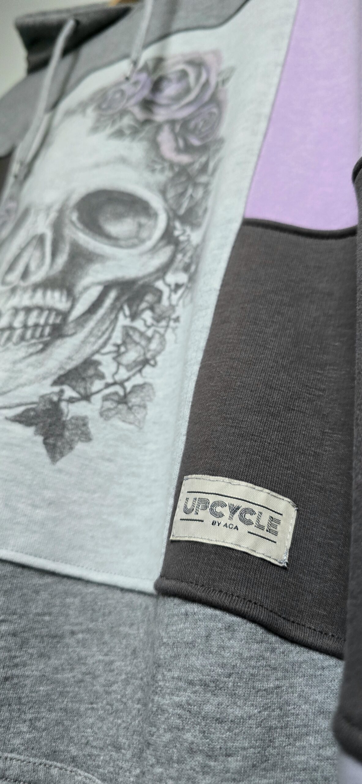 Zrobiona z miłości do odcieni fioletu i do planety – bluza, która łączy w sobie historię kilku ubrań, nadając im nowe życie w formie jedynego w swoim rodzaju projektu. Powstała z sześciu różnych bluz, które dostały drugie życie, a razem tworzą wyjątkową całość w stylu patchwork. Głównym akcentem bluzy jest nadruk z czaszką zdobioną liśćmi bluszczu i różami.