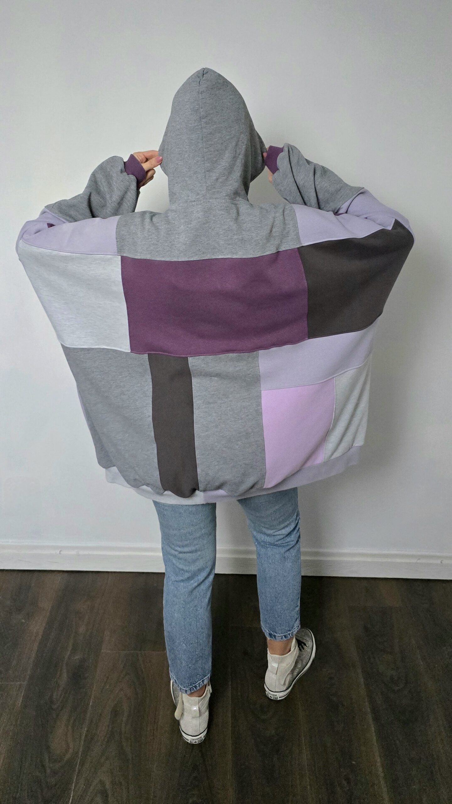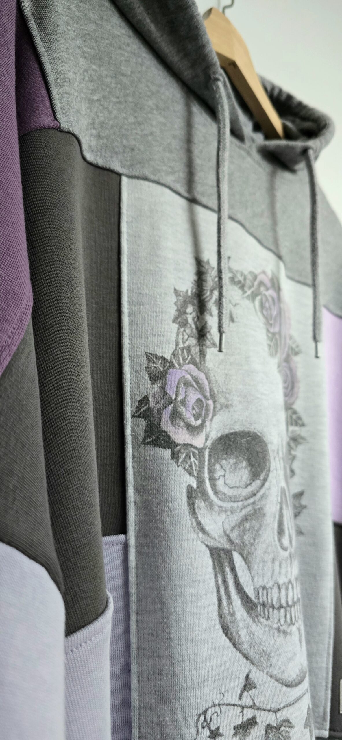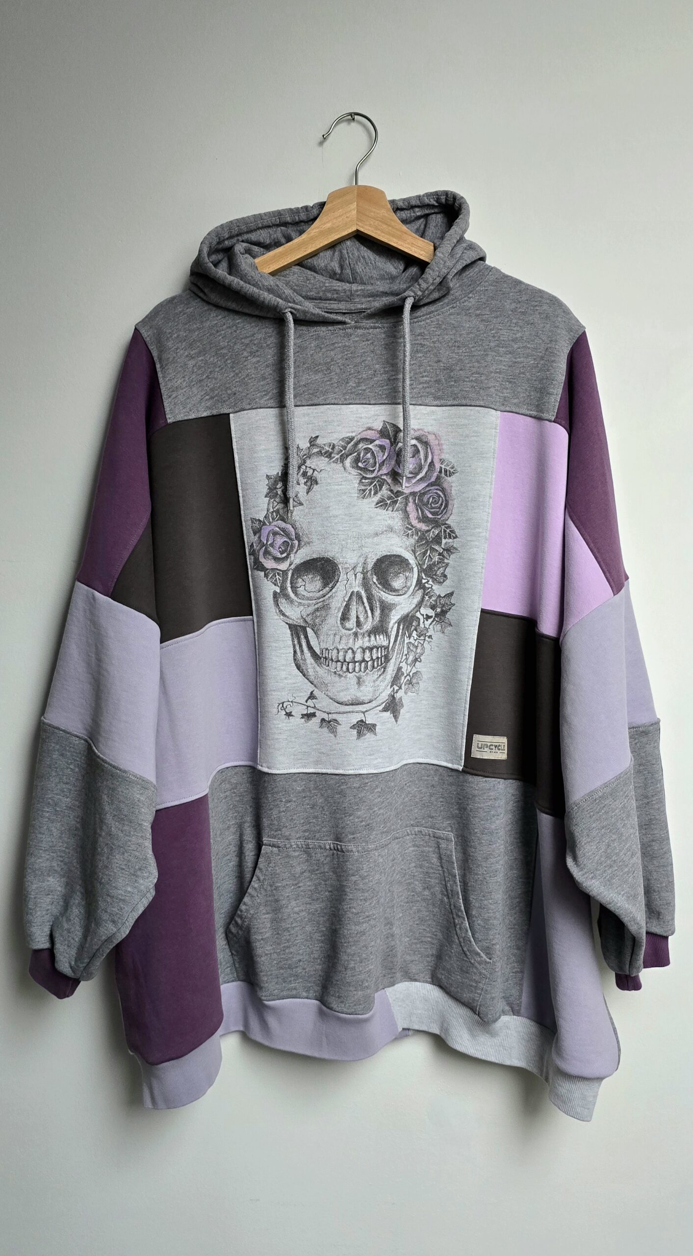 Zrobiona z miłości do odcieni fioletu i do planety – bluza, która łączy w sobie historię kilku ubrań, nadając im nowe życie w formie jedynego w swoim rodzaju projektu. Powstała z sześciu różnych bluz, które dostały drugie życie, a razem tworzą wyjątkową całość w stylu patchwork. Głównym akcentem bluzy jest nadruk z czaszką zdobioną liśćmi bluszczu i różami.
