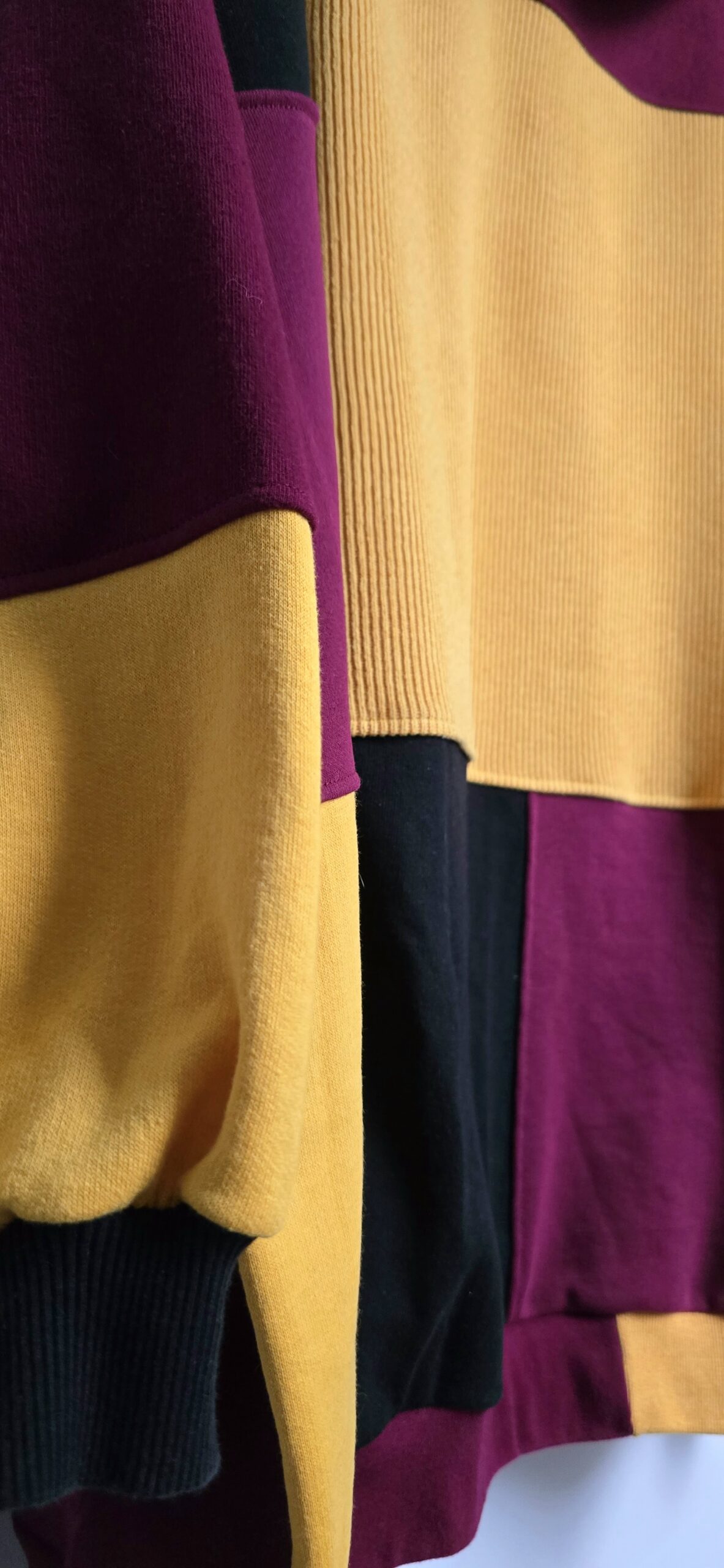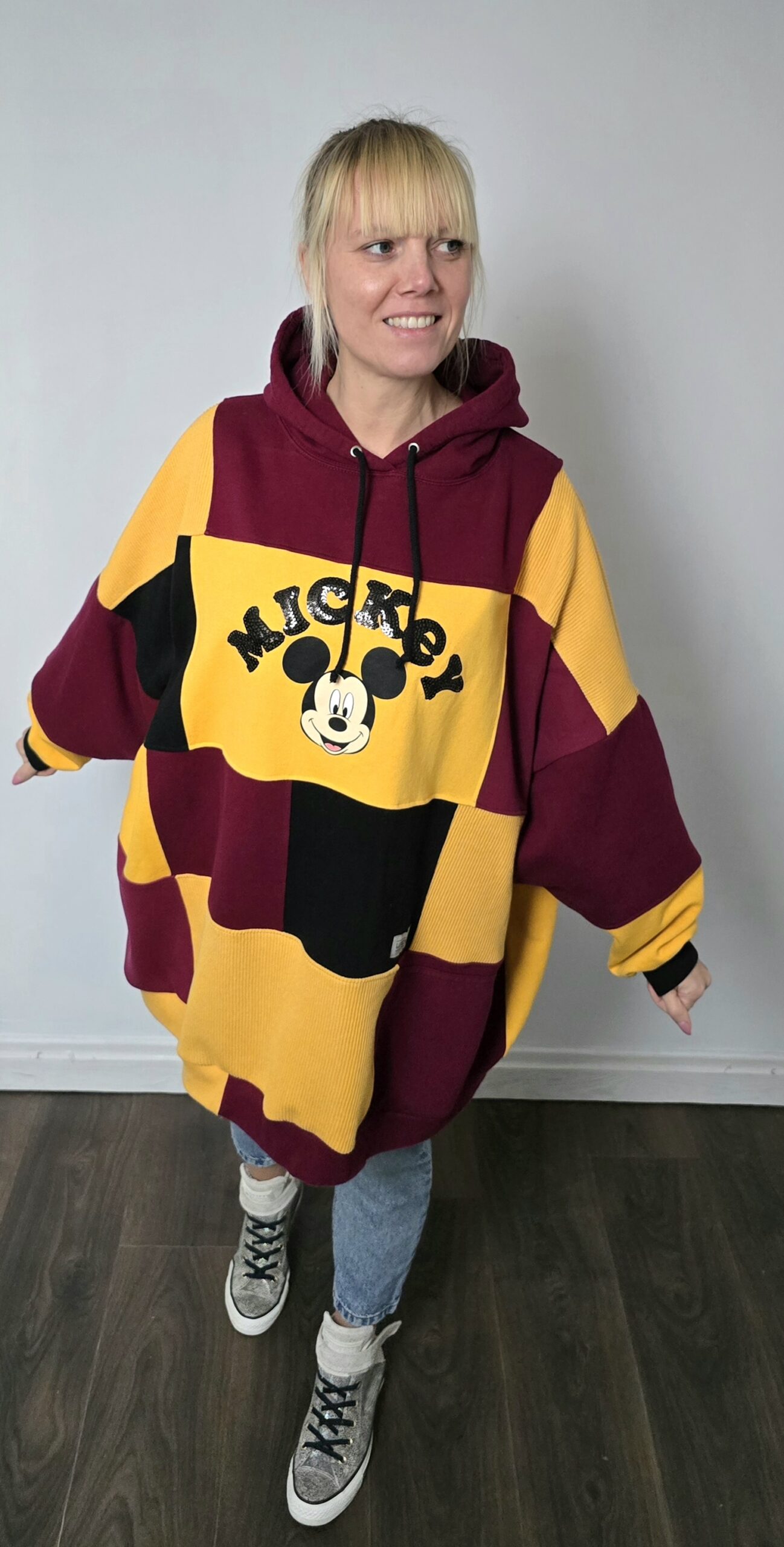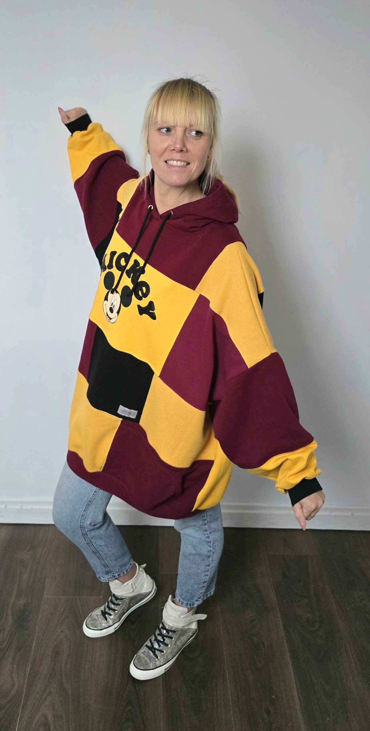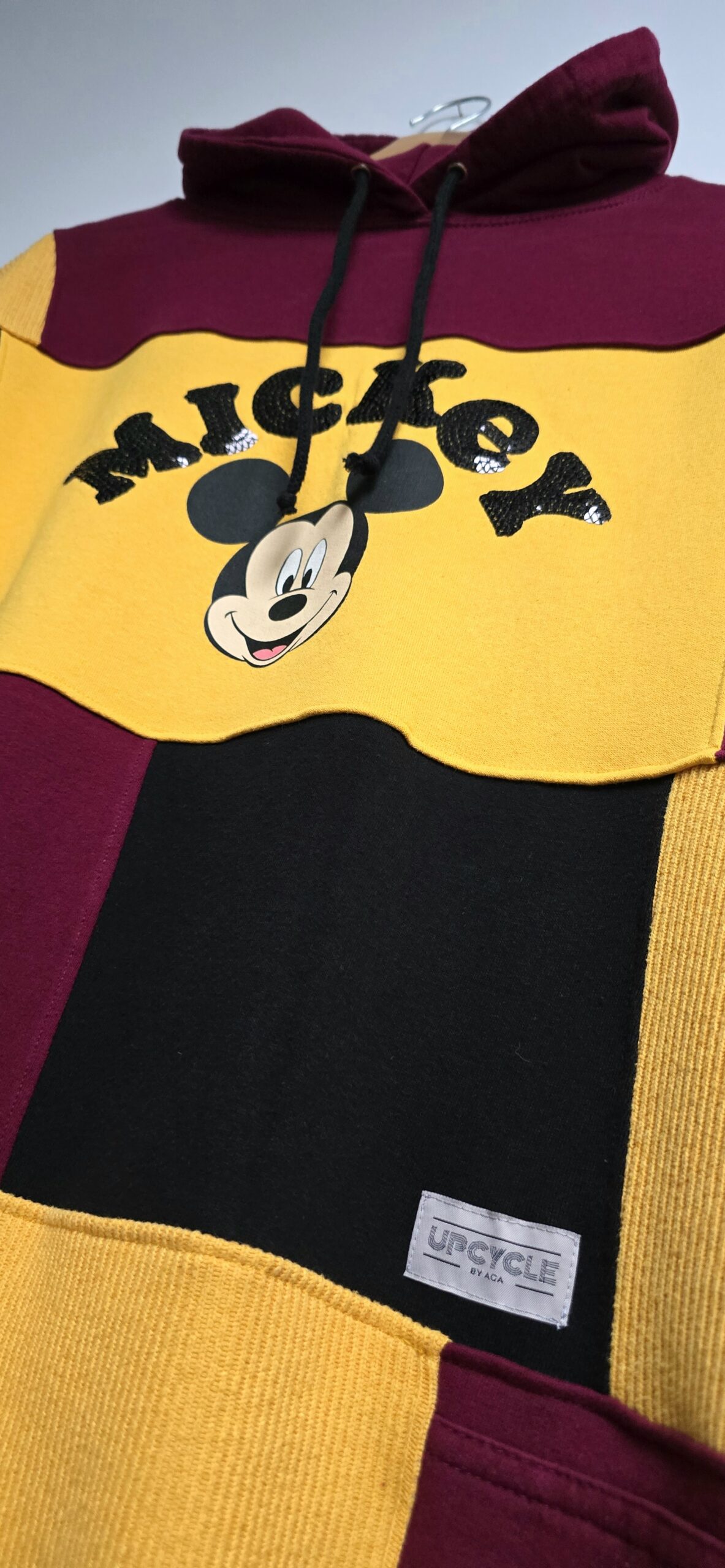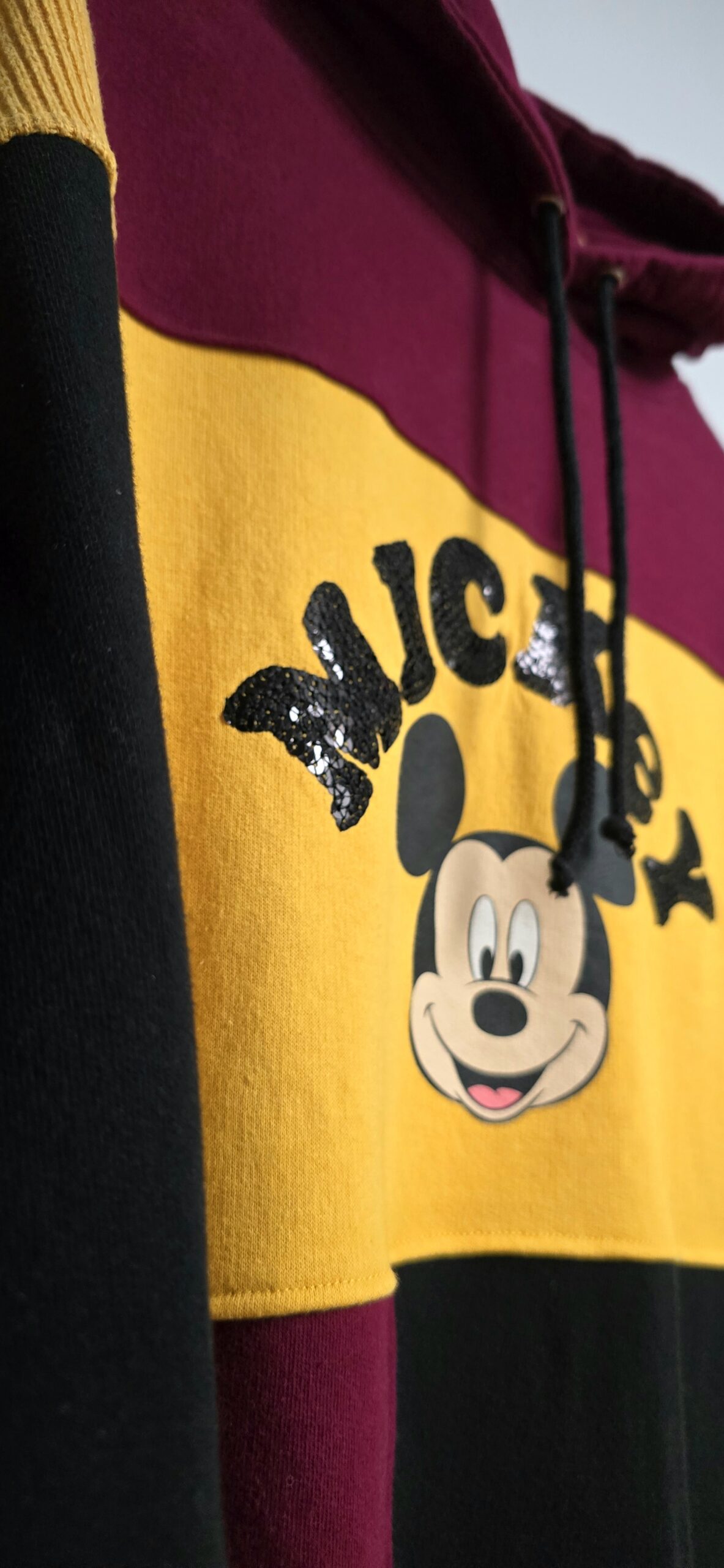 Zero nudy, maksimum oryginalności – ta bluza to projekt, którego nie znajdziesz nigdzie indziej. Każdy egzemplarz powstaje w pojedynczym wydaniu. A ta wyjątkowa bluza z Mickey Mouse, powstała z pięciu różnych bluz, które dostały drugie życie, a razem tworzą wyjątkową całość w stylu patchwork. Głównym akcentem bluzy oczywiście jest nadruk z Mickey Mouse, napis wykonany z cekinów. Bluza dodatkowo wyróżnia się fakturą, niektóre kawałki przypominają sweter.