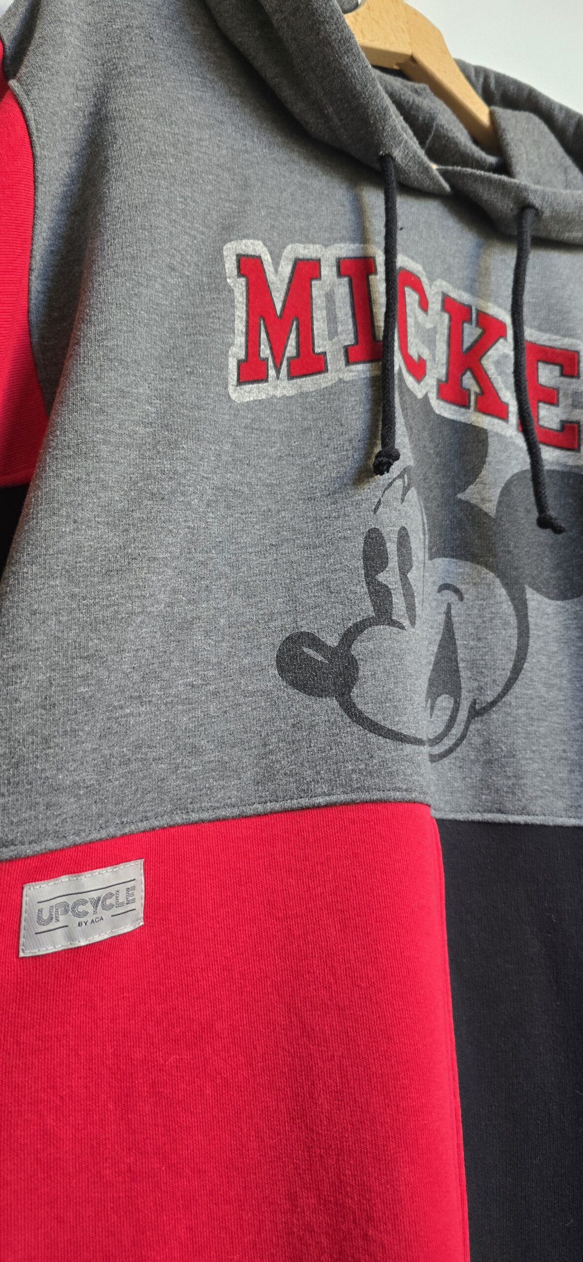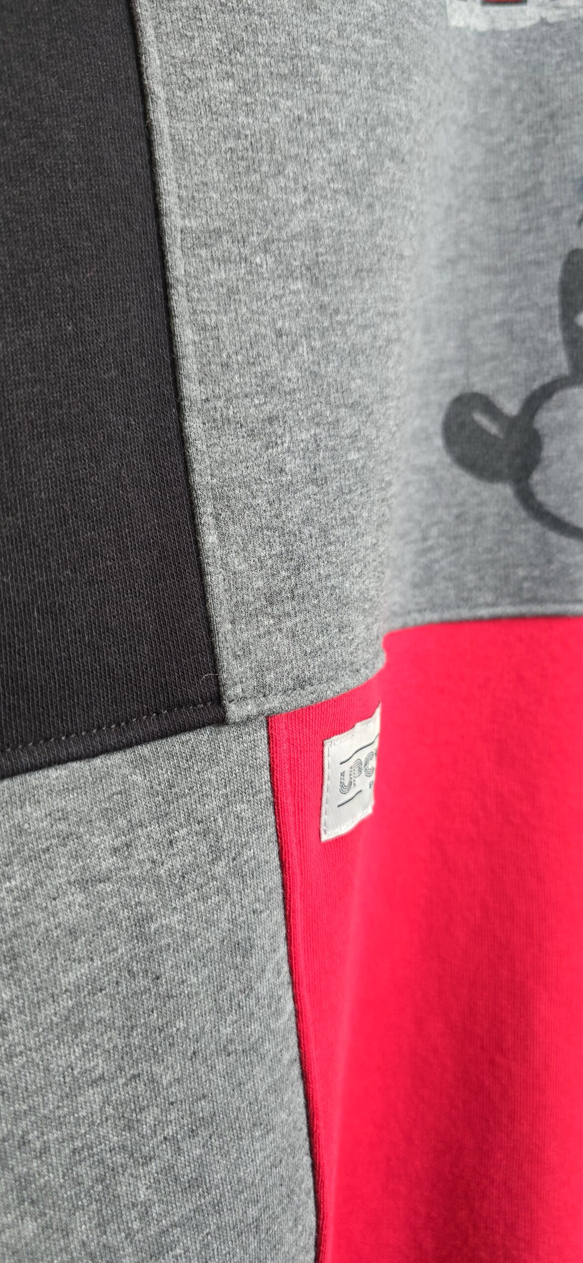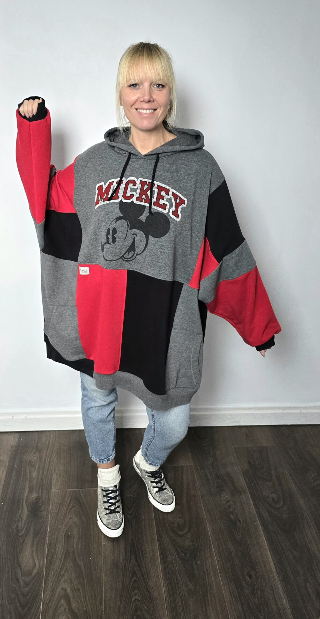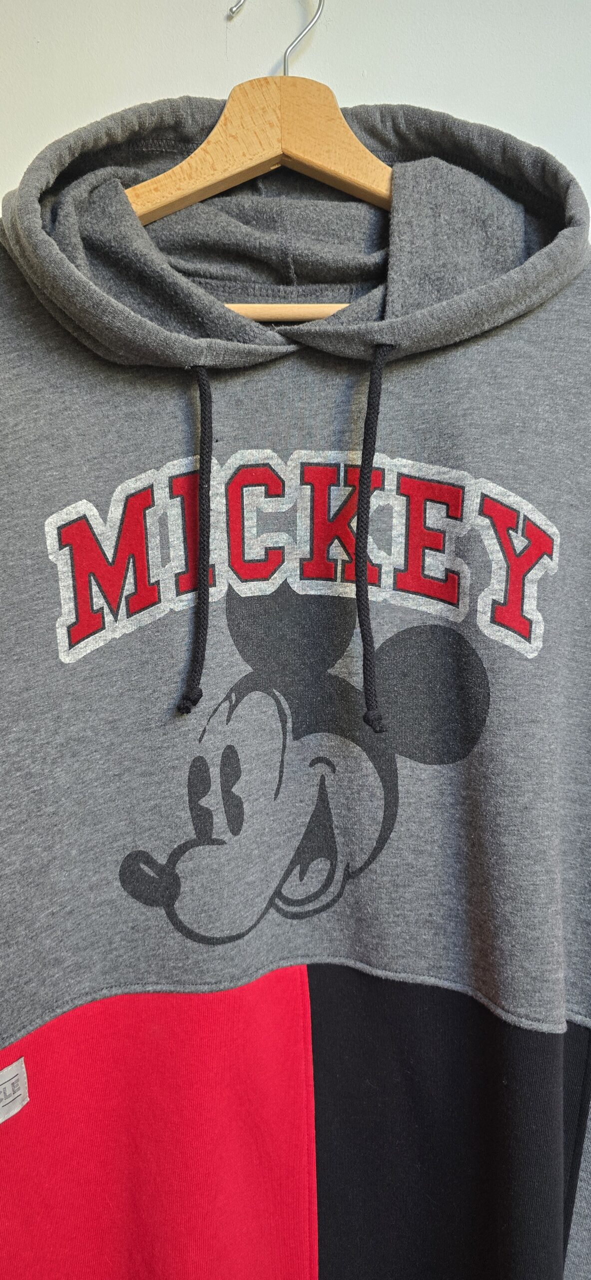 Zero nudy, maksimum oryginalności – ta bluza to projekt, którego nie znajdziesz nigdzie indziej. Każdy egzemplarz powstaje w pojedynczym wydaniu. A ta wyjątkowa bluza z Mickey Mouse, powstała z trzech różnych bluz i jednej pary spodni dresowych, które dostały drugie życie, a razem tworzą wyjątkową całość w stylu patchwork. Głównym akcentem bluzy oczywiście jest print z Mickey Mouse, uzupełniony soczystą czerwienią połączoną z czernią i szarością.