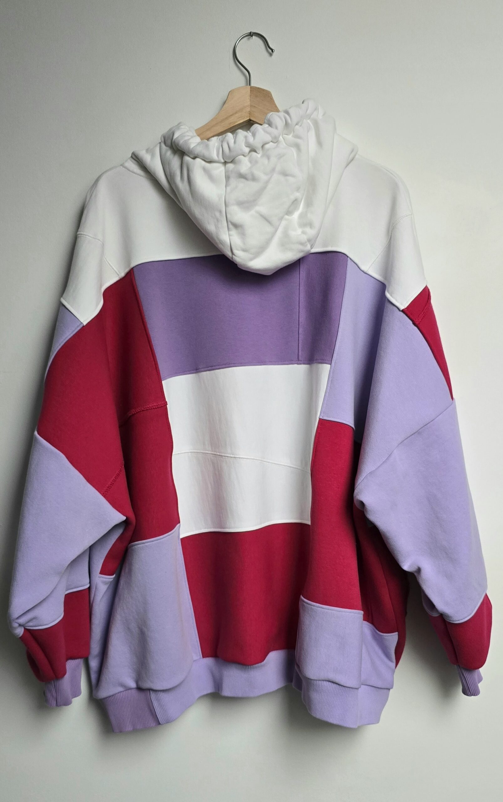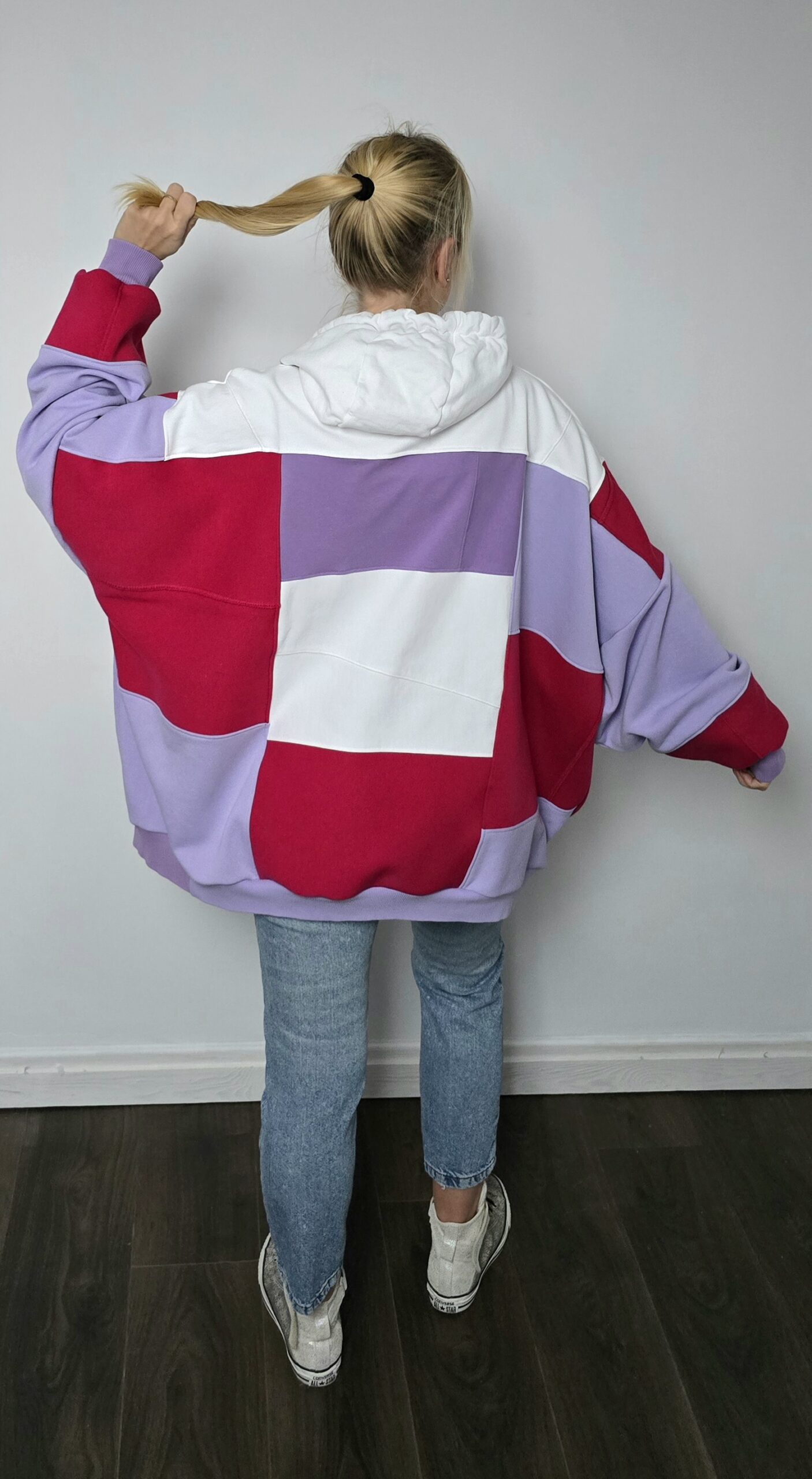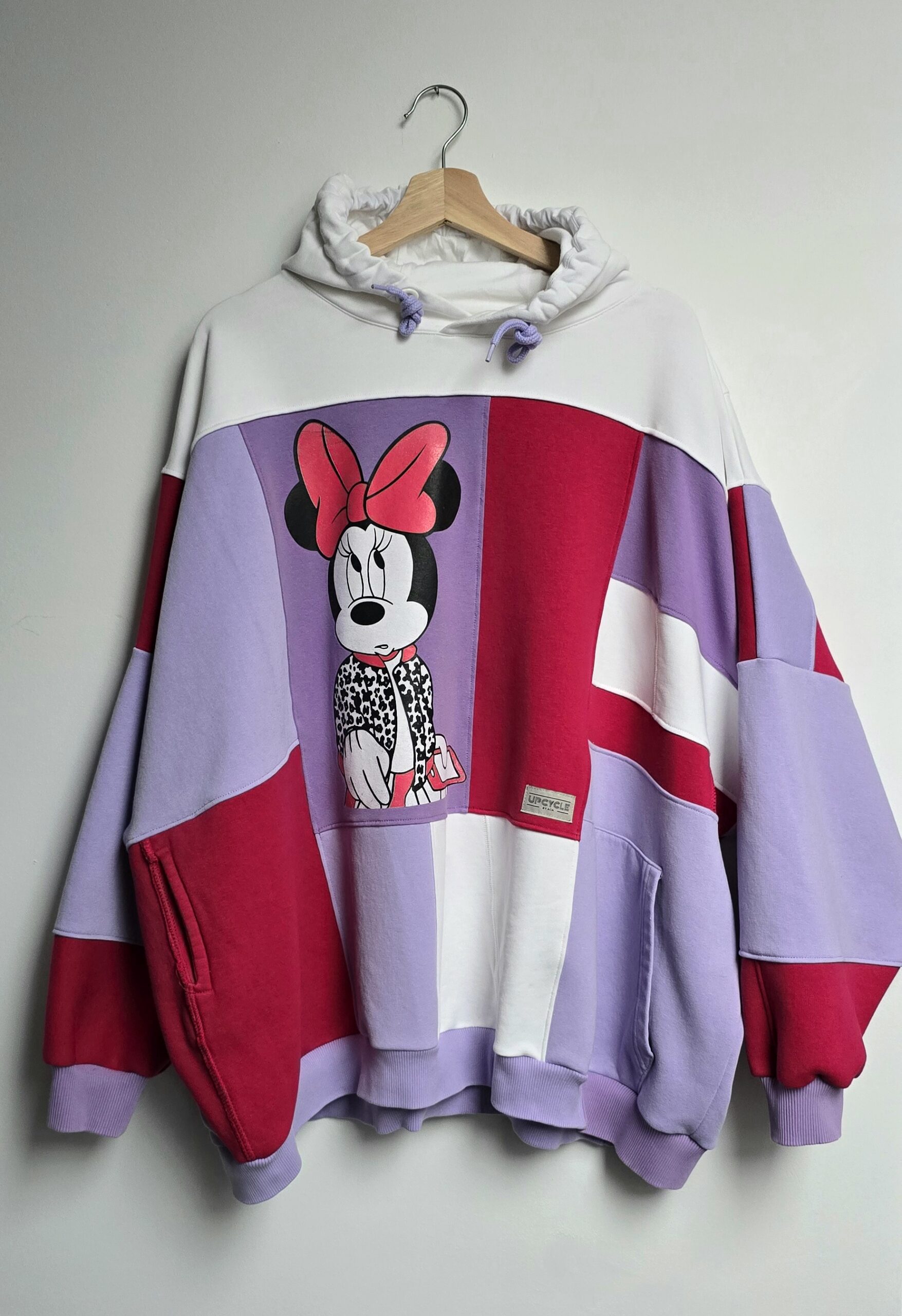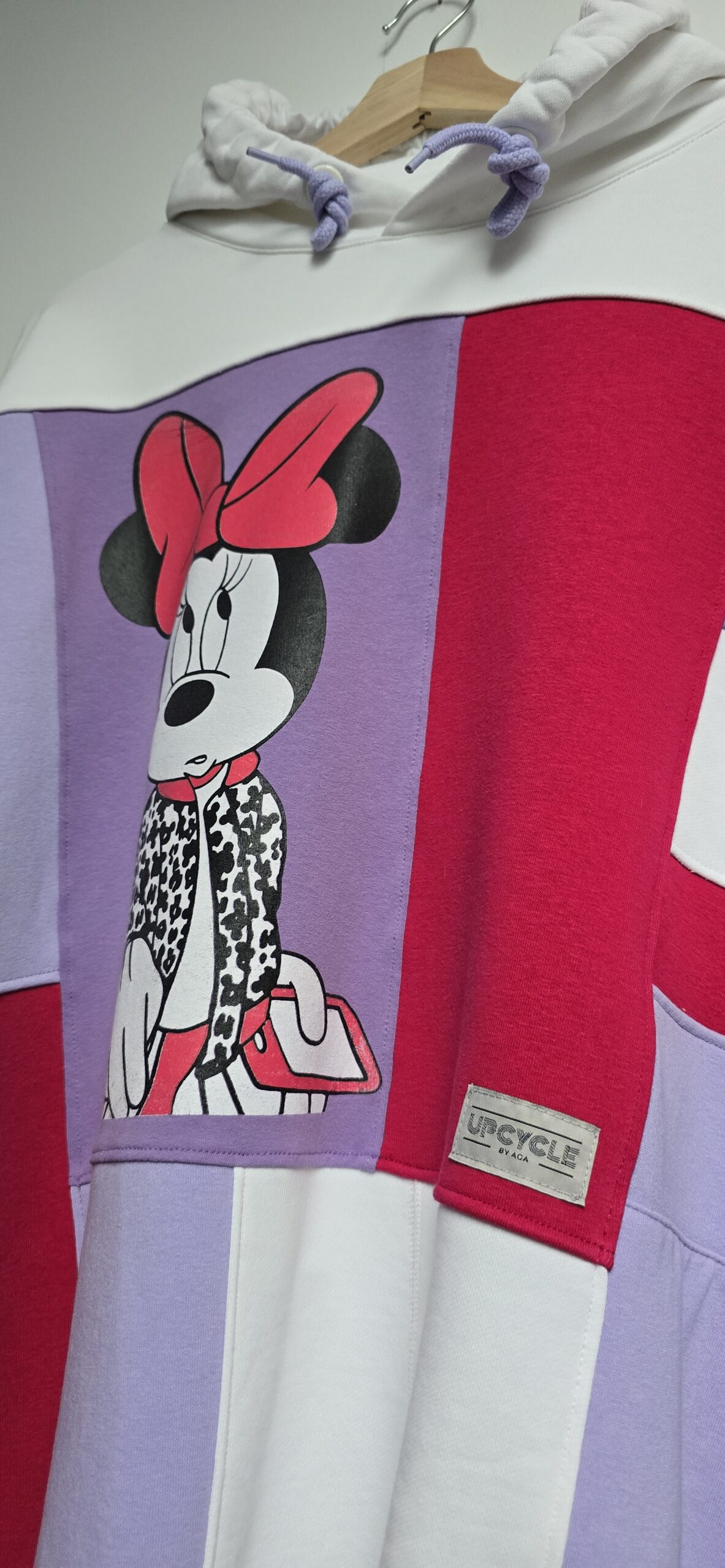 Ta bluza to manifest kreatywności i idei upcyclingu. Powstała z trzech różnych bluz, oraz spodni dresowych, które dostały drugie życie, a razem tworzą wyjątkową całość w stylu patchwork. Głównym akcentem bluzy jest grafika z Minnie Mouse w różowej kokardzie na głowie.