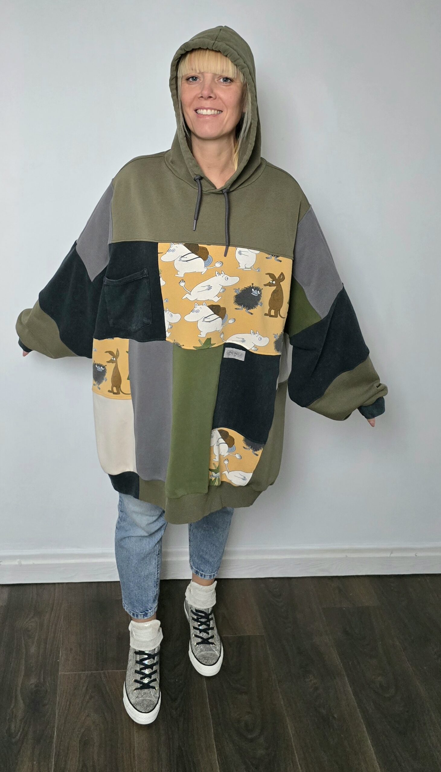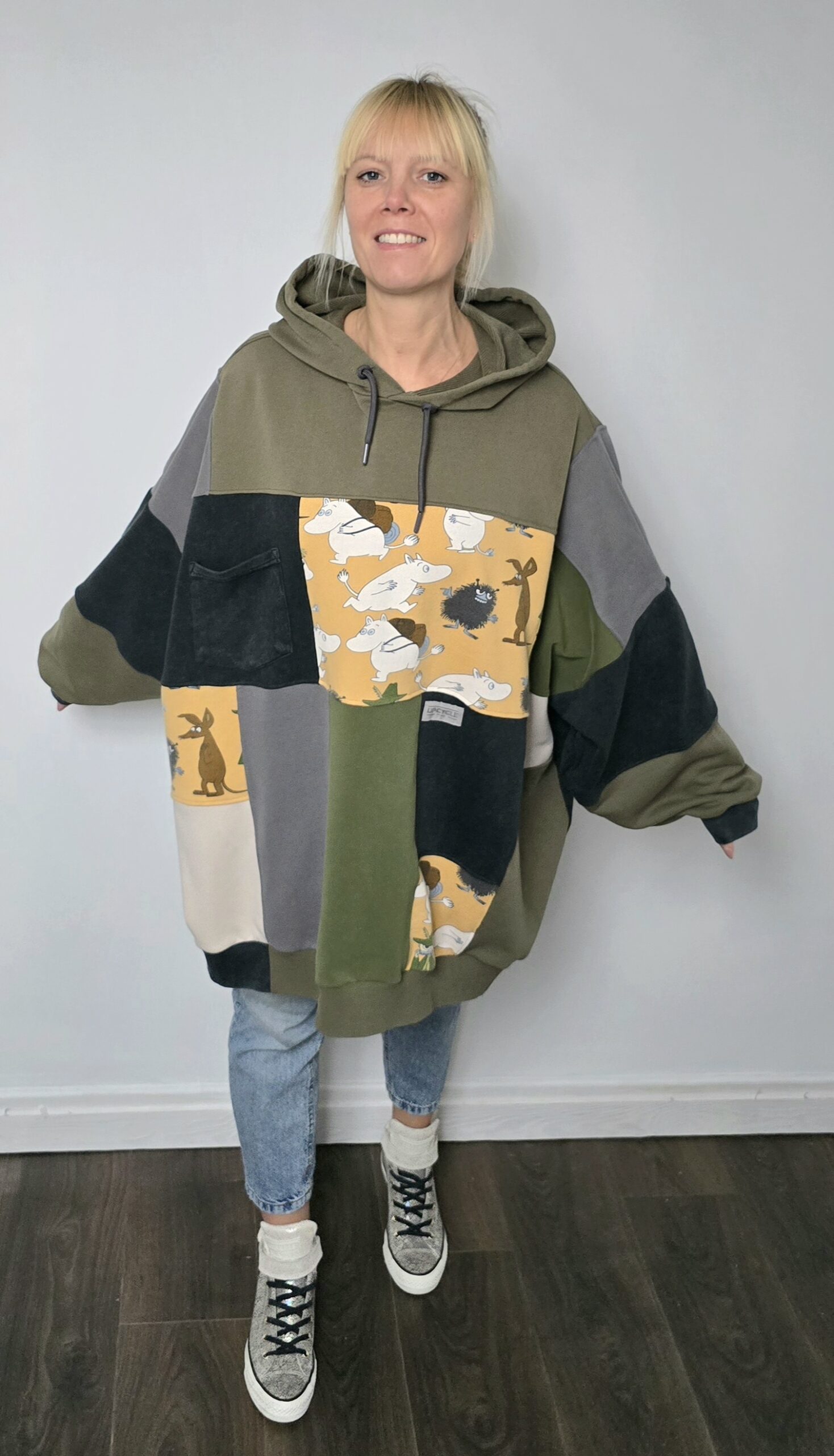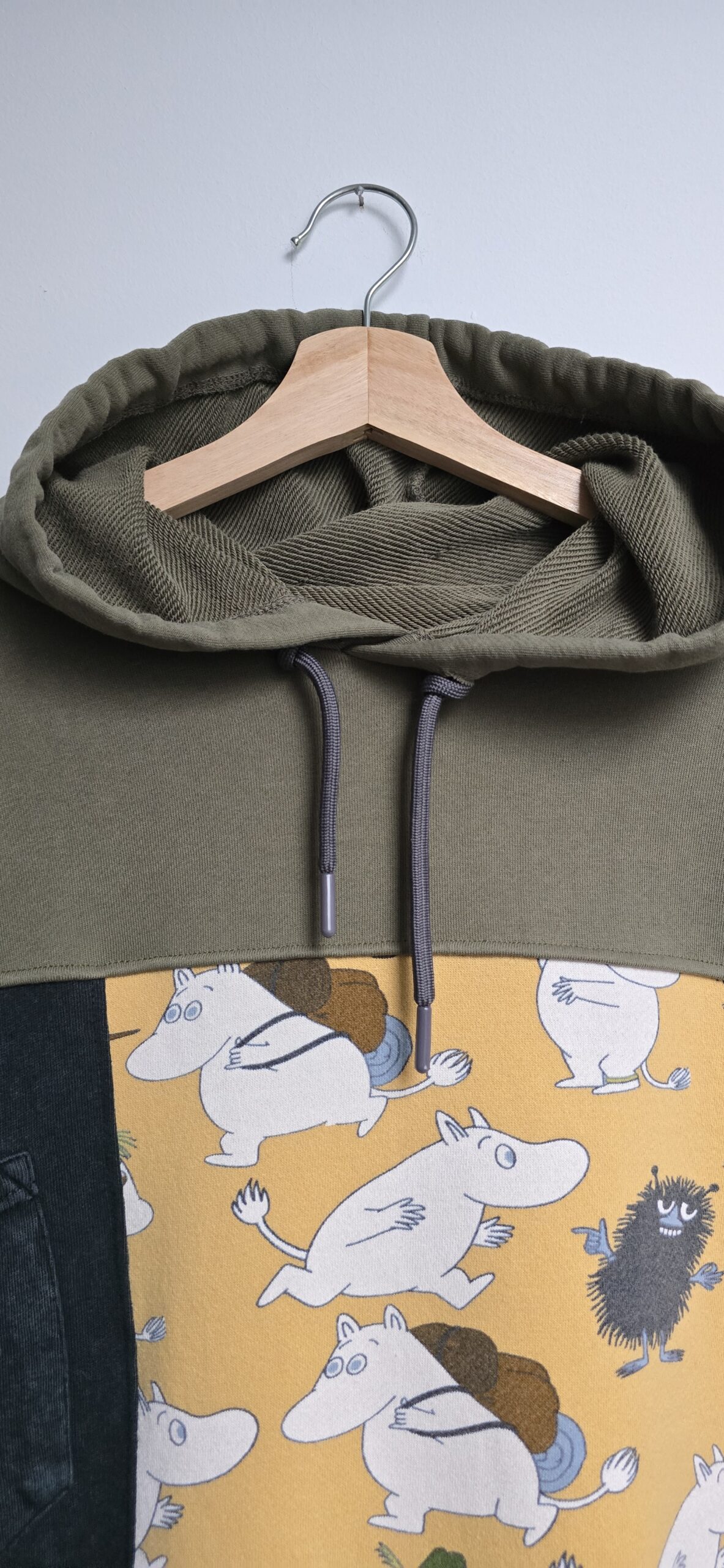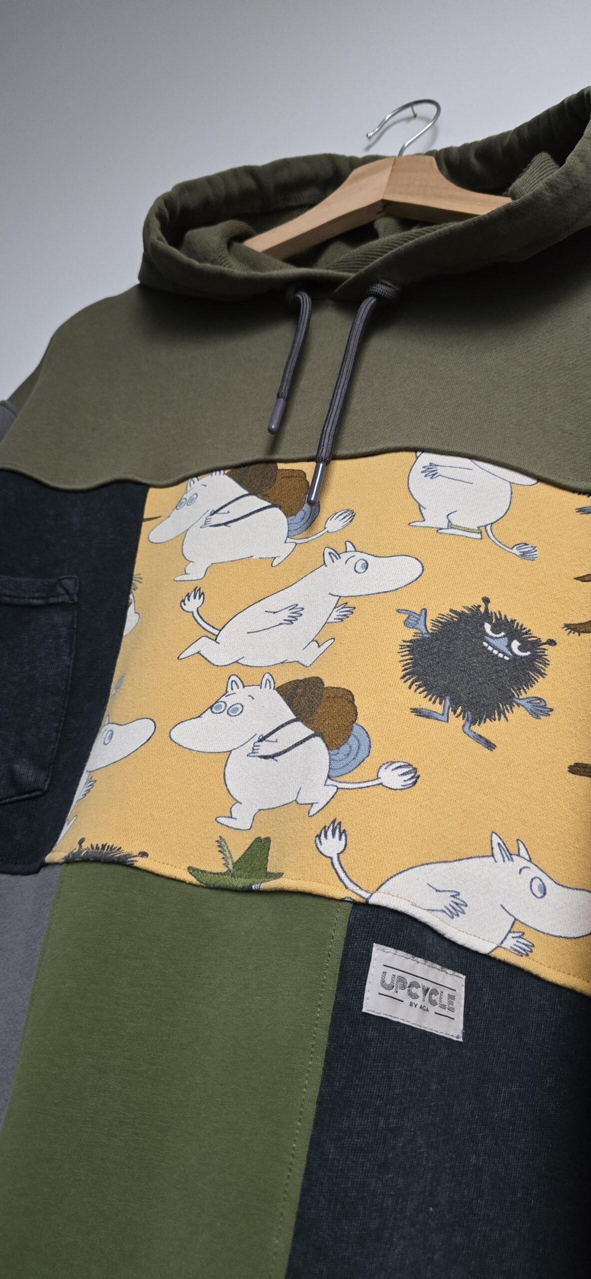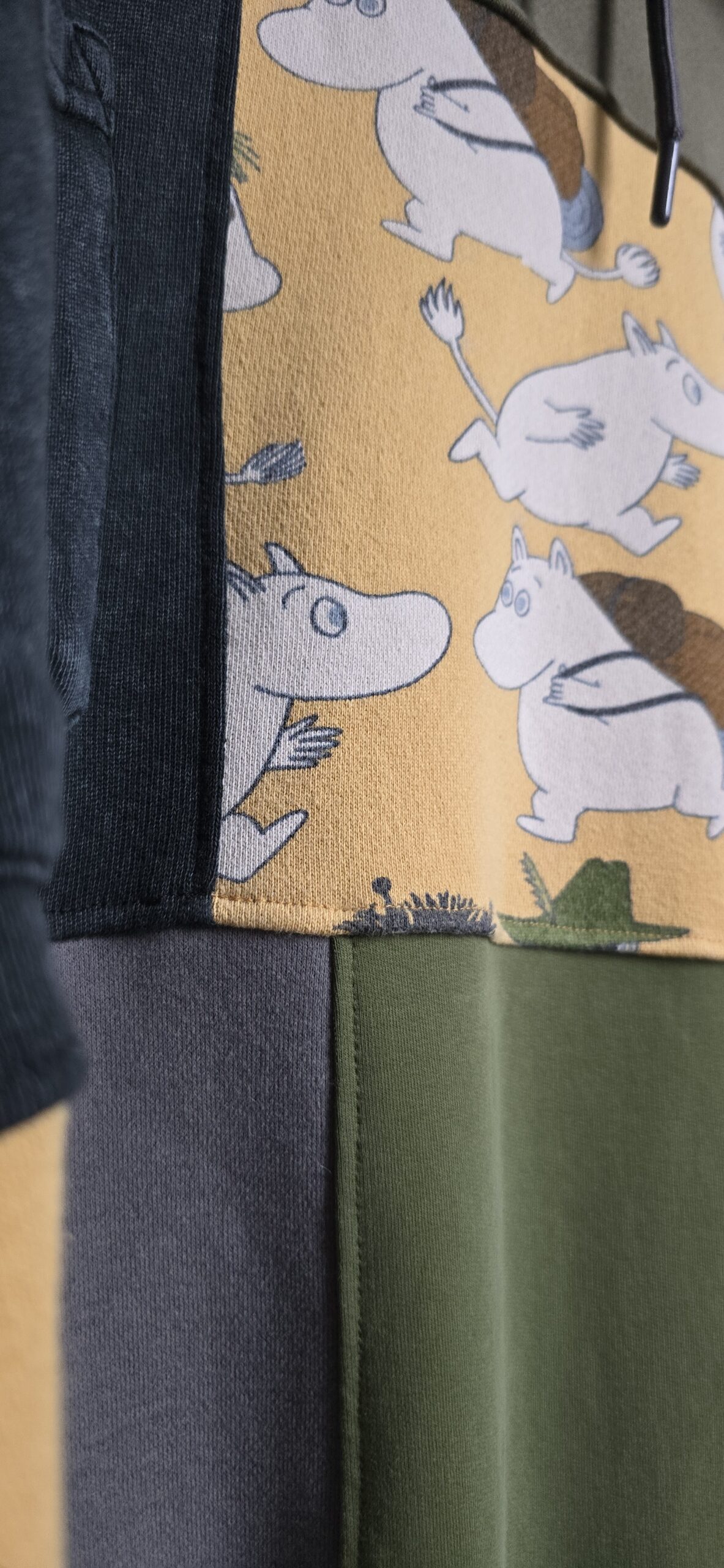 Moda bez kompromisów: wygodna, piękna i w 100% unikatowa. Bluza uszyta ręcznie z sześciu bluz. Za sprawą kreatywności i świetnego projektu została stworzona wyjątkowa całość w stylu patchwork. Głównym akcentem bluzy jest print z Muminkami, Włóczykijem, Ryjkiem oraz Bobkiem. Wyjątkowa, obłędnie wygodna, zachęca do przygód na łonie natury w stylu naszych ukochanych bohaterów z dzieciństwa.