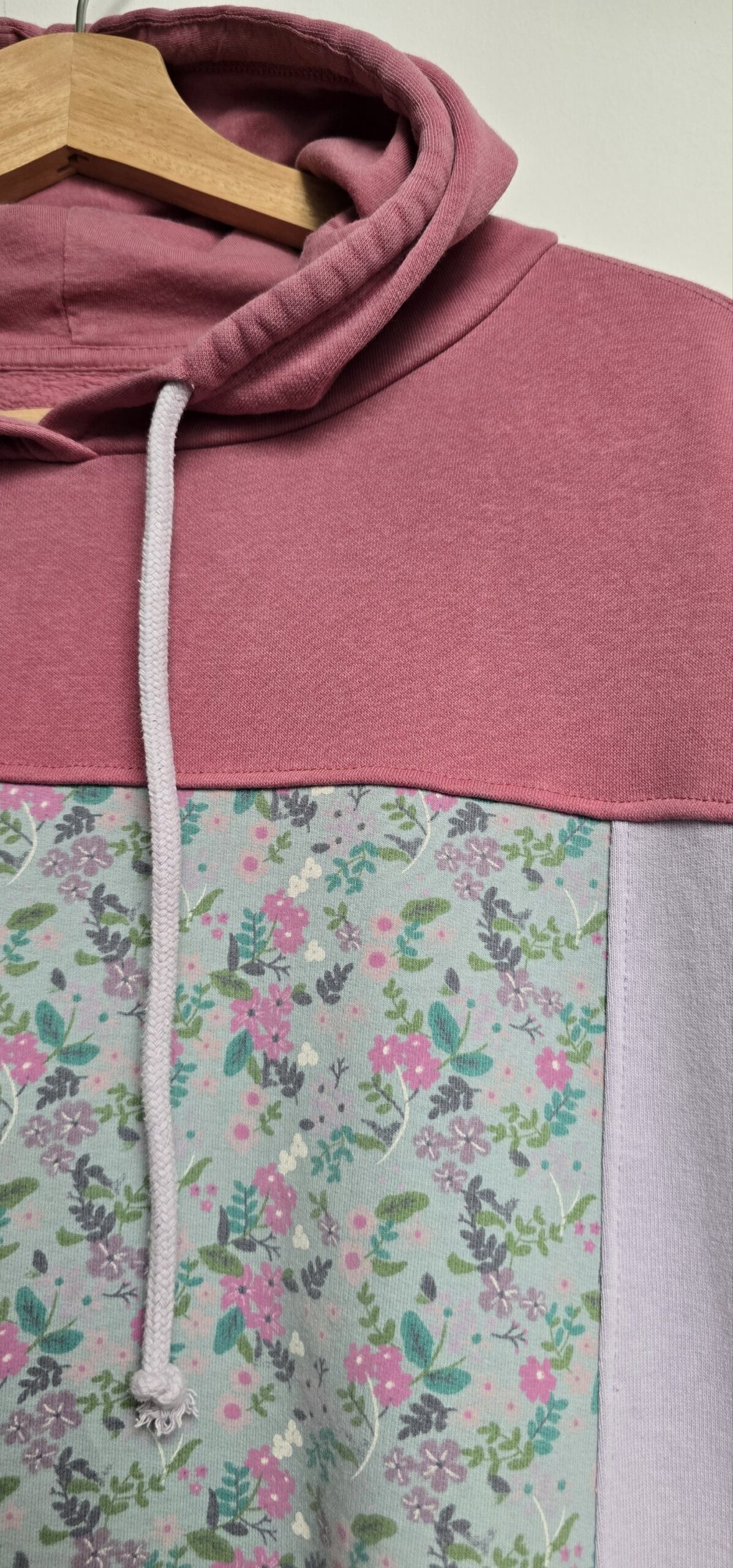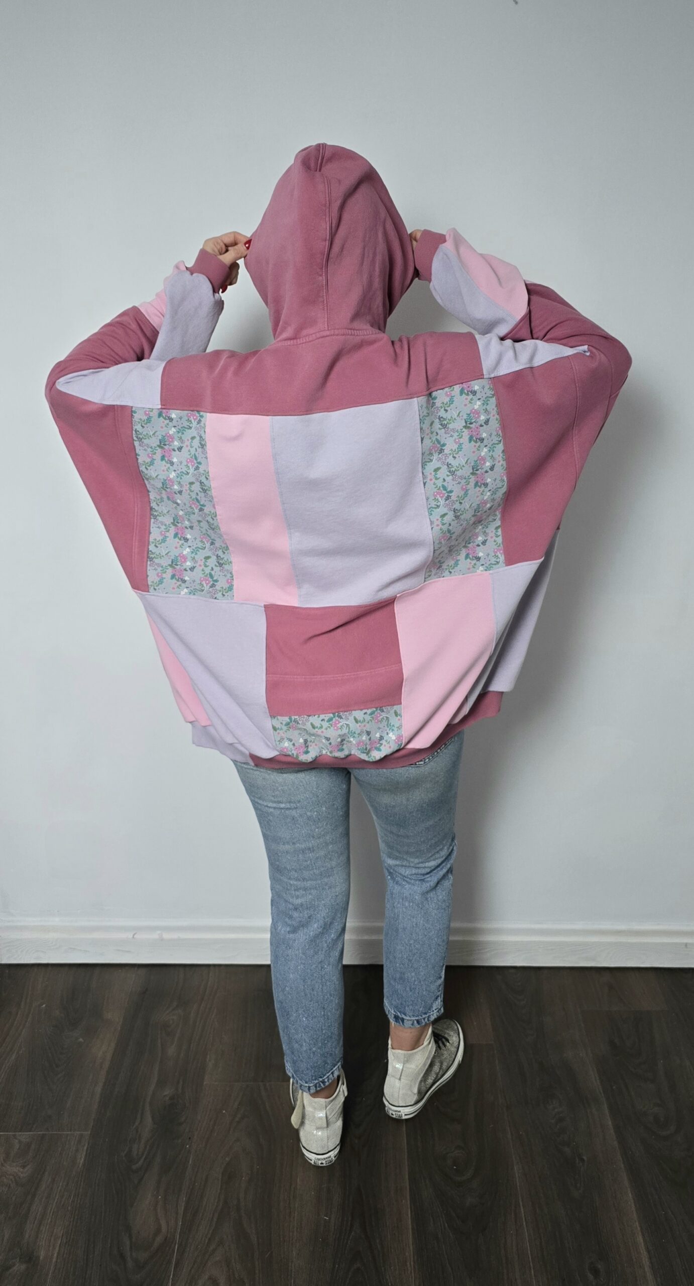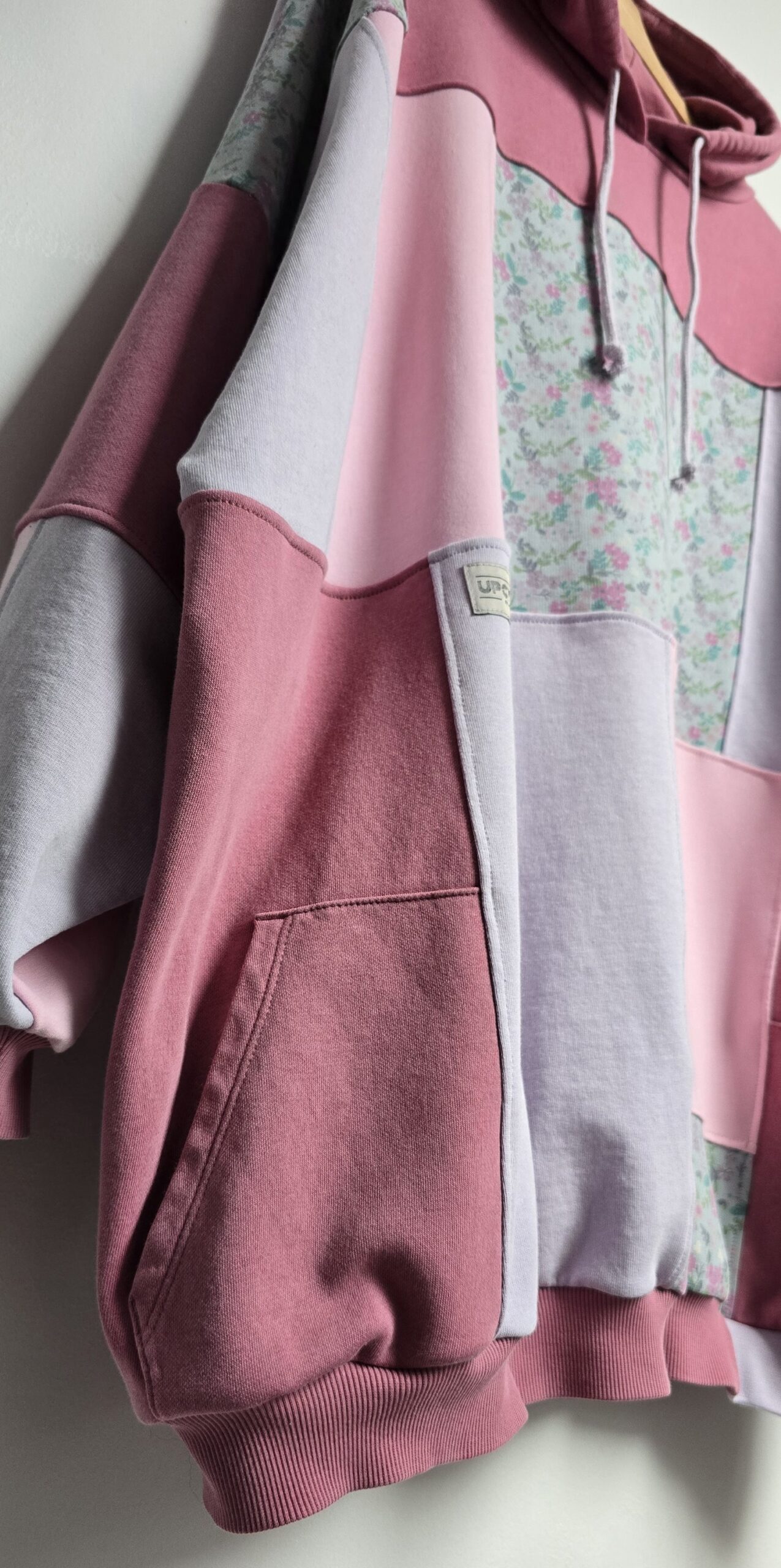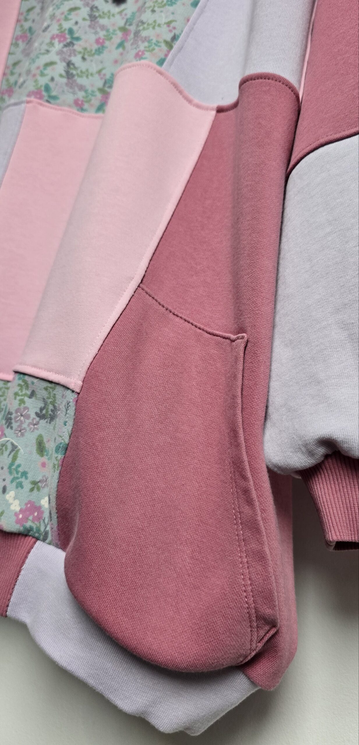 Upcycling w praktyce: bluza uszyta z czterech odzyskanych bluz, w której różnorodność materiałów tworzy spójny, wyrazisty styl. Głównym akcentem bluzy jest print przedstawiający wiosenne kolorowe kwiatki, do tego dodane spójnie pasujące kolory tworzą idealną całość bluzy oversize large w jednym, unikatowym wydaniu.