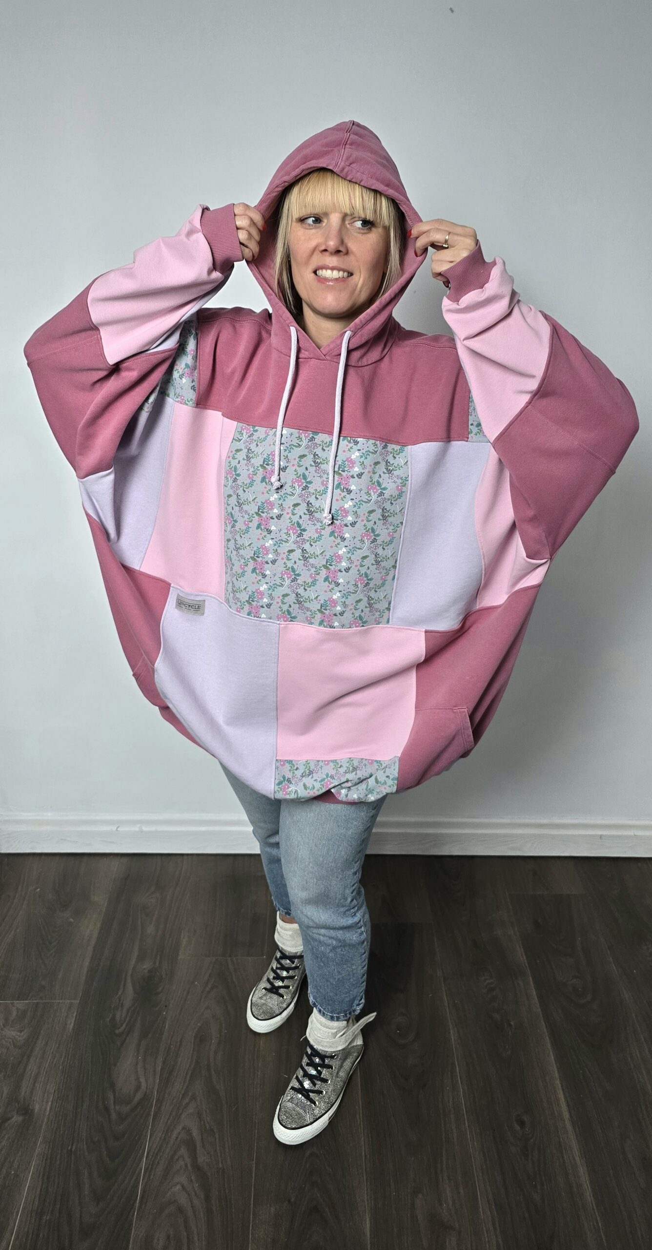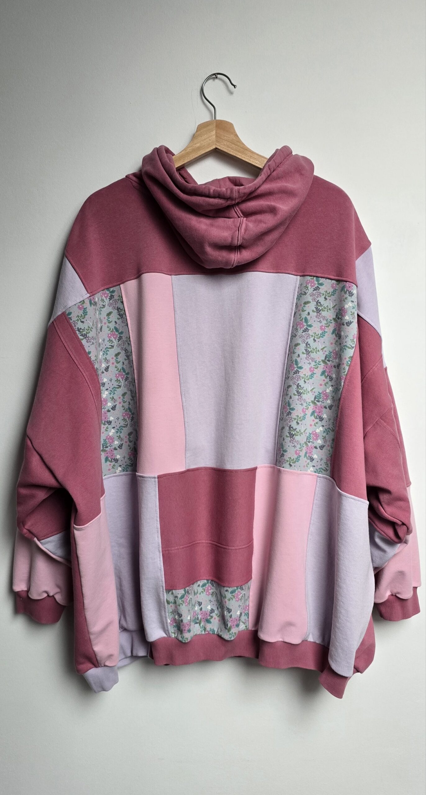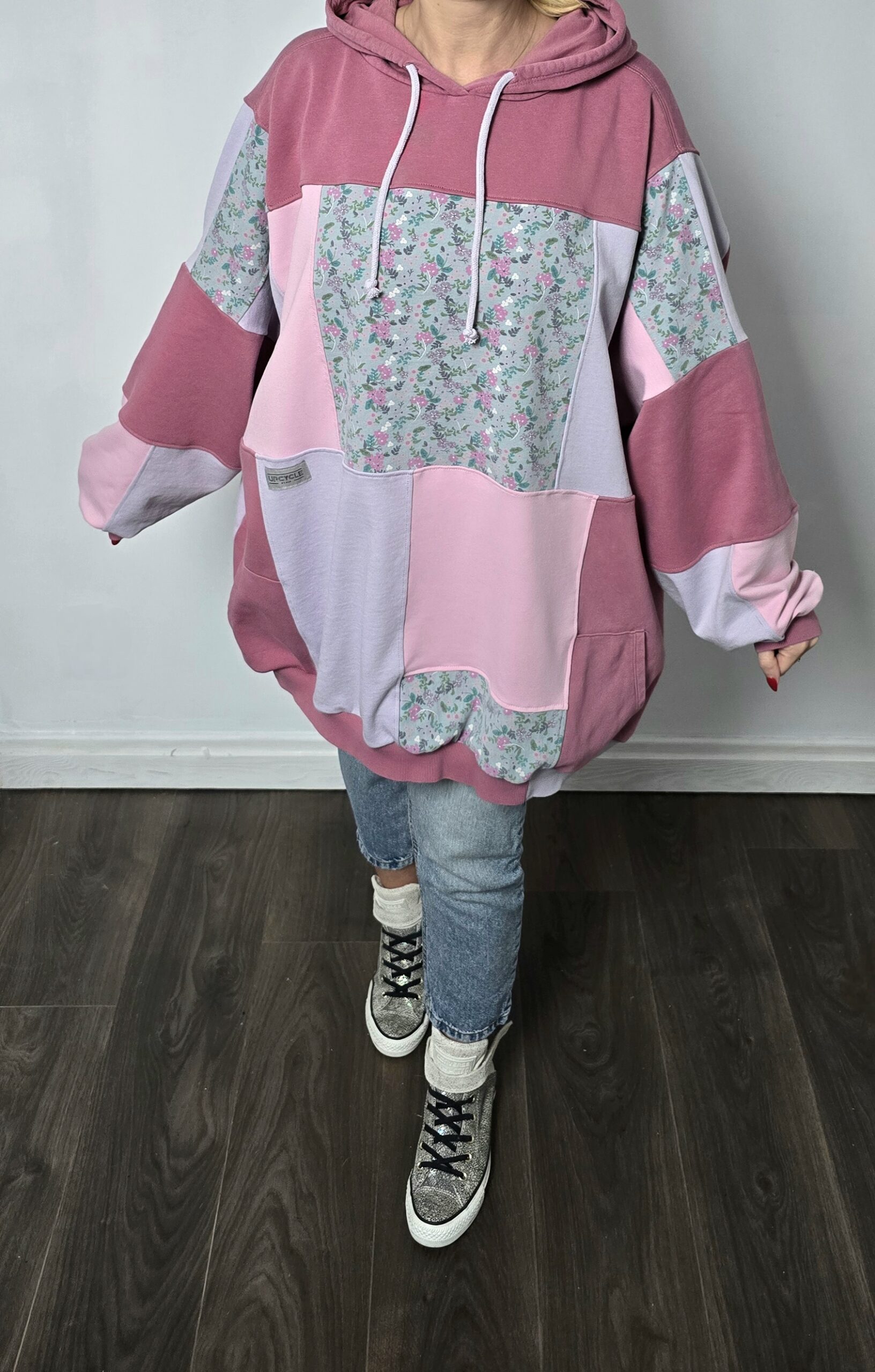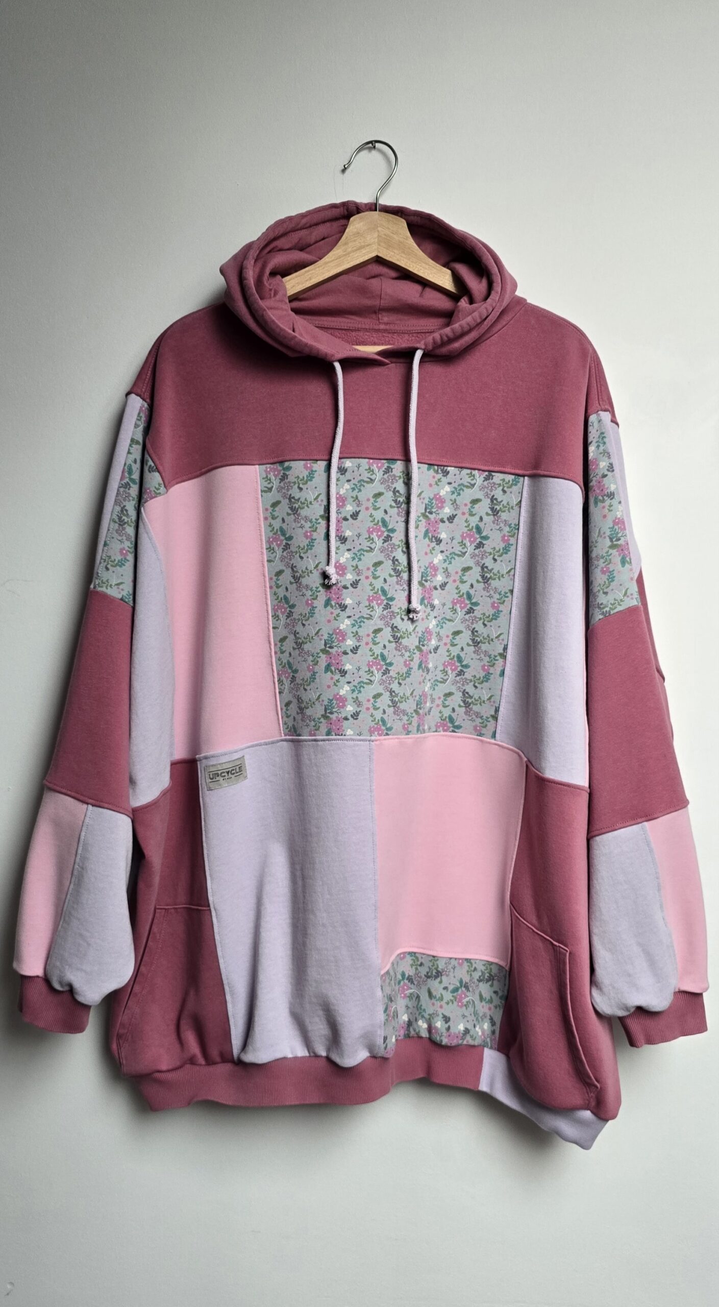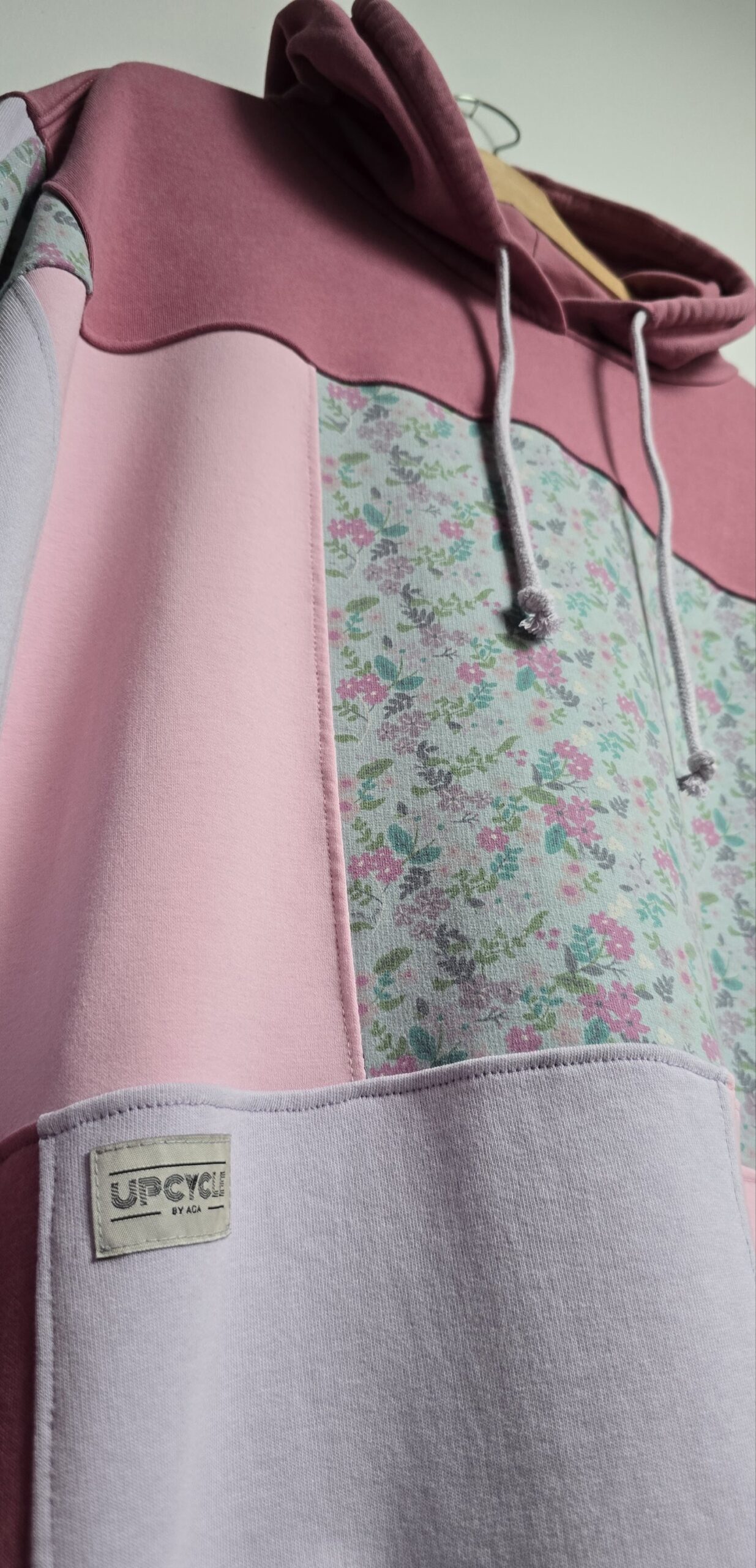 Upcycling w praktyce: bluza uszyta z czterech odzyskanych bluz, w której różnorodność materiałów tworzy spójny, wyrazisty styl. Głównym akcentem bluzy jest print przedstawiający wiosenne kolorowe kwiatki, do tego dodane spójnie pasujące kolory tworzą idealną całość bluzy oversize large w jednym, unikatowym wydaniu.