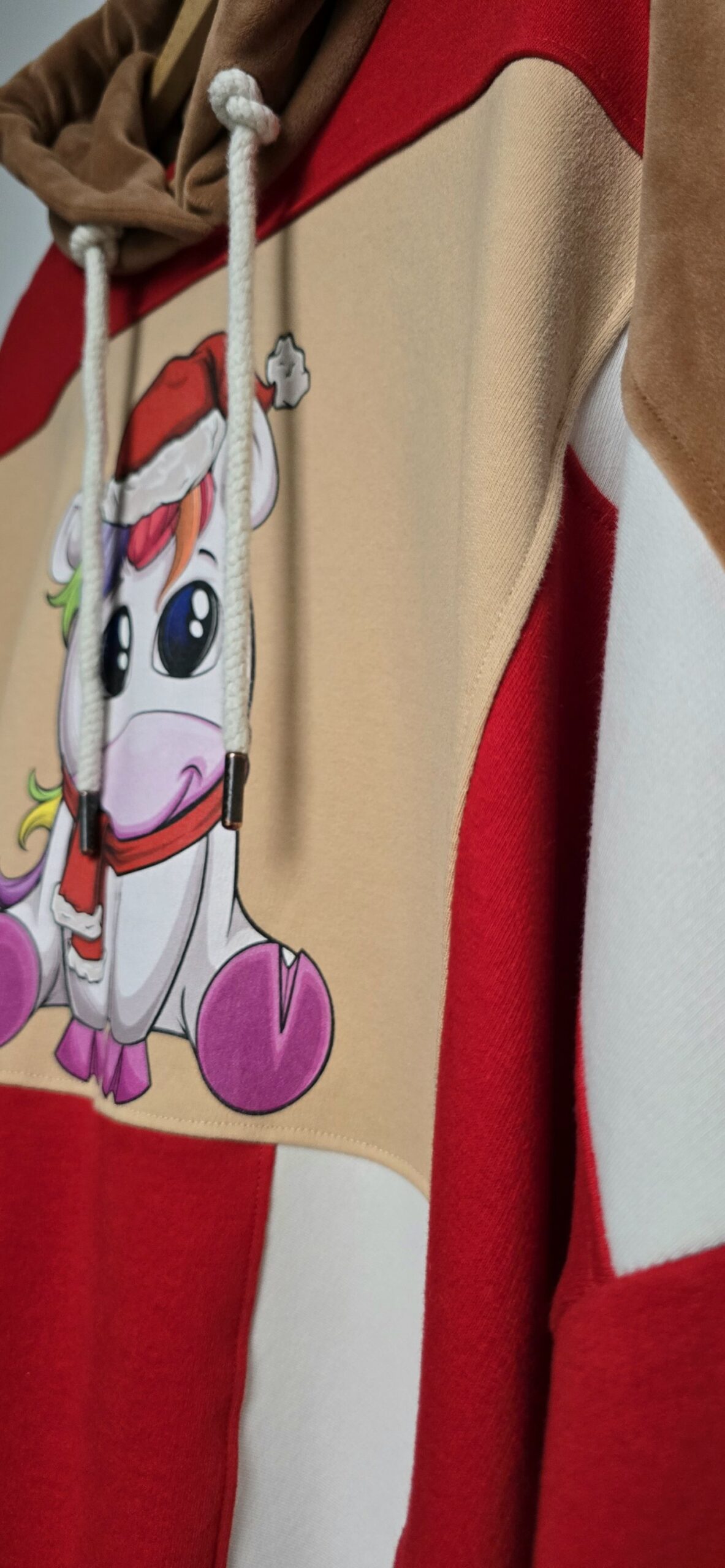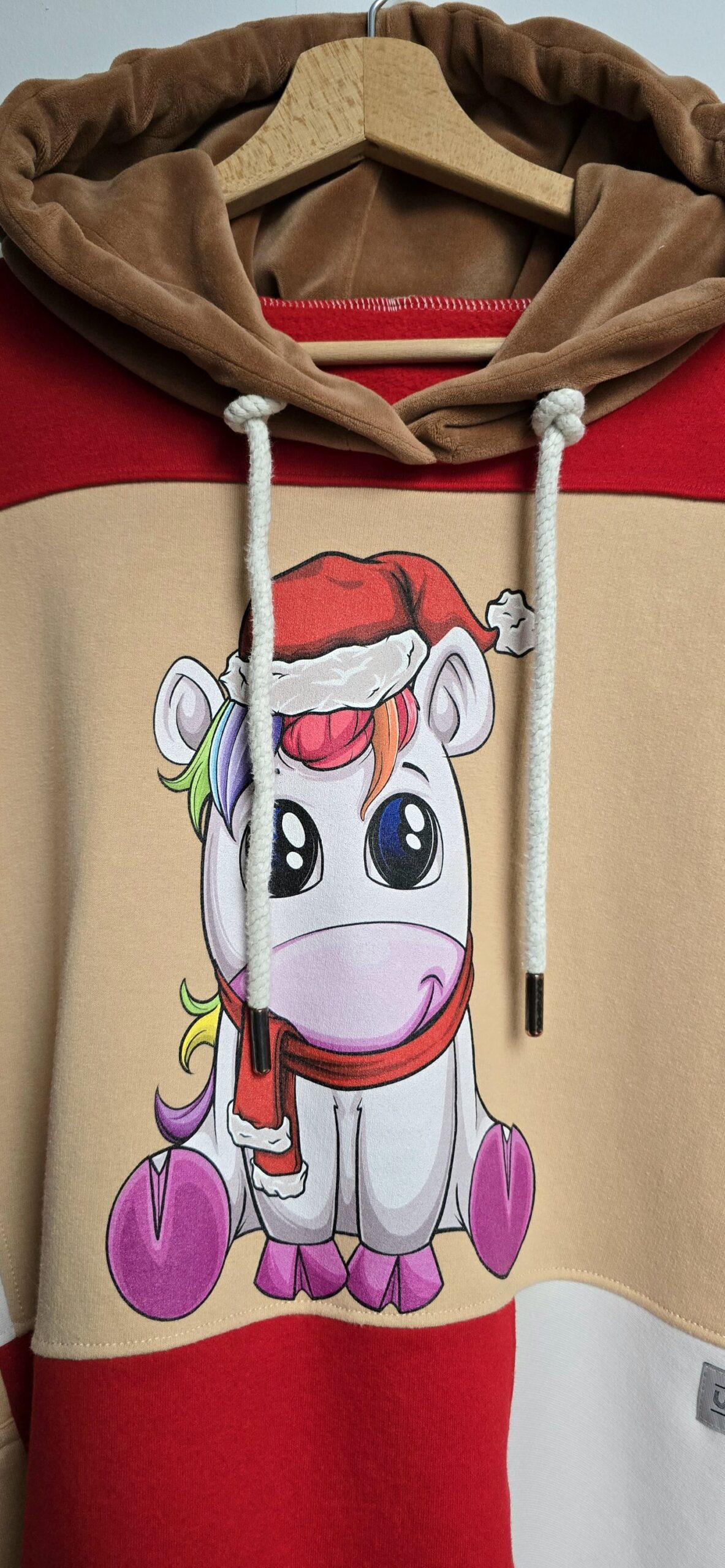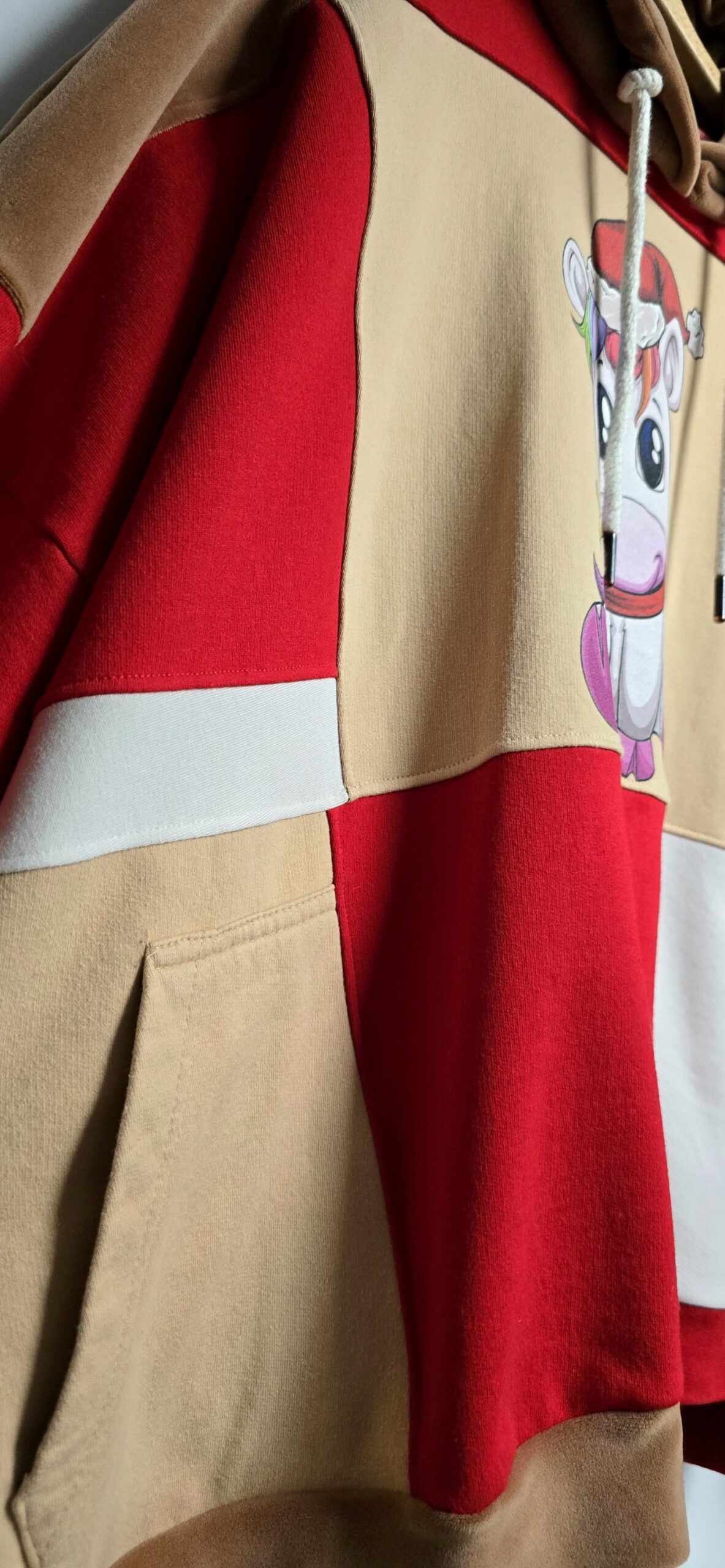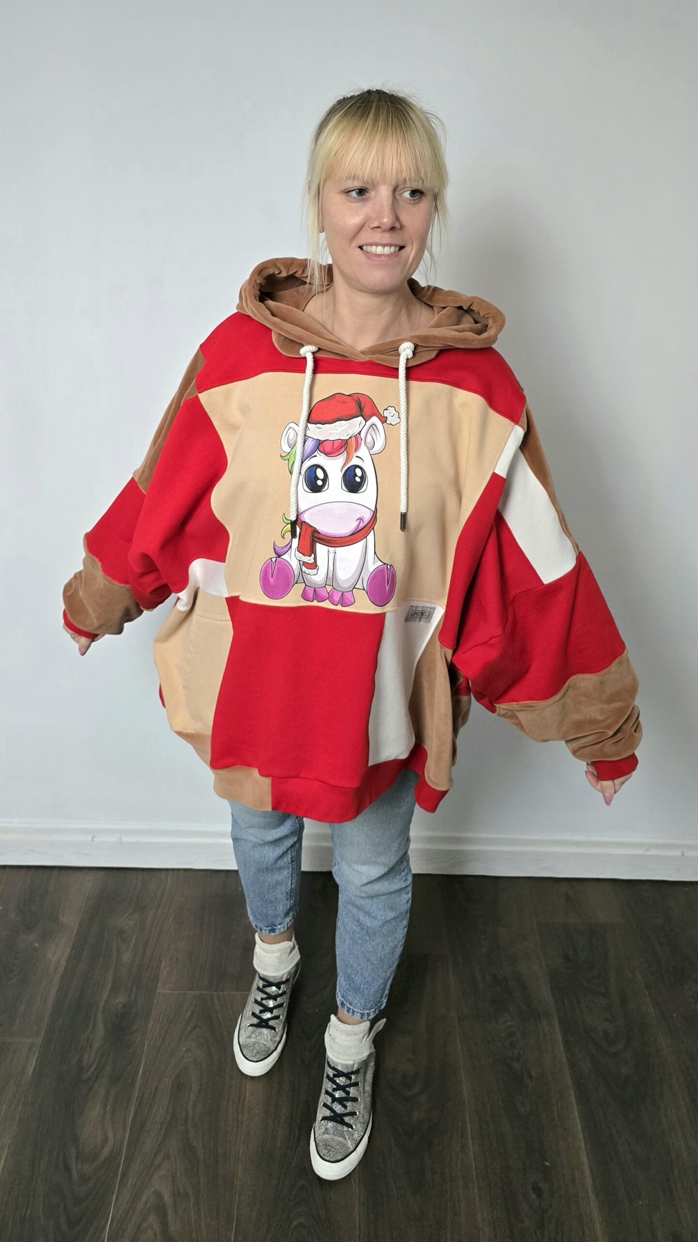 Kolor, odwaga i świąteczny klimat – ta bluza powstała z miksu czterech bluz, które dostały drugie życie. Dzięki temu każdy egzemplarz ma swój własny, niepowtarzalny charakter. Głównym akcentem bluzy jest śliczny mały jednorożec w czapce Mikołaja. Piękne kolory i wyjątkowy nadruk, tworzą idealną całość bluzy oversize large w jednym, unikatowym wydaniu.