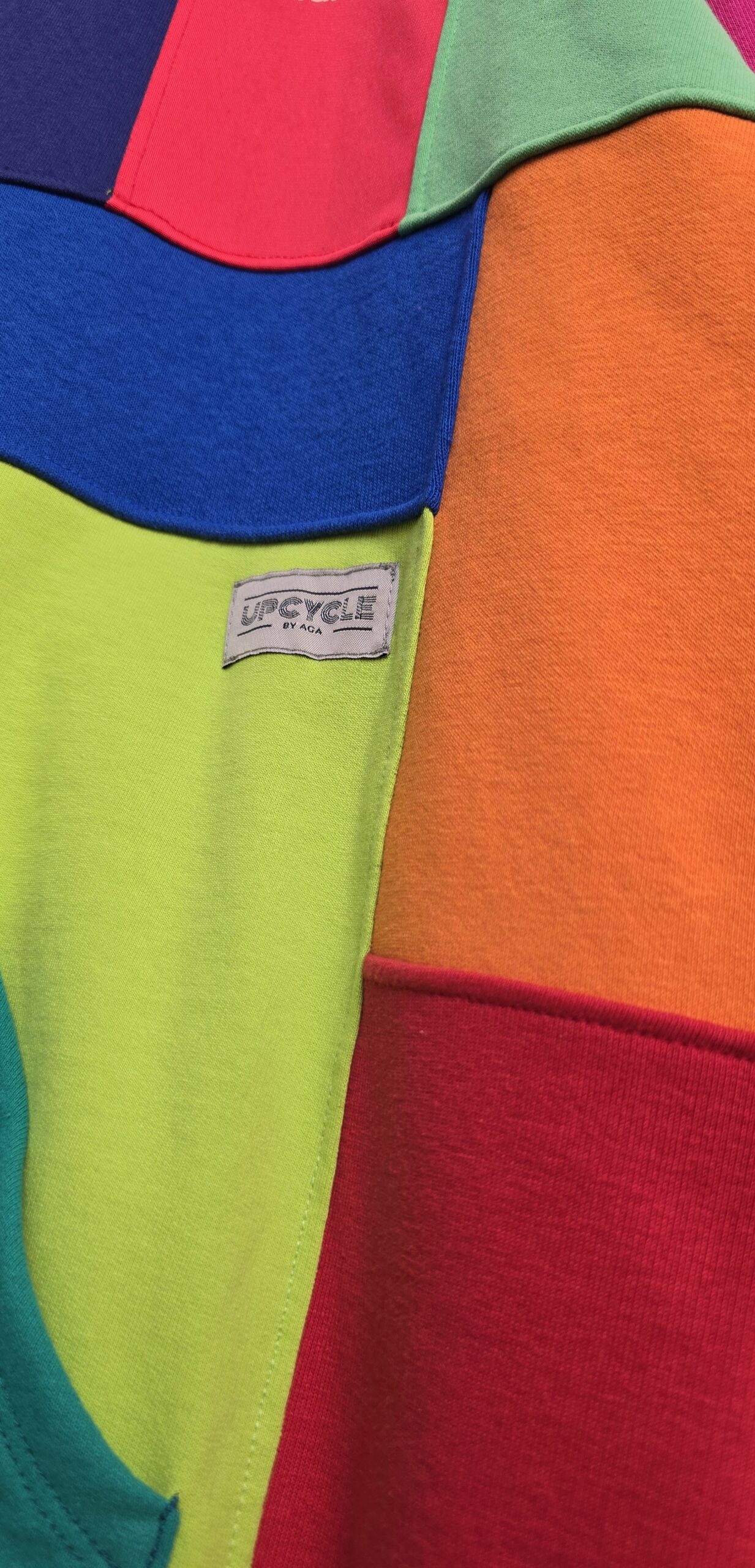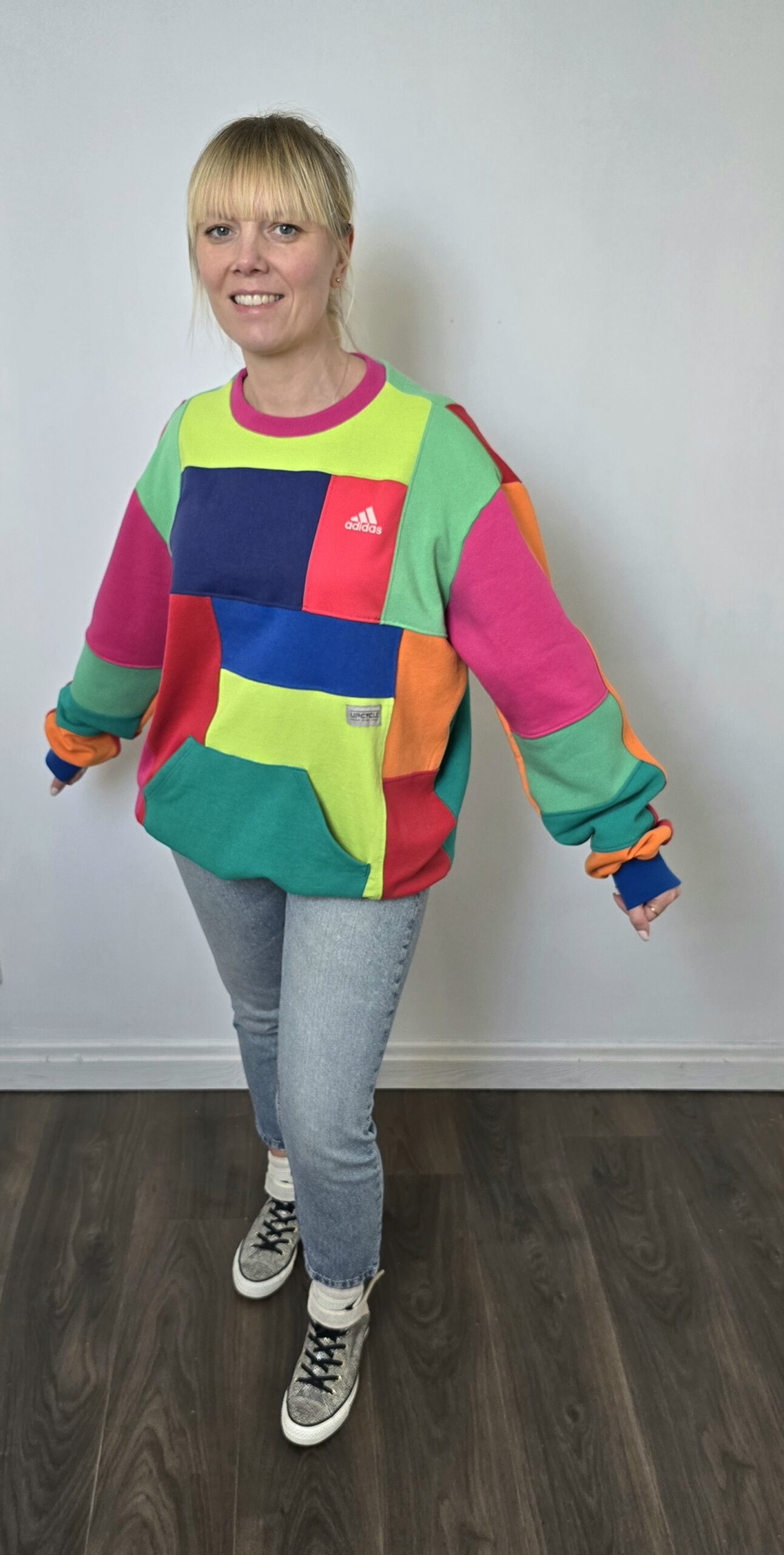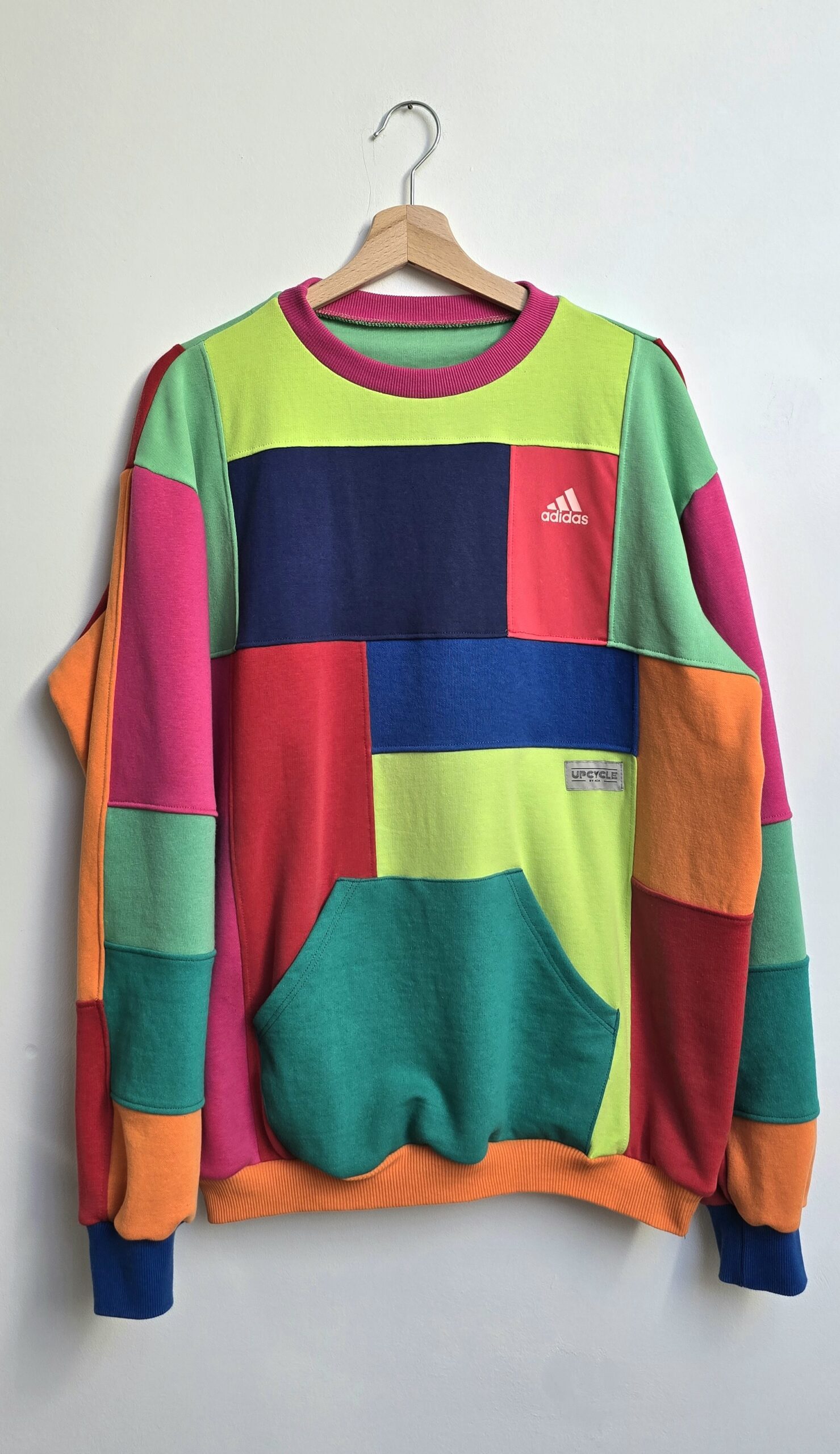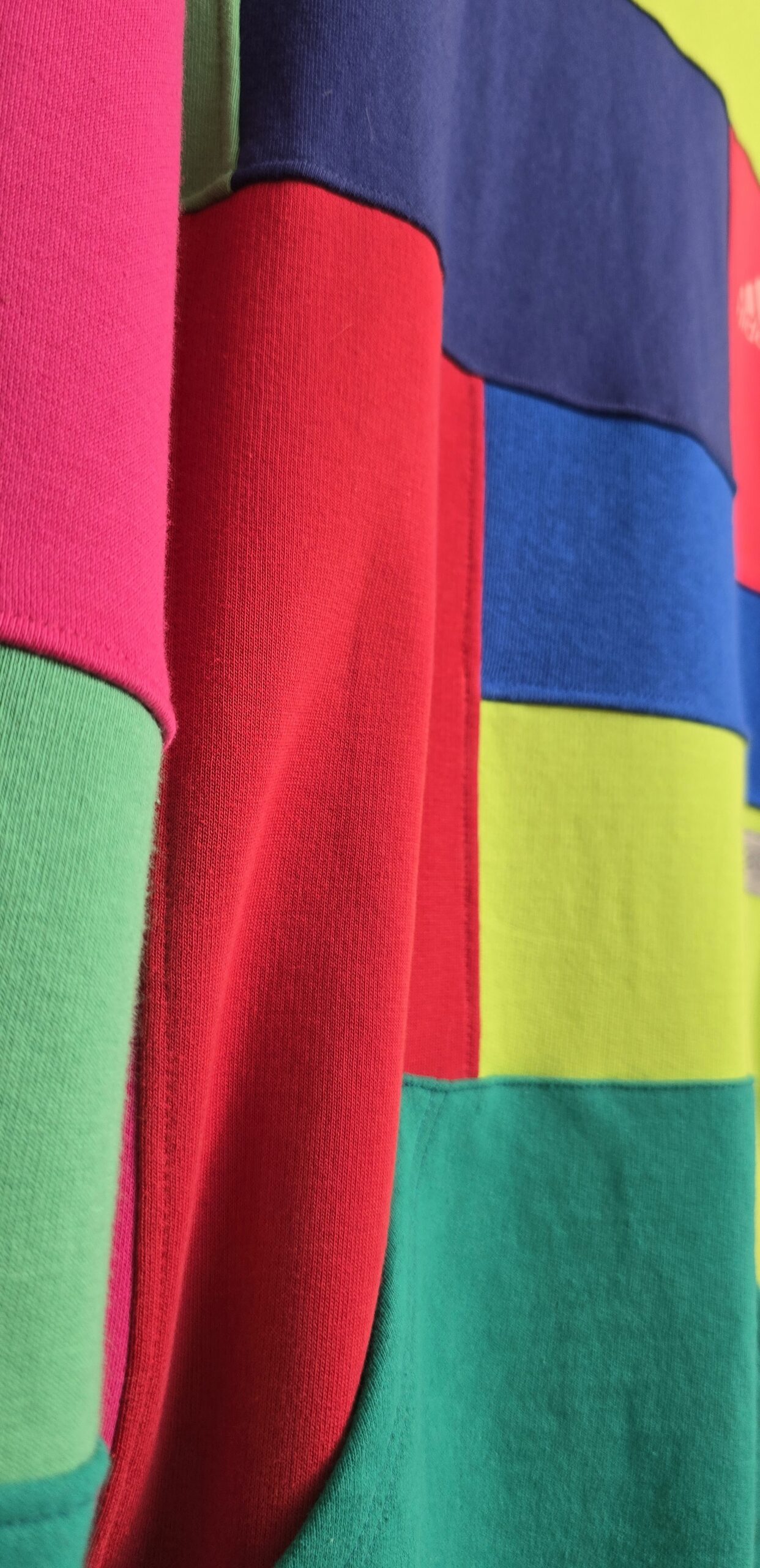 Zero nudy, maksimum oryginalności – ta bluza to projekt, którego nie znajdziesz nigdzie indziej. Każdy egzemplarz powstaje w pojedynczym wydaniu. Stworzona z mieszanki różnych ścinków po bluzach, które dostały drugie życie, a razem tworzą wyjątkową całość w stylu patchwork. Głównym akcentem bluzy jest niewielkie logo “Adidas”, oraz żywe kolory, z których jest stworzona.