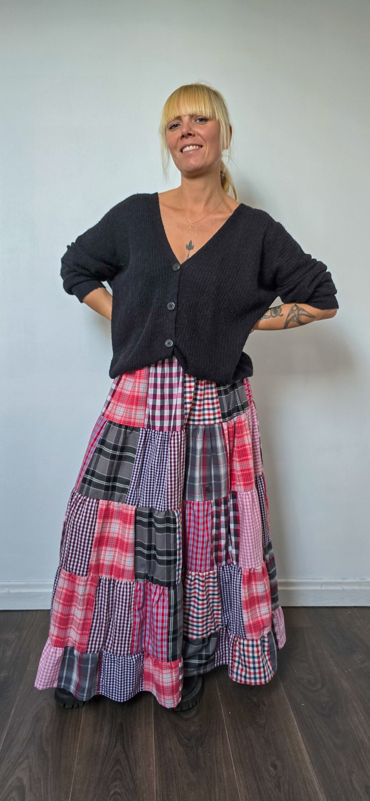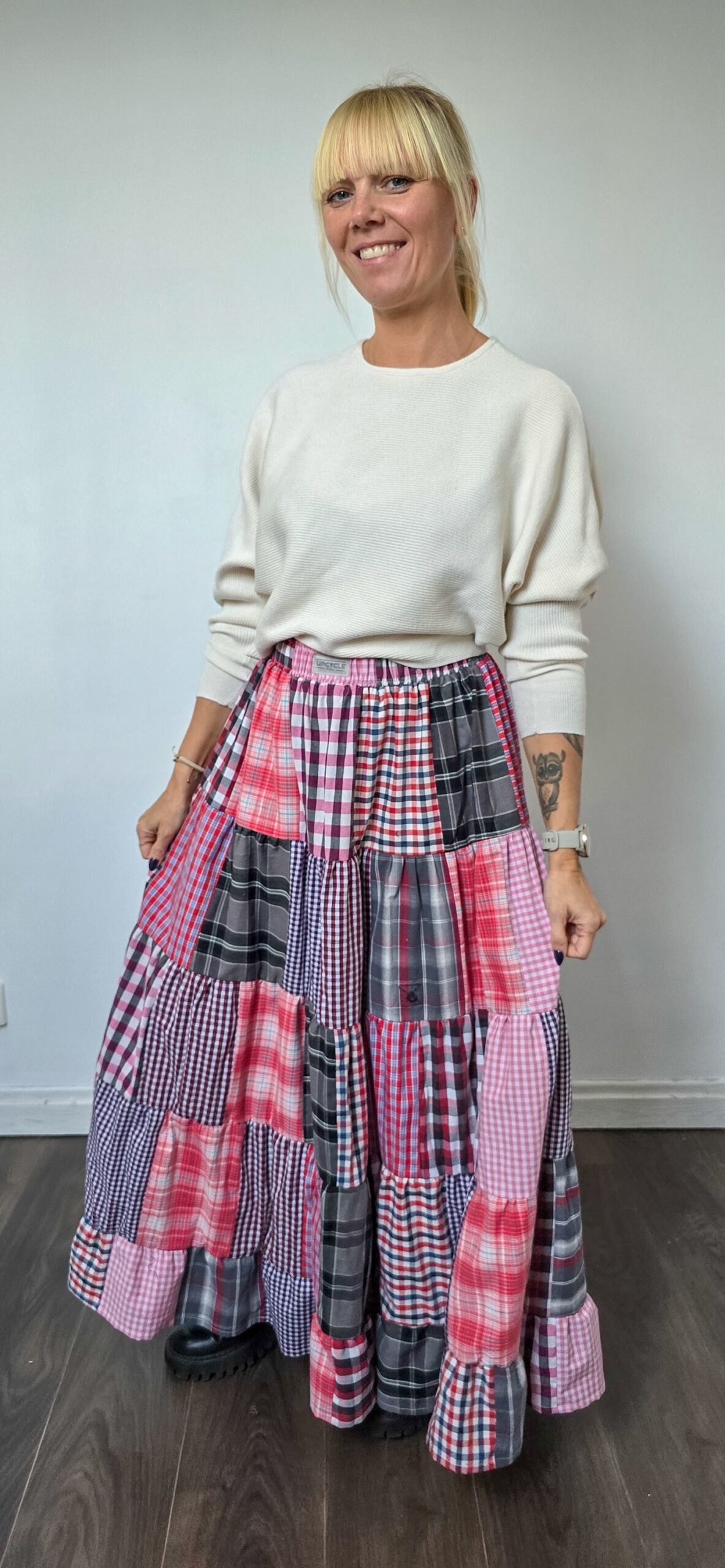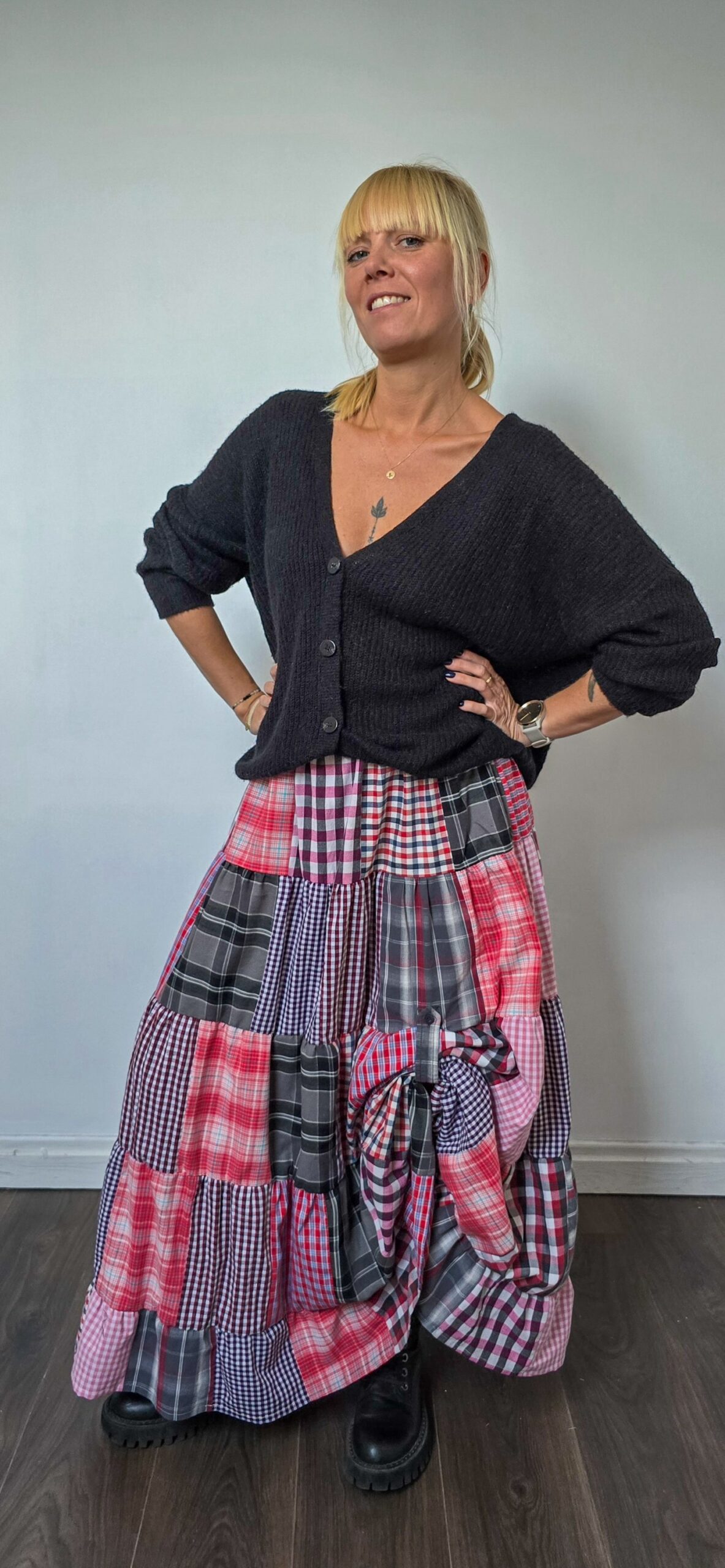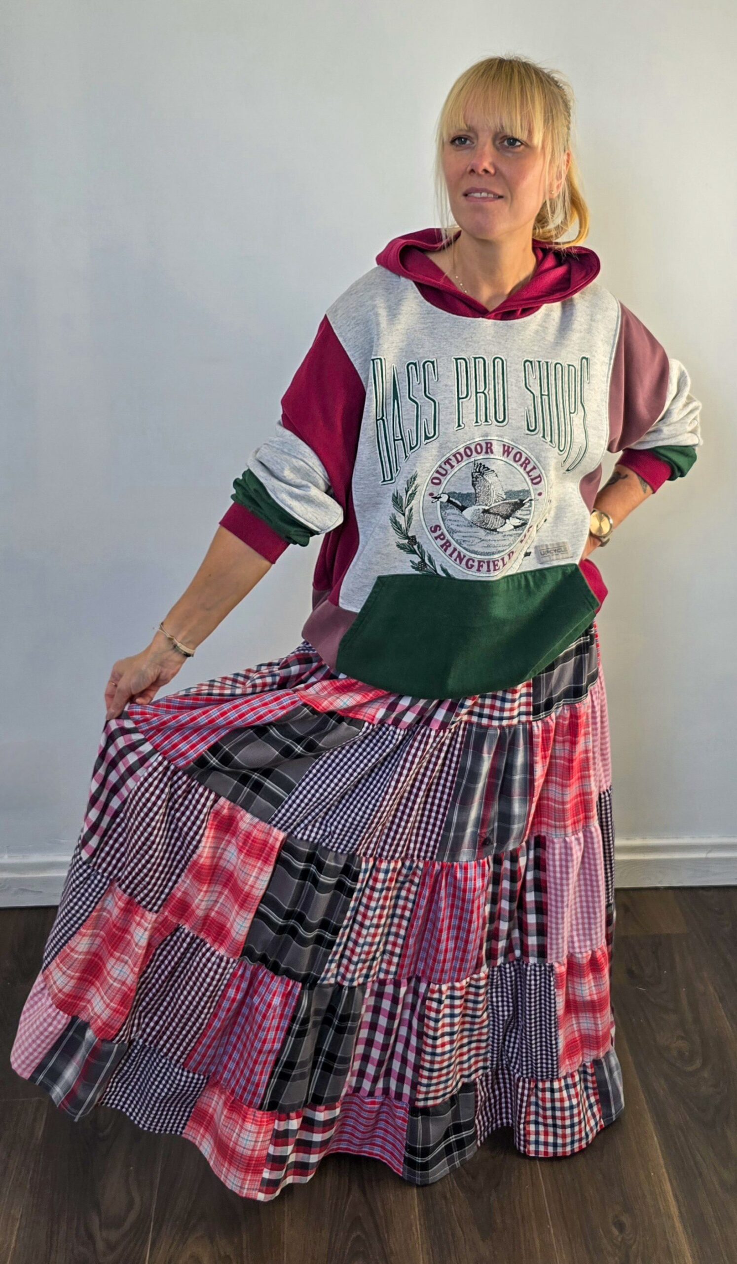 Dla tych, którzy lubią wyróżniać się w tłumie – patchworkowa spódnica, pełna energii i charakteru, uszyta z odzyskanych materiałów. Powstała z dużej ilości różnych koszul, które dostały drugie życie, a razem tworzą wyjątkową całość w stylu patchwork. Ta wyjątkowa długa spódnica pełna kolorów idealnie będzie współgrać z t-shirtem, sweterkiem, koszulą oraz buzą.