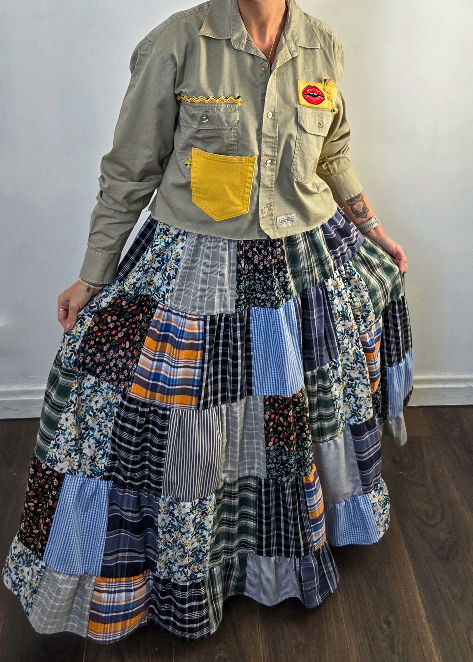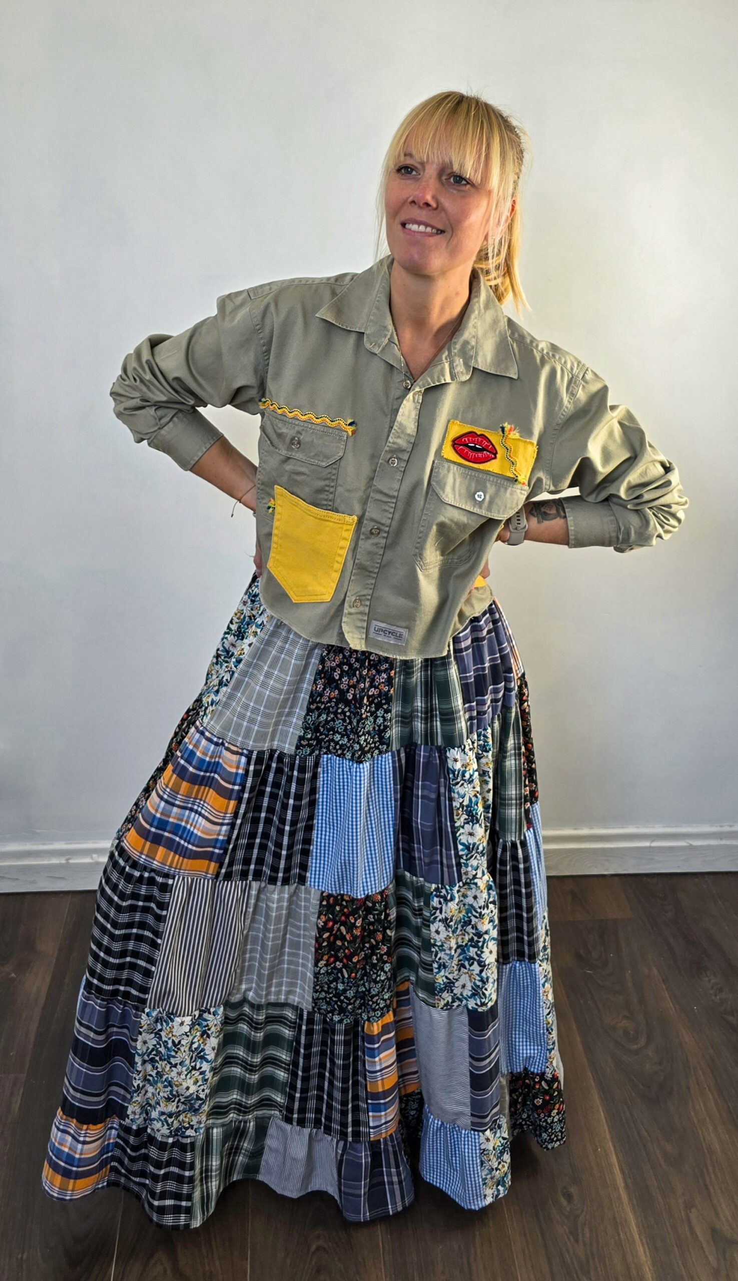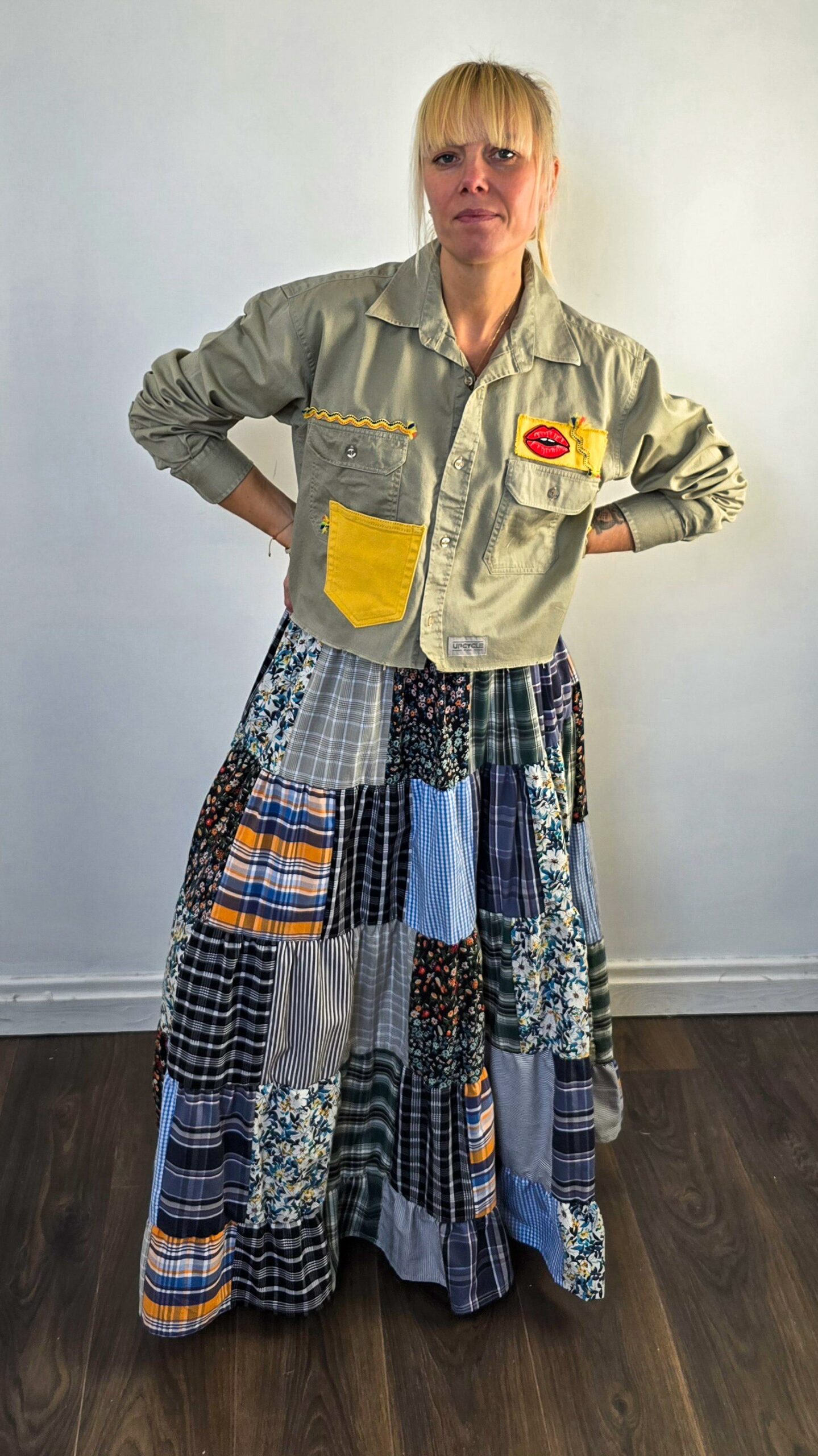 Dla tych, którzy lubią wyróżniać się w tłumie – patchworkowa spódnica, pełna energii i charakteru, uszyta z odzyskanych materiałów. Powstała z dużej ilości różnych koszul, które dostały drugie życie, a razem tworzą wyjątkową całość w stylu patchwork. Ta wyjątkowa długa spódnica pełna kolorów idealnie będzie współgrać z t-shirtem, sweterkiem, koszulą oraz buzą.