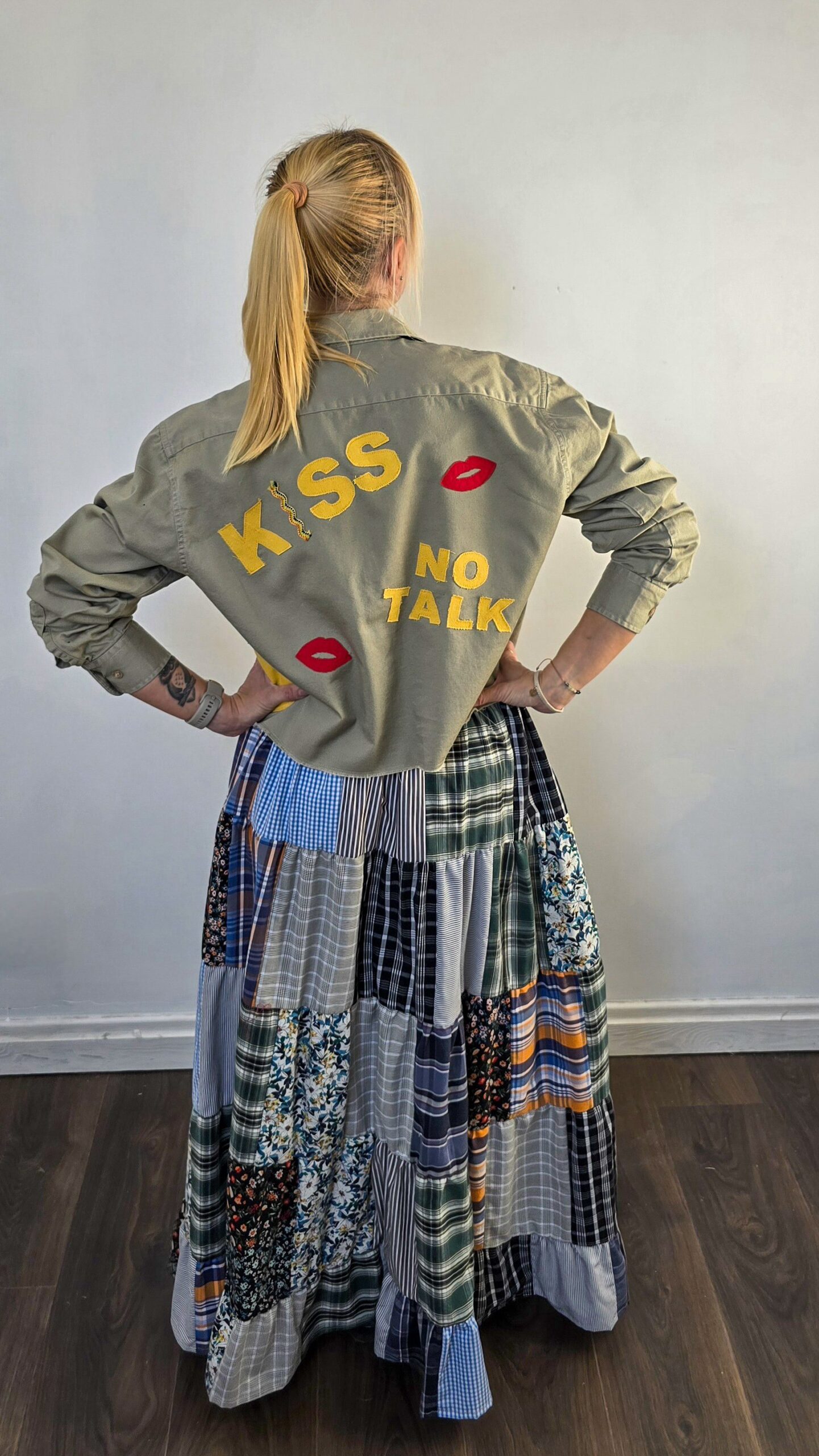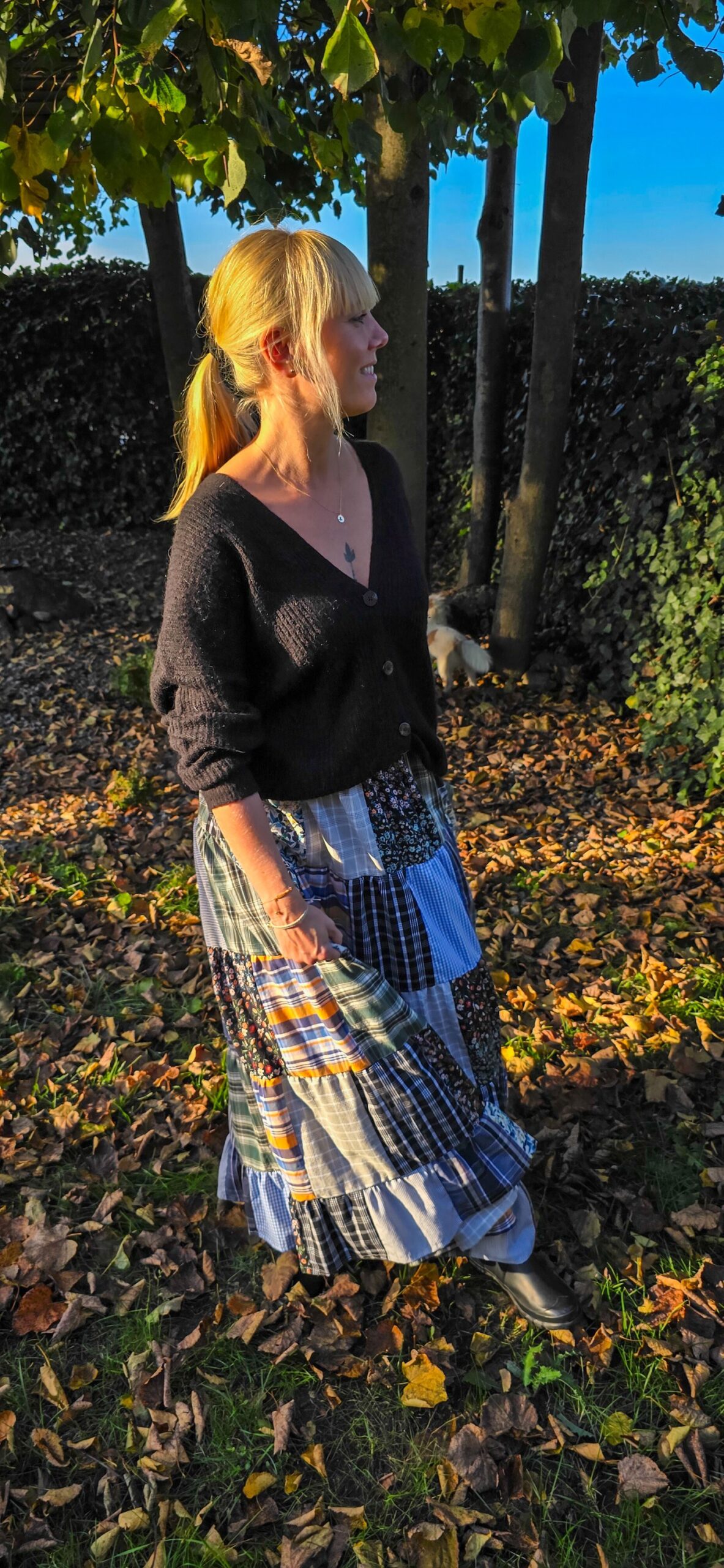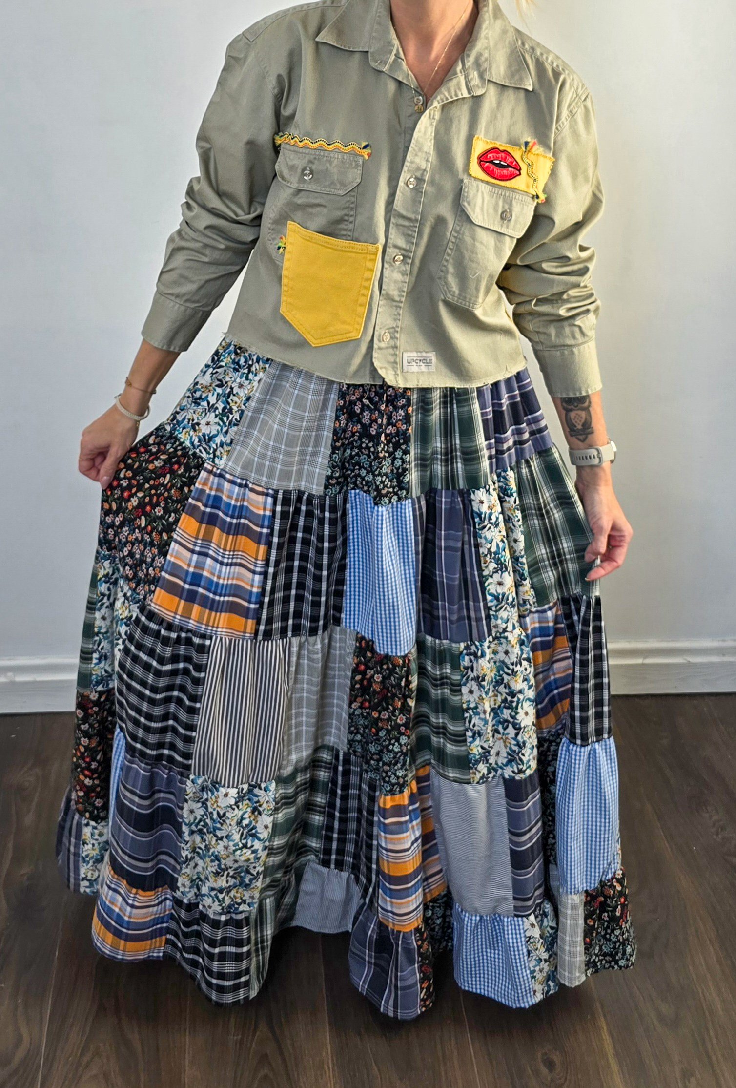 Dla tych, którzy lubią wyróżniać się w tłumie – patchworkowa spódnica, pełna energii i charakteru, uszyta z odzyskanych materiałów. Powstała z dużej ilości różnych koszul, które dostały drugie życie, a razem tworzą wyjątkową całość w stylu patchwork. Ta wyjątkowa długa spódnica pełna kolorów idealnie będzie współgrać z t-shirtem, sweterkiem, koszulą oraz buzą.