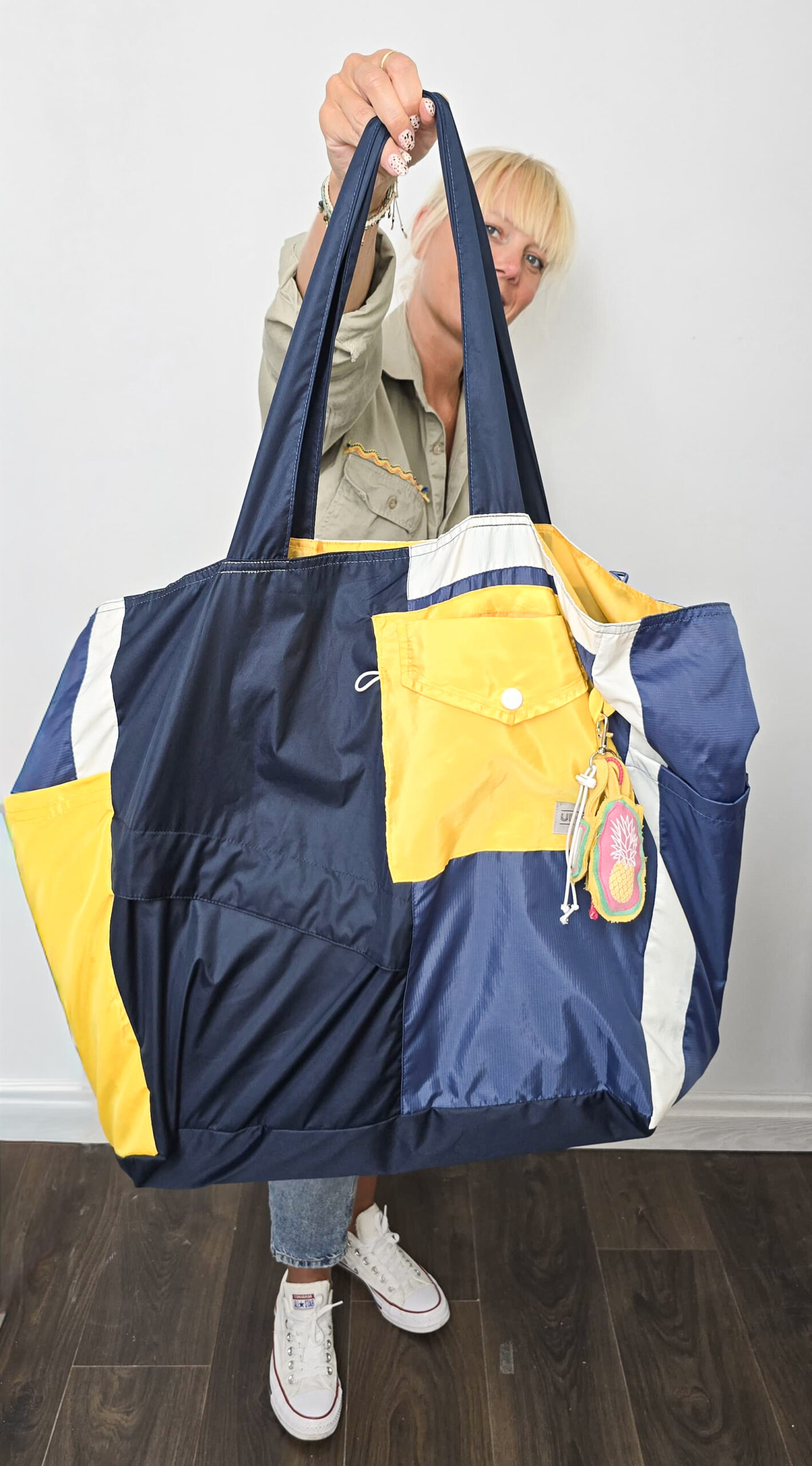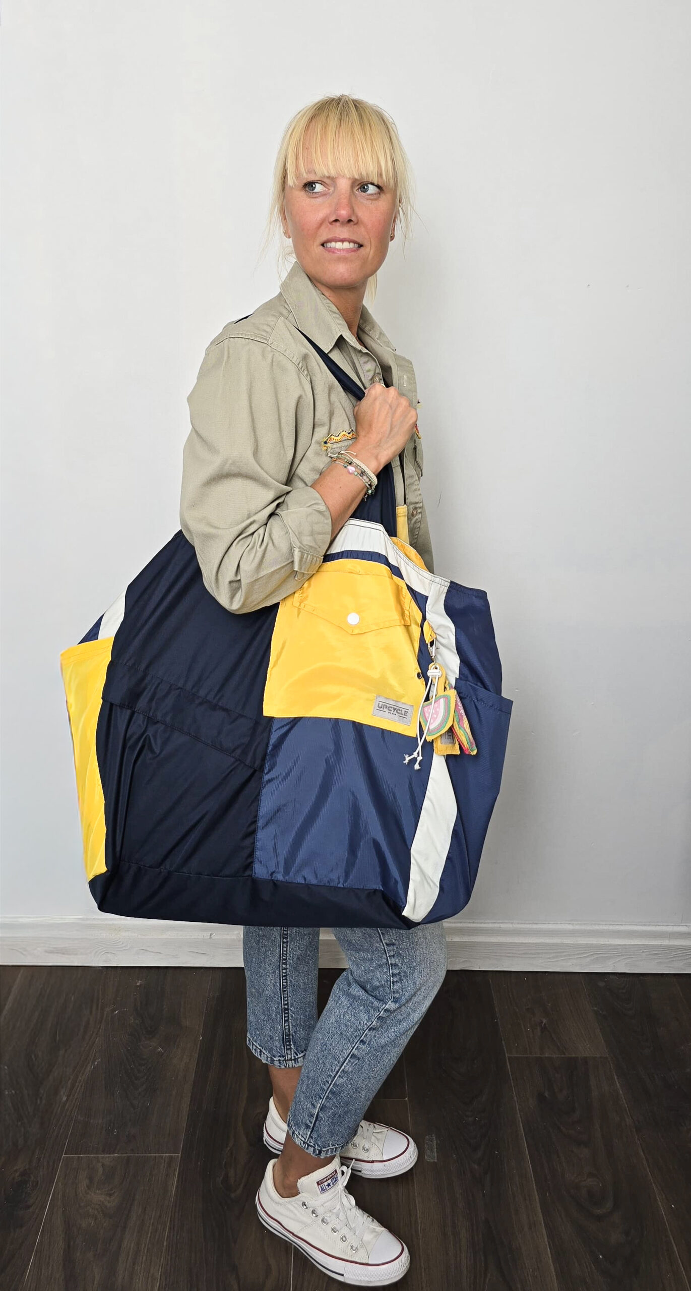 Ta torba to prawdziwy przykład siły upcyclingu. Powstała z połączenia trzech kurtek, w odcieniach niebieskiego, żółtego i złamanej bieli, nadając jej klimat torby w stylu marynarskim. Dużą zaletą takiej torby jest jej wielkość oraz ilość posiadanych kieszonek, bo jest ich aż siedem. Wyjątkowy design torby będzie uzupełnieniem codziennej stylówki.